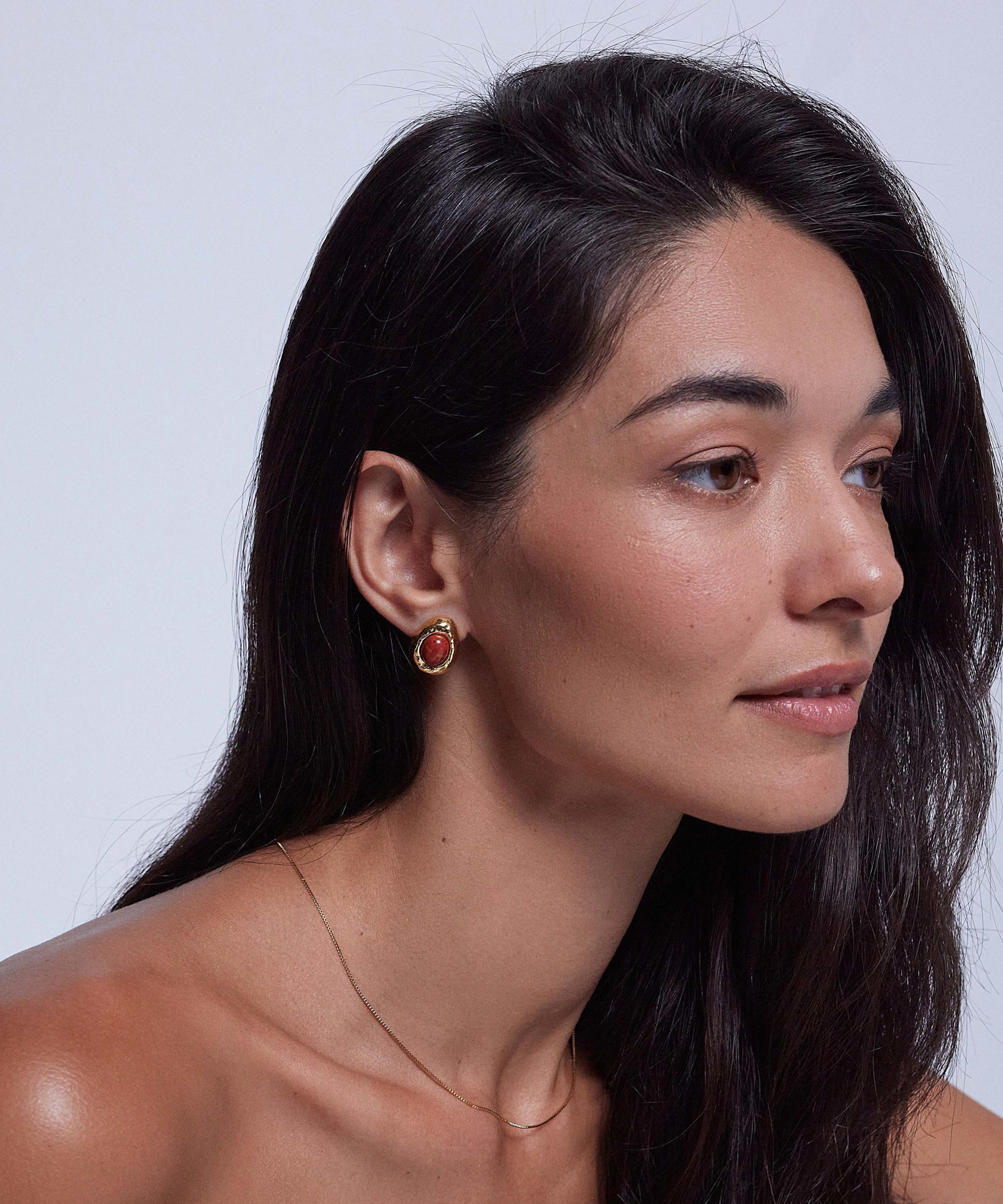 Each earring is adorned with a striking red jasper gemstone, set against a textural 18ct gold-plated brass backdrop. Embrace a boho look and wear them alone, integrate them into your curated stack for a unique take on layering or pair them with the Cherry on Top necklace from the brand’s collection.