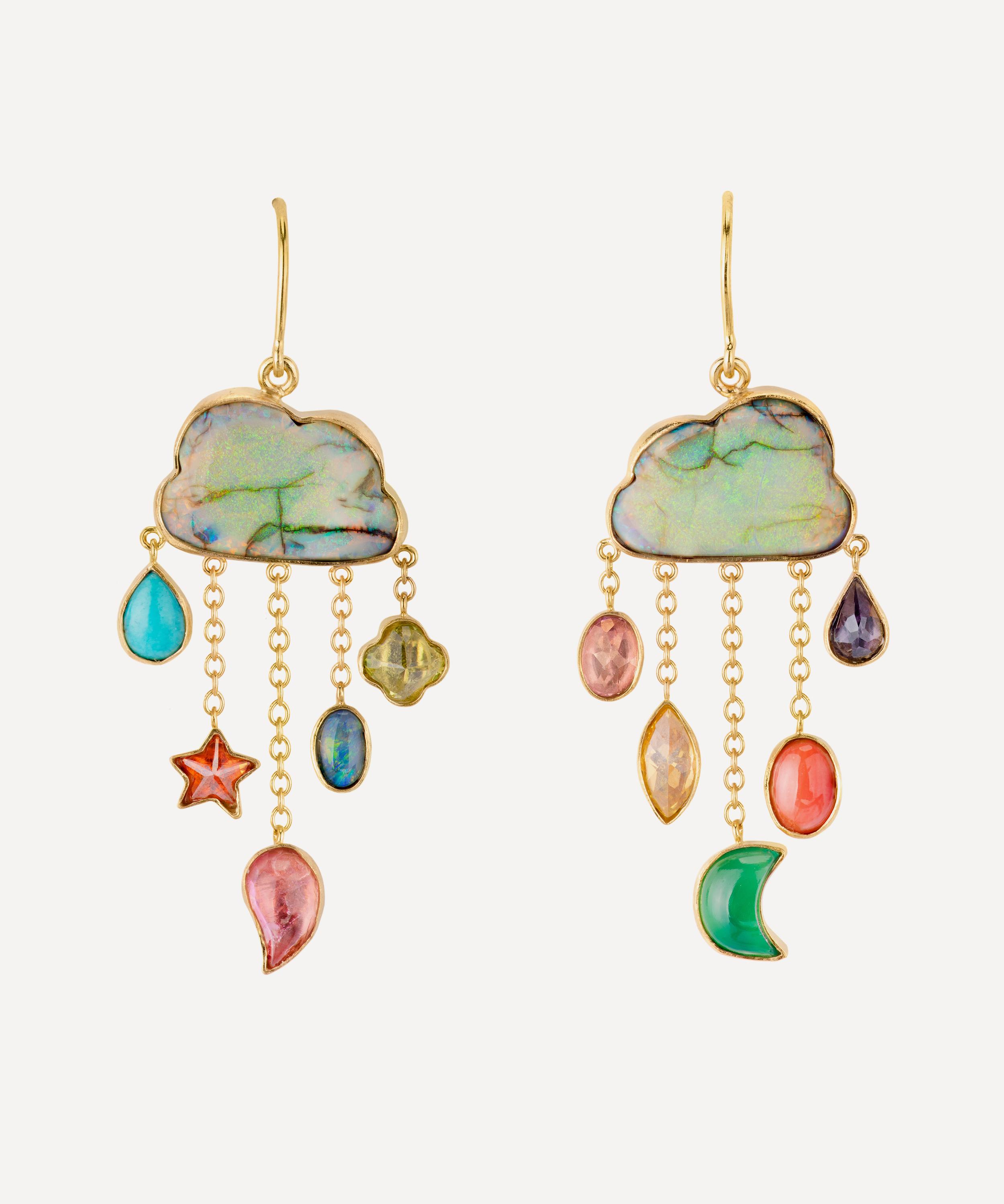 These asymmetric Cloud And Rain drop earrings offer an eclectic example of Grainne Morton's signature sculptural, chandelier-style designs. Each of these earrings feature an opal cloud with a cluster of graduating chains and mismatched, multi-coloured gems falling from the base like rain.