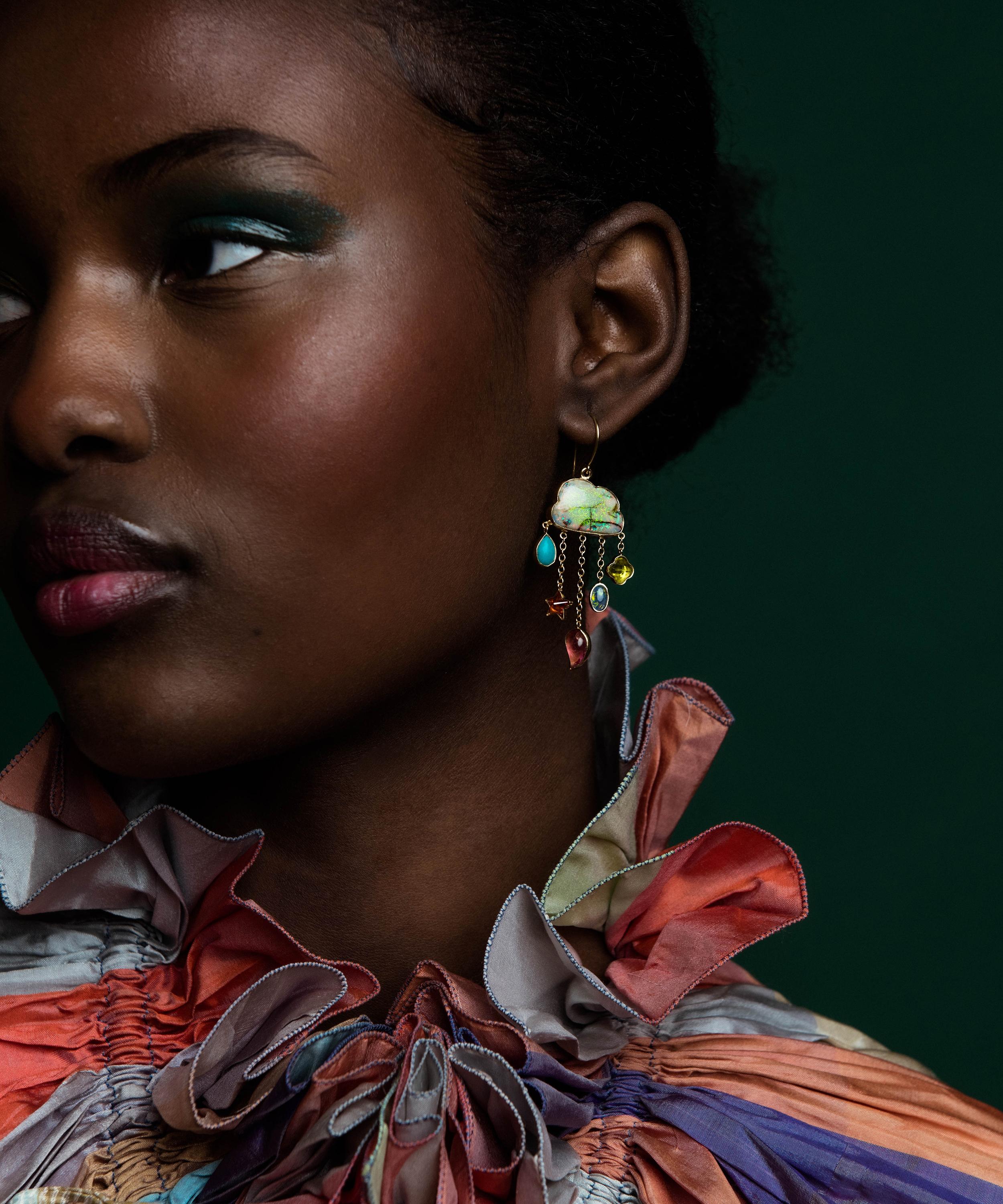 In the late 1980s, Grainne Morton left her home in Northern Ireland to study at the Edinburgh College of Art where she became an avid antique collector - a passion which eventually evolved into creating jewellery from the objects she’d accumulated. Every Grainne Morton design is formed of an eclectic assortment of found objects, coloured gems and tiny trinkets that are hand-selected and arranged by the designer into one-of-a-kind pieces. Try a pair of asymmetric chandelier earrings for an unexpected curation of charms that come together to tell their own unique story.