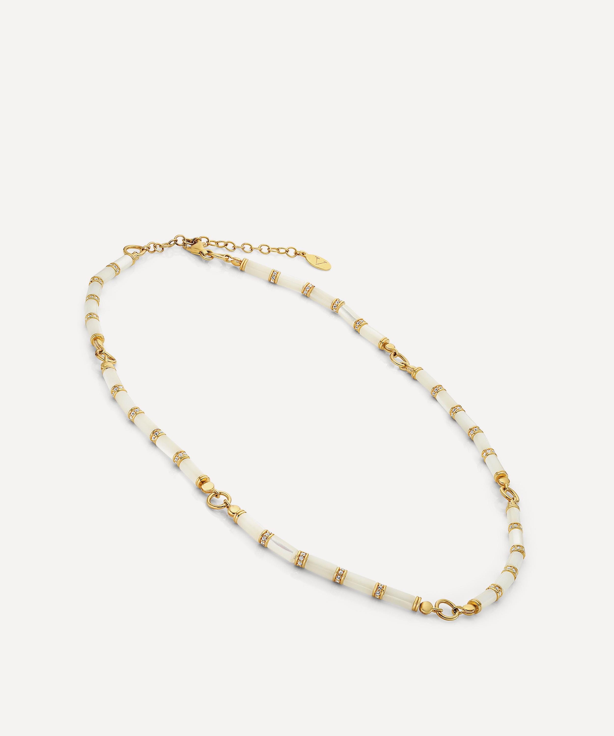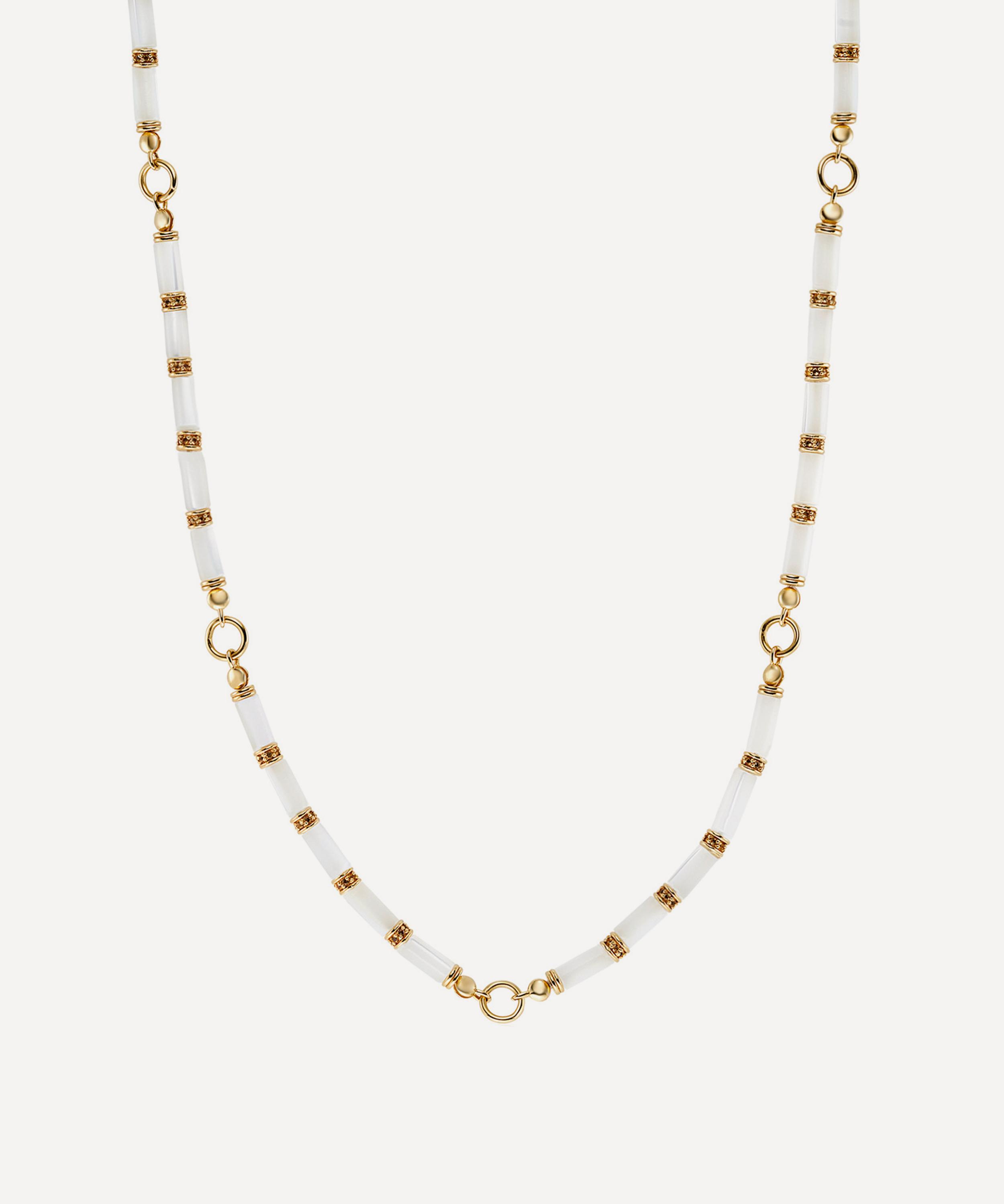 Inspired by the opulent forms and rich textures of the Art Deco era, it features clean, cylindrical lines composed of mother of pearl column beads, contrasted by white topaz and ring links in 18ct gold-plated silver. Each stone is one-of-a-kind, demonstrating pearly hues with subtle irridescent undertones to add depth and character, ensuring no necklace is exactly the same. Wear it on its own or layer it with pendant necklaces and chains.