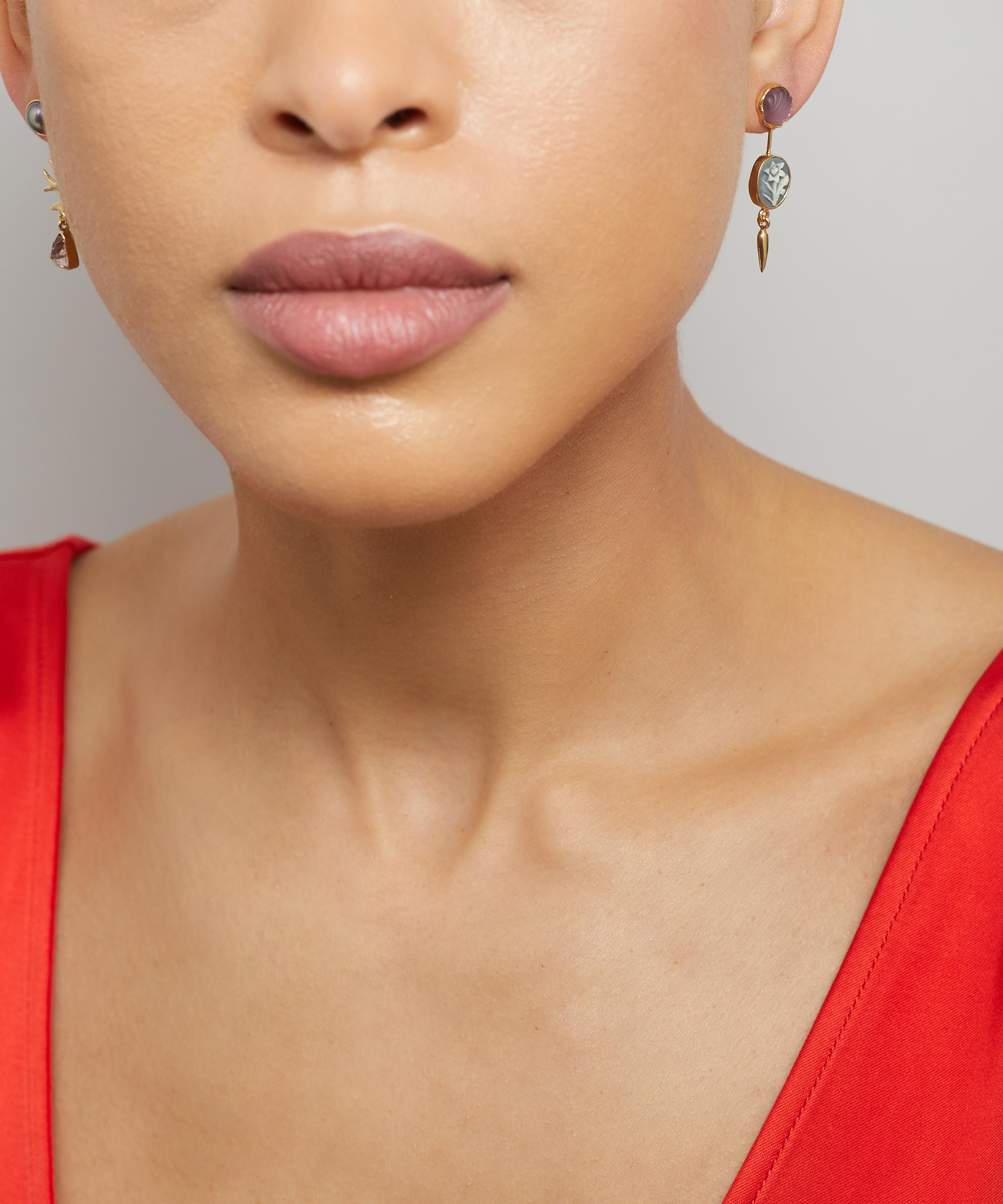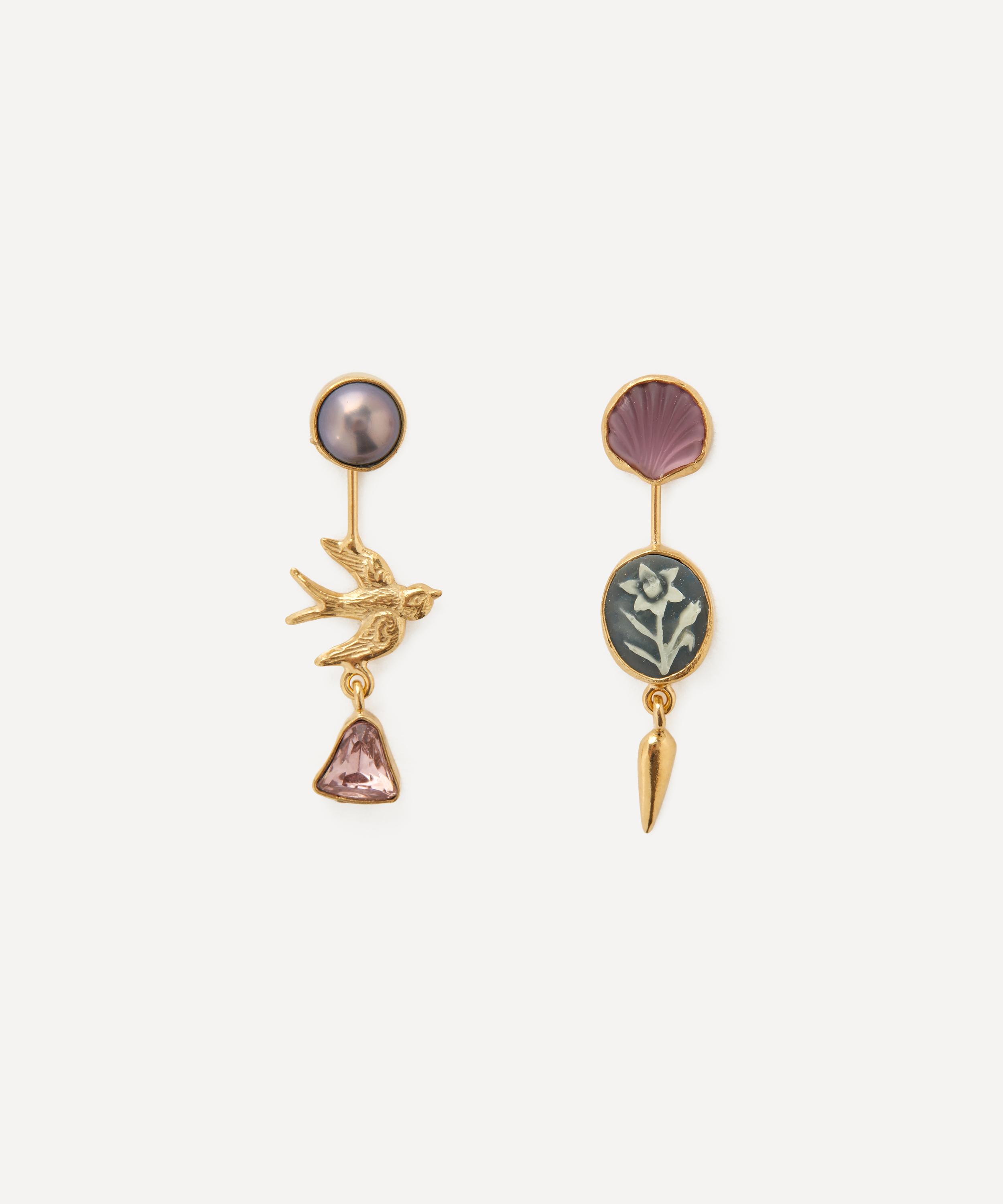 Handmade in Edinburgh from 18ct gold-plated silver, each earring is characterised by a vibrant assortment of mismatched charms, including cameo, pearl and vintage glass. They can be worn as they are, or as simple studs by detaching the drop - perfect for adding visual interest to everyday looks.