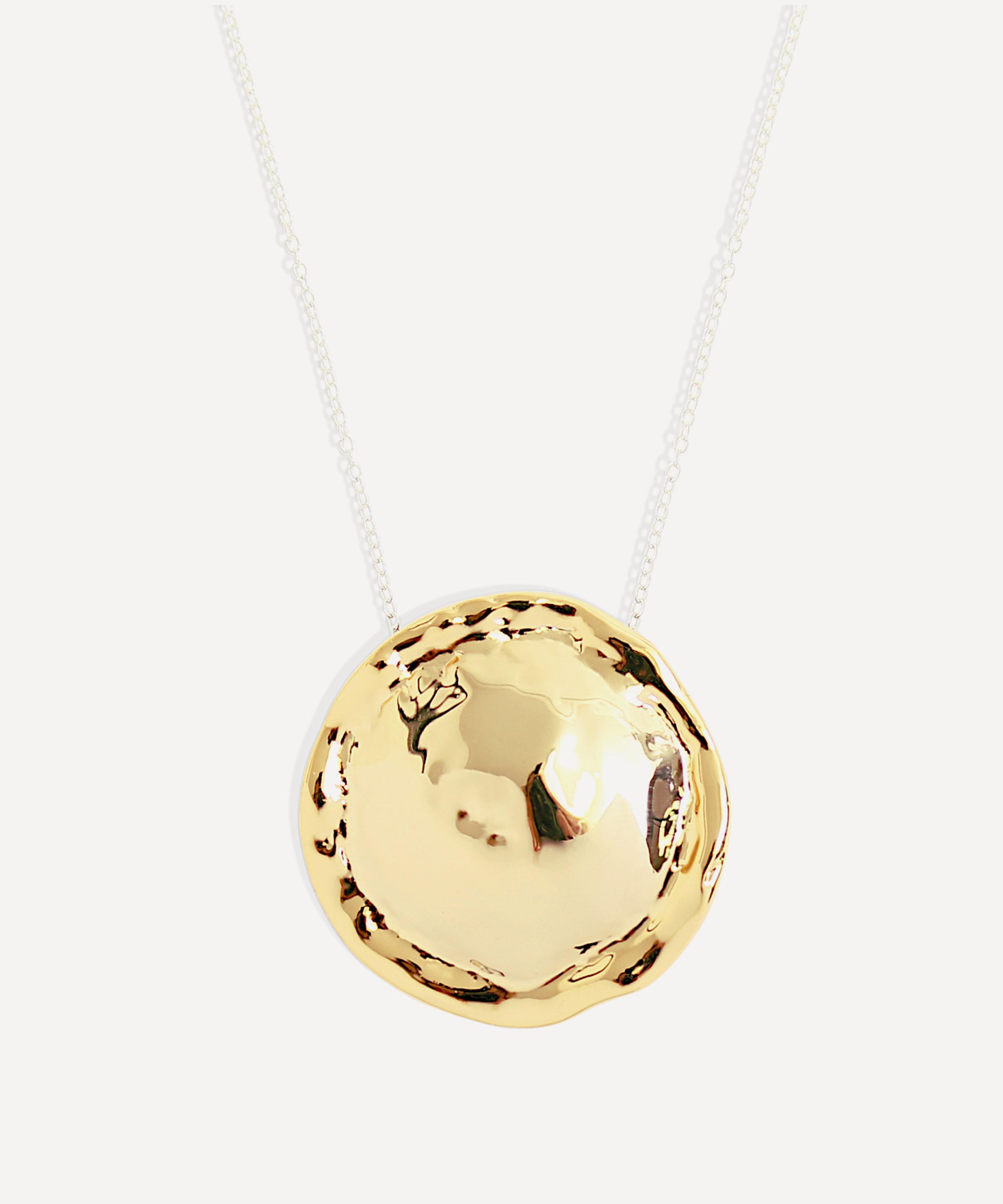 Thoughtfully crafted in London from 18ct gold-plated brass, this distinctive and enduring heirloom features a round, hammered pendant strung on a sterling silver chain – offering a timeless yet modern aesthetic with vintage sensibilities. Whether worn as a personal talisman or a statement of confidence, it invites you to embrace your identity with elegance and intention. Style it with the matching Dune Earrings for a co-ordinating look, or pair it with other pieces from the brand.