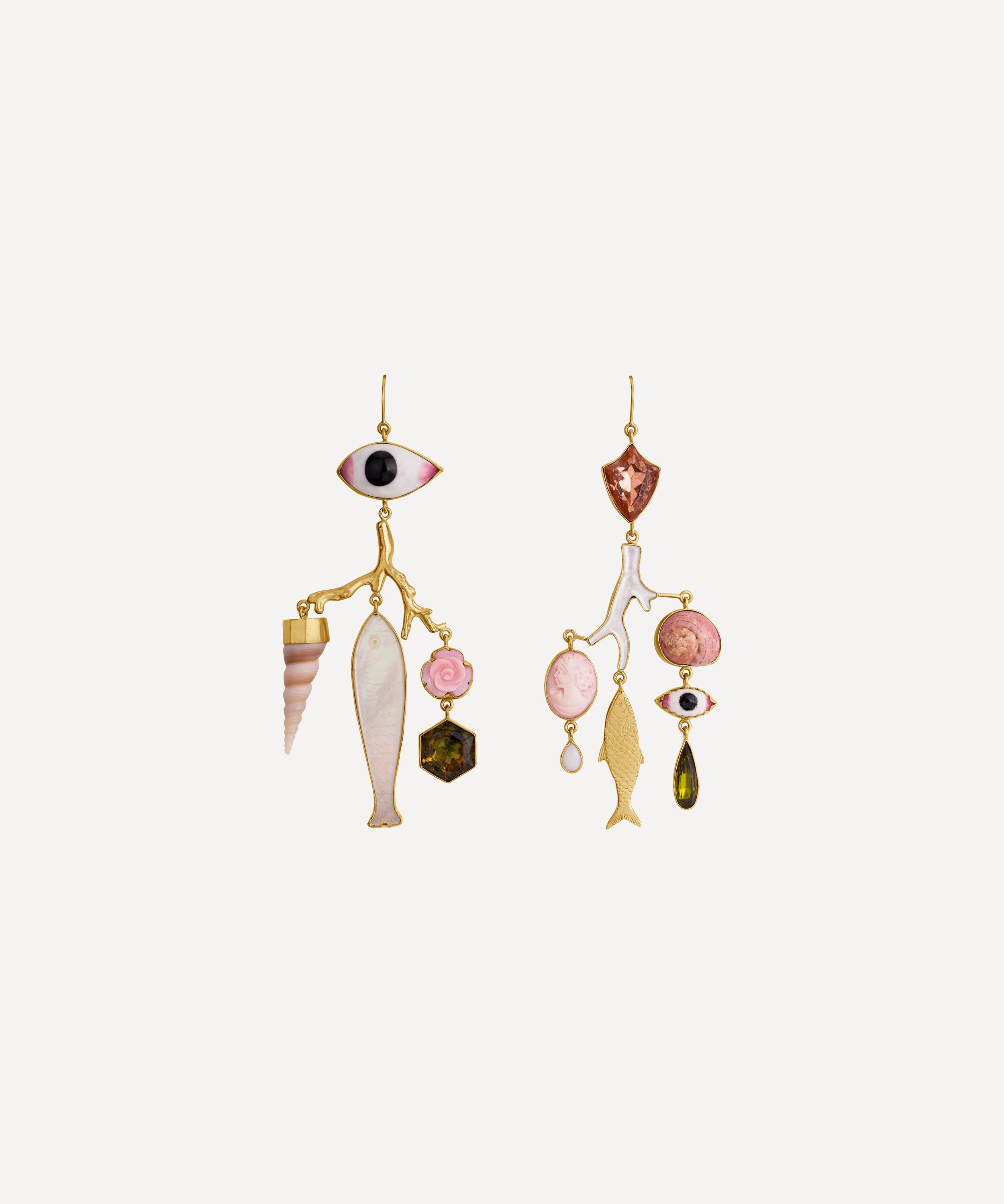 Handmade in Edinburgh from 18ct gold-plated silver, each earring features a chandelier-style design composed of a dropped branch-shaped bar falling from a sparkling rhinestone and enamel eye, and decorated with a curation of assorted charms. Finished with a classic hook fastening, they boast an unexpected juxtaposition of vintage and contemporary styles – perfect for adding visual interest to everyday looks.