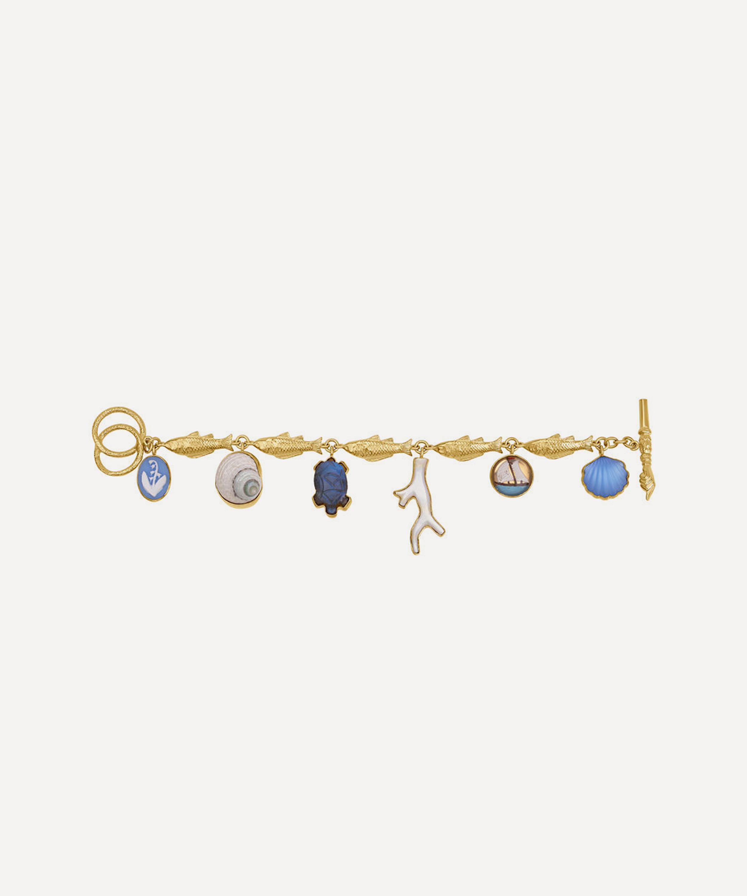 Handmade in Edinburgh from 18ct gold-plated silver, this wonderfully eclectic bracelet features playful fish links, punctuated with six nautical-themed mini charms, including mother of pearl, shell-shapes and vintage glass. Finished with a decorative toggle clasp, it boasts an unexpected juxtaposition of vintage and contemporary styles – perfect for adding visual interest to everyday looks.