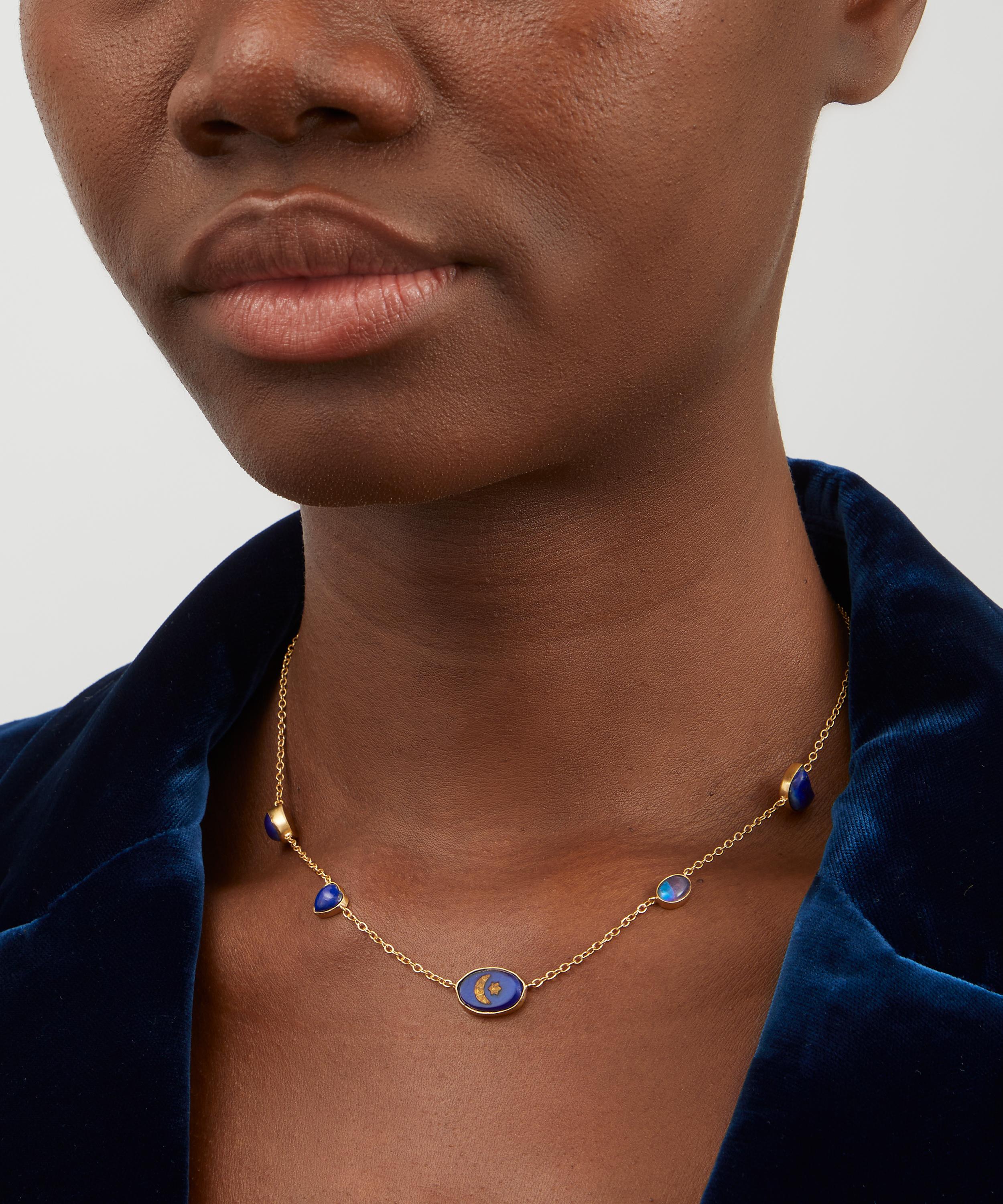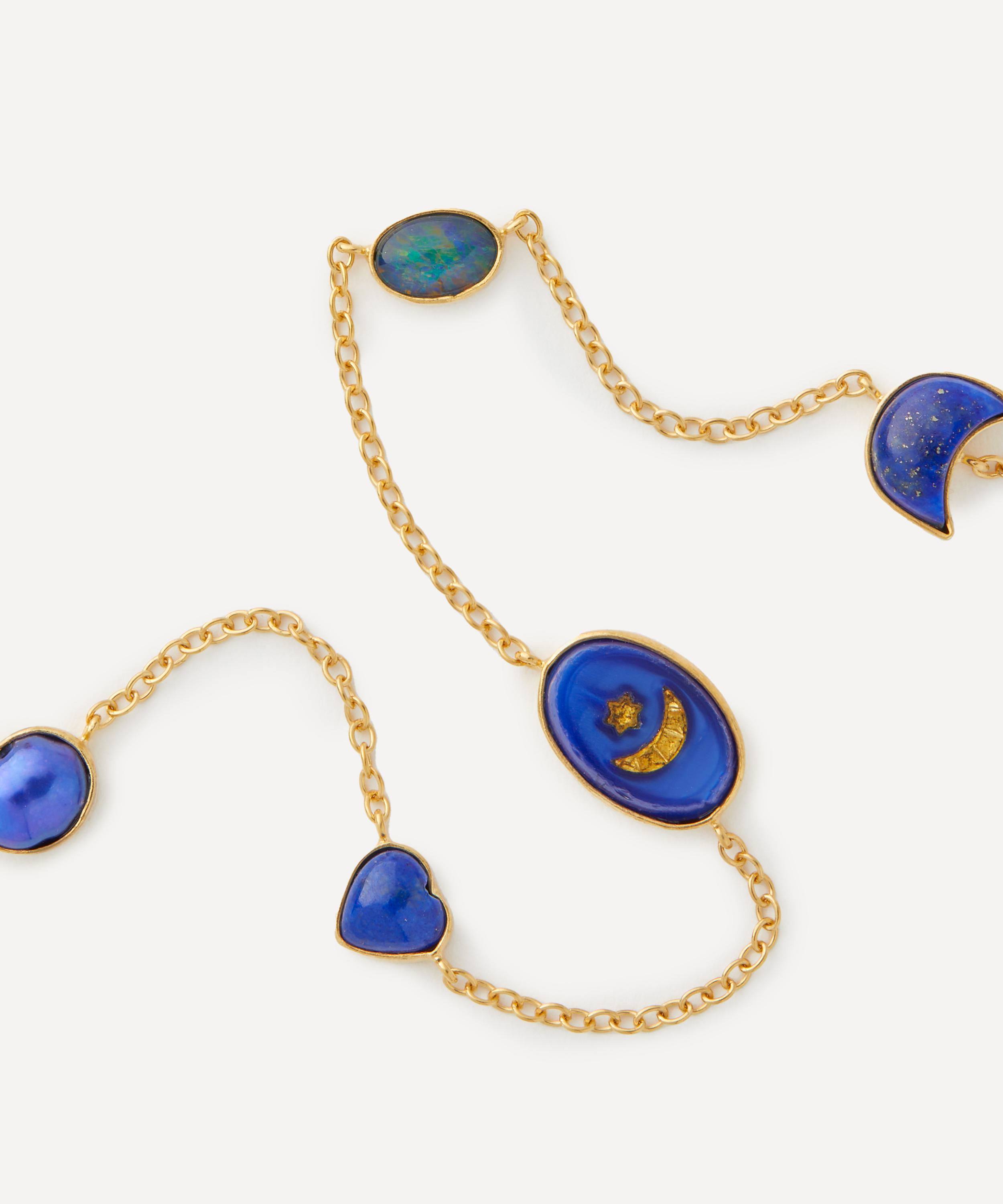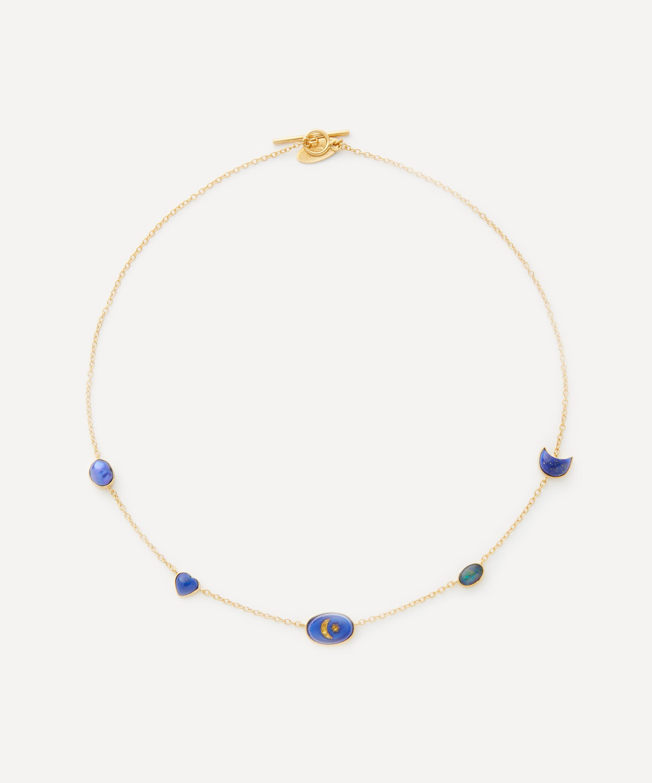 A signature style from Grainne Morton, this necklace offers a whimsical, dreamy addition to your daily line-up. Handmade in Edinburgh from 18ct gold-plated silver, it features a fine cable chain adorned with five assorted gemstone charms. Finished with a T-bar toggle clasp, it boasts an unexpected juxtaposition of vintage and contemporary styles - perfect for adding visual interest to everyday looks.