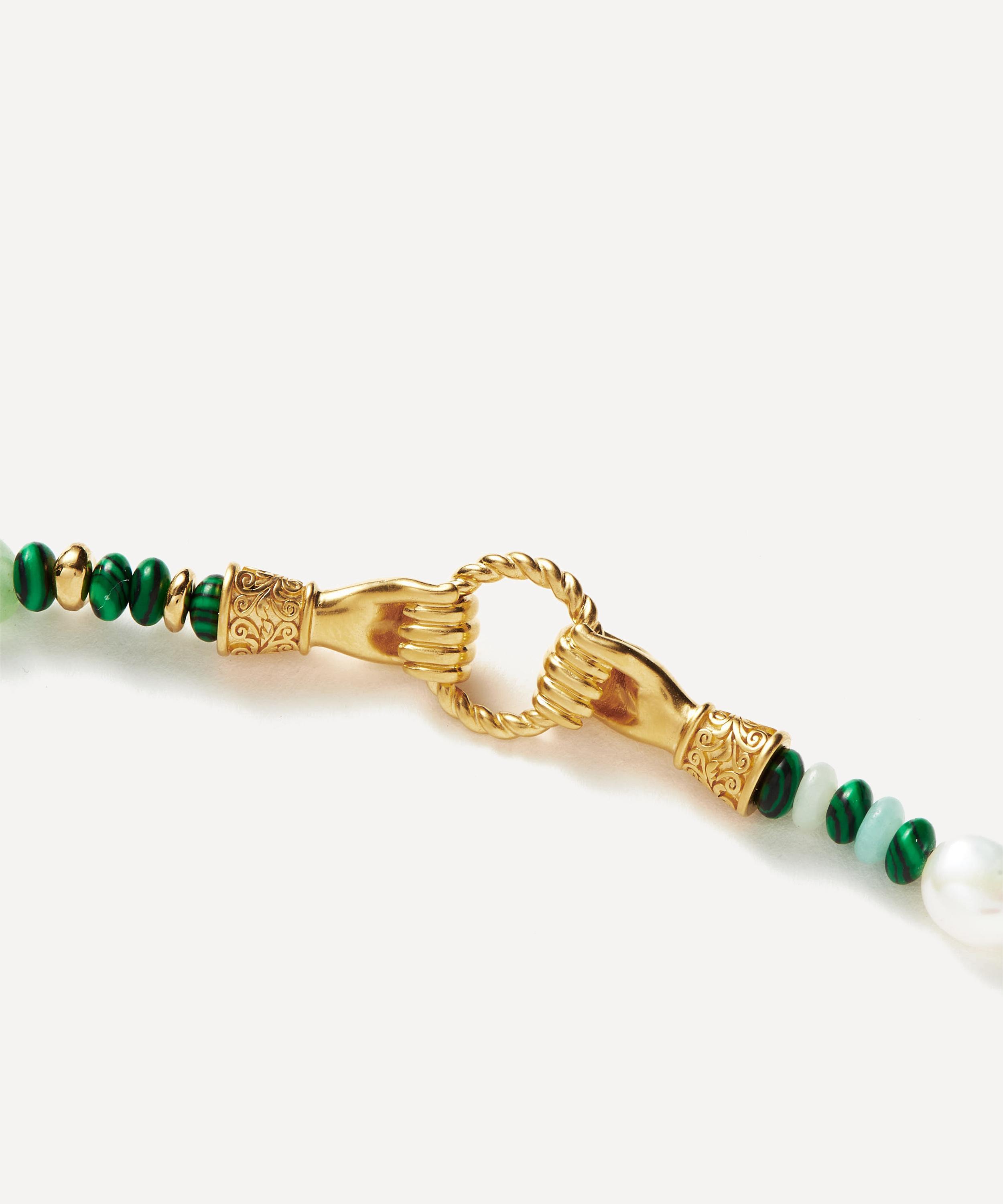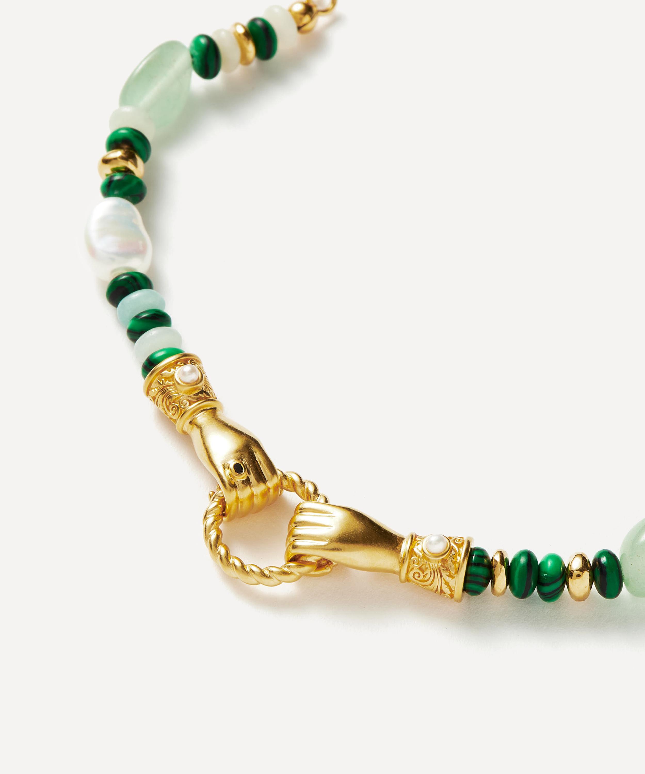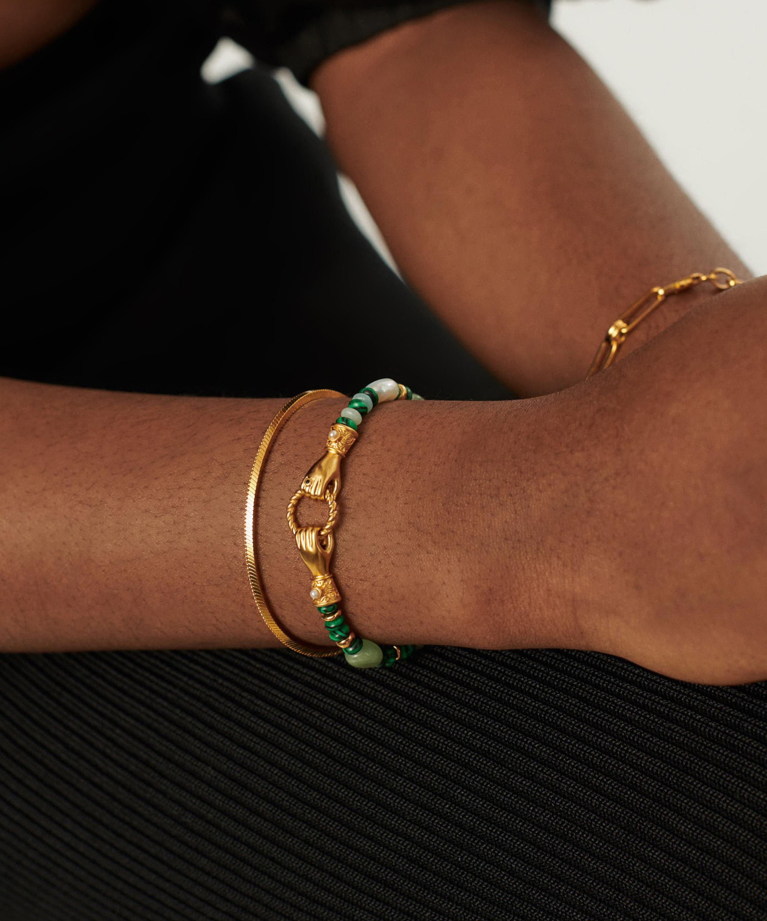Embrace your individuality with the In Good Hands beaded gemstone bracelet from the Harris Reed x Missoma collaboration collection. Crafted from 18ct gold-plated brass, it features an opulent string of white pearls and beaded gemstones, accented by two Georgian-inspired hands, each holding a twisted ring and detailed with a cabochon pearl set cuff. Wear it alone or with other edgy bracelets for a curation that speaks to your unique sense of style.