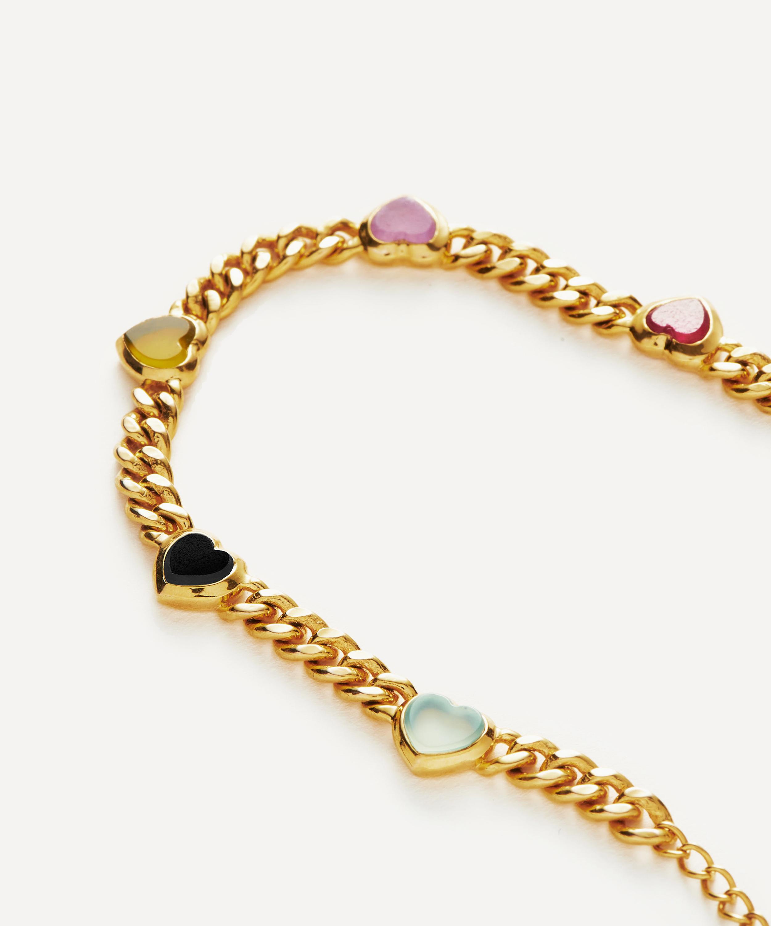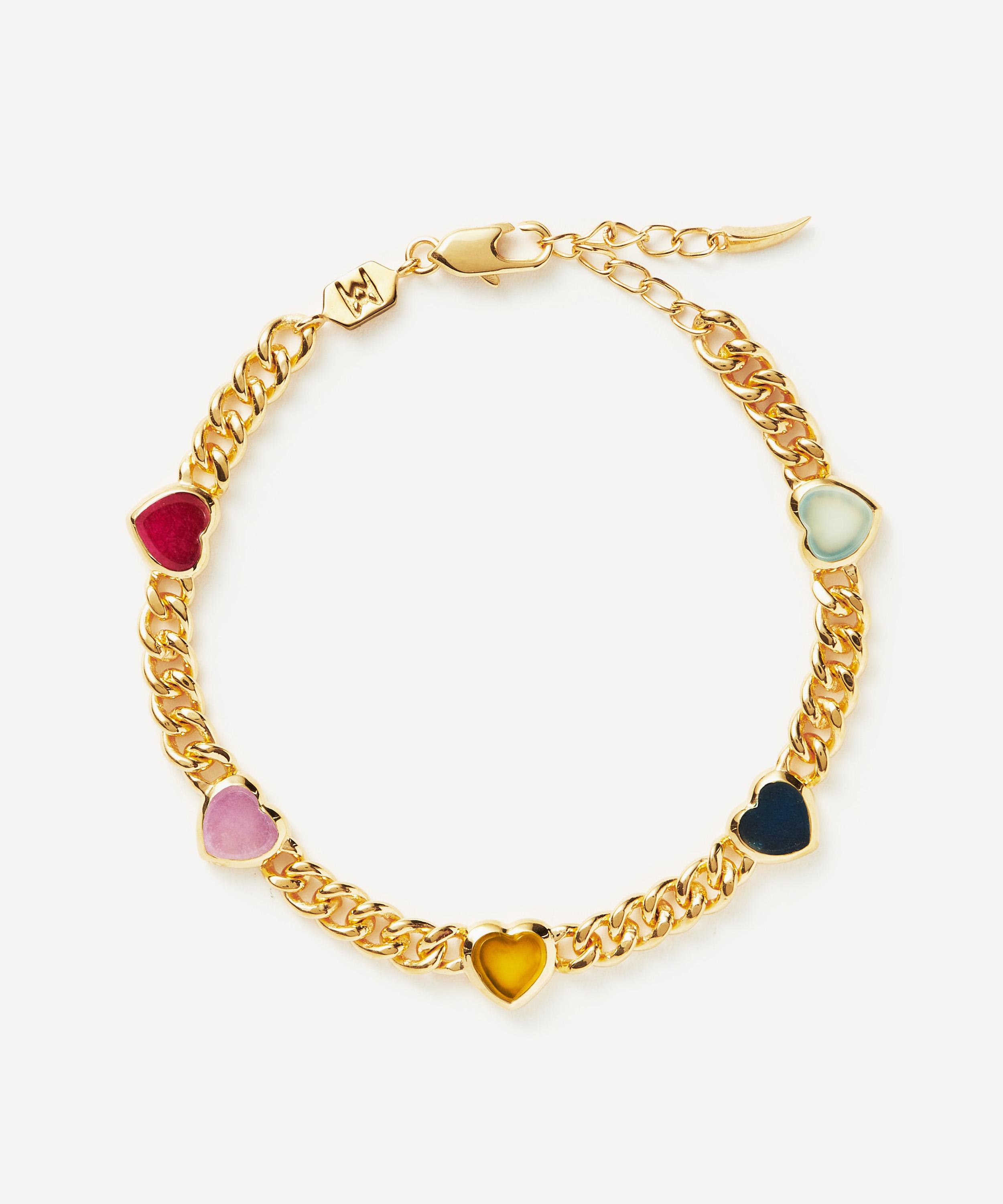 Perfect for layering, this retro-inspired charm bracelet from Missoma will instantly elevate your wrist stack with its colourful hue. Crafted from 18ct gold-plated brass, this bracelet features a thick curb chain, adorned with five jelly heart charms, inlaid with semi-precious gemstones in a vibrant assortment of colours. Complete with a classic lobster clasp, stack it with other chains, wear it solo, or team it with the matching necklace.