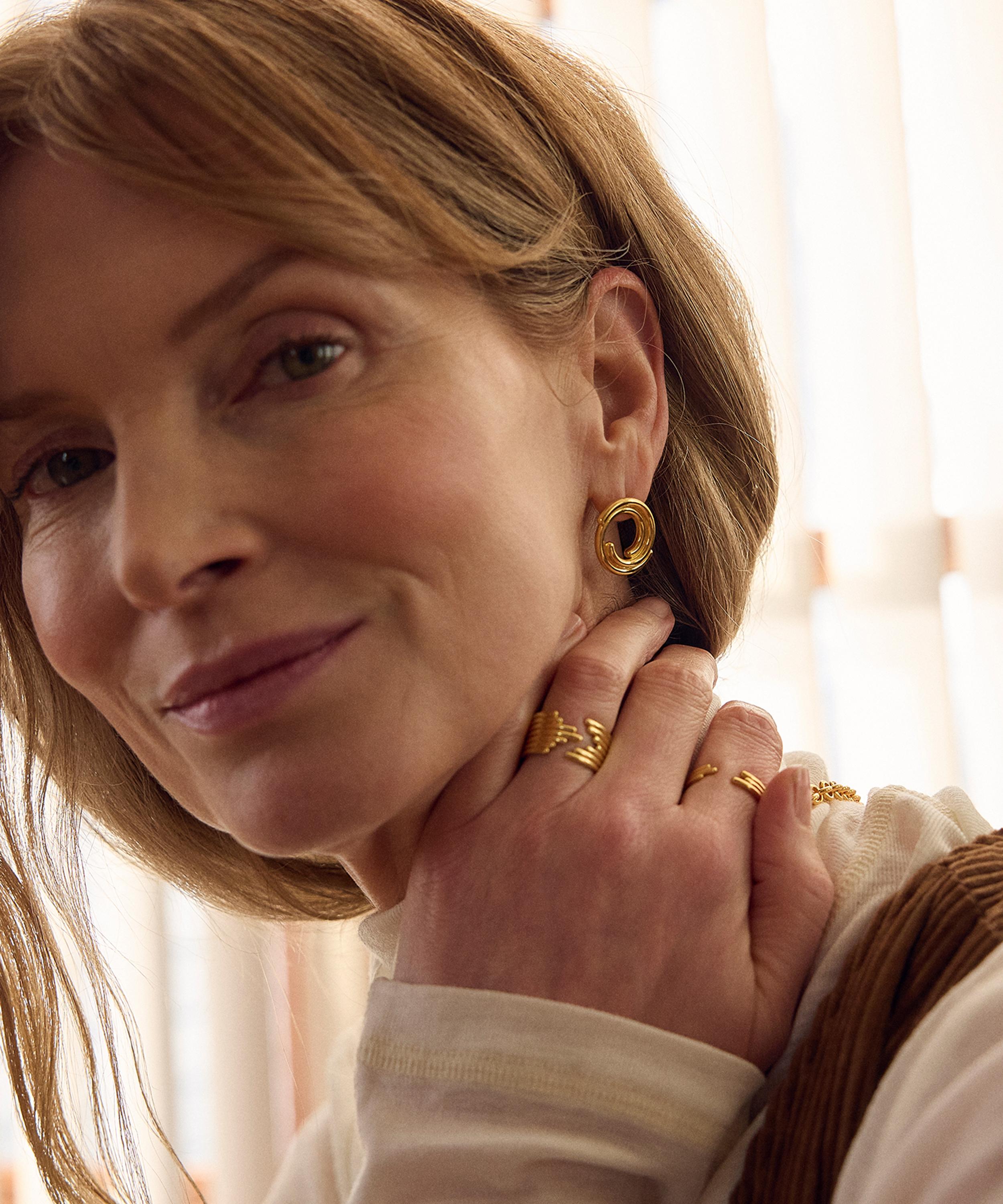 Created to honour the journey of being a woman, it’s expertly handcrafted from 18ct gold-plated silver, featuring a luxuriously contoured silhouette inspired by French sculptor Bernar Venet, embellished with Art-Deco-inspired curves – a representation of the many facets of womanhood. Style yours solo, add it to a curated stack or team with matching pieces from the collection for a co-ordinating look.