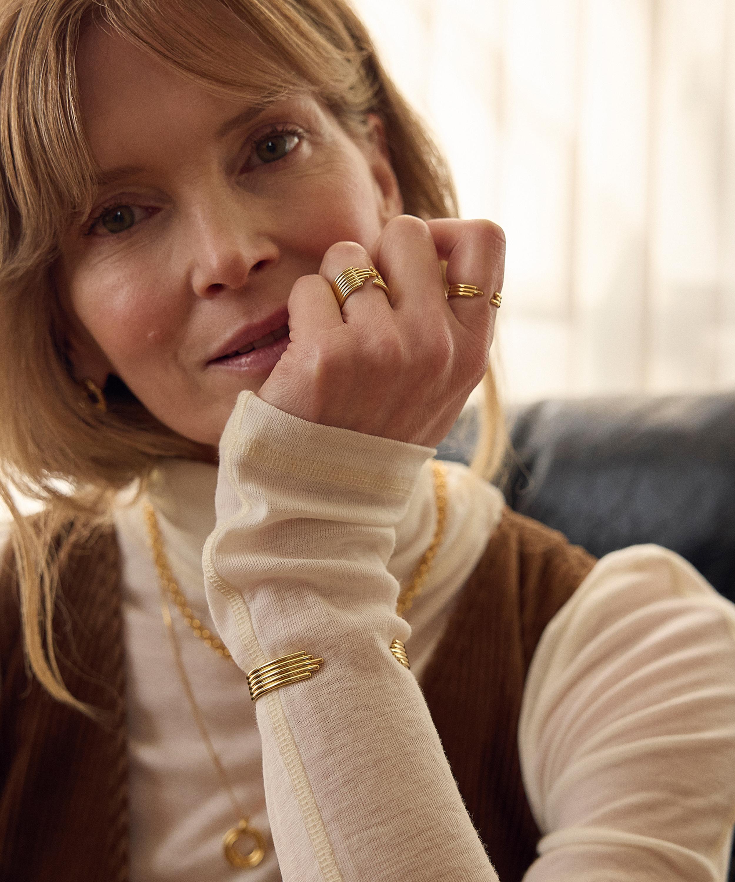 Created to honour the journey of being a woman, it’s expertly handcrafted from 18ct gold-plated silver, inspired by French sculptor Bernar Venet and features Art Deco-inspired curves - a representation of the many facets of womanhood. Style yours solo, add it to a curated stack or team with matching pieces from the collection for a co-ordinating look.
