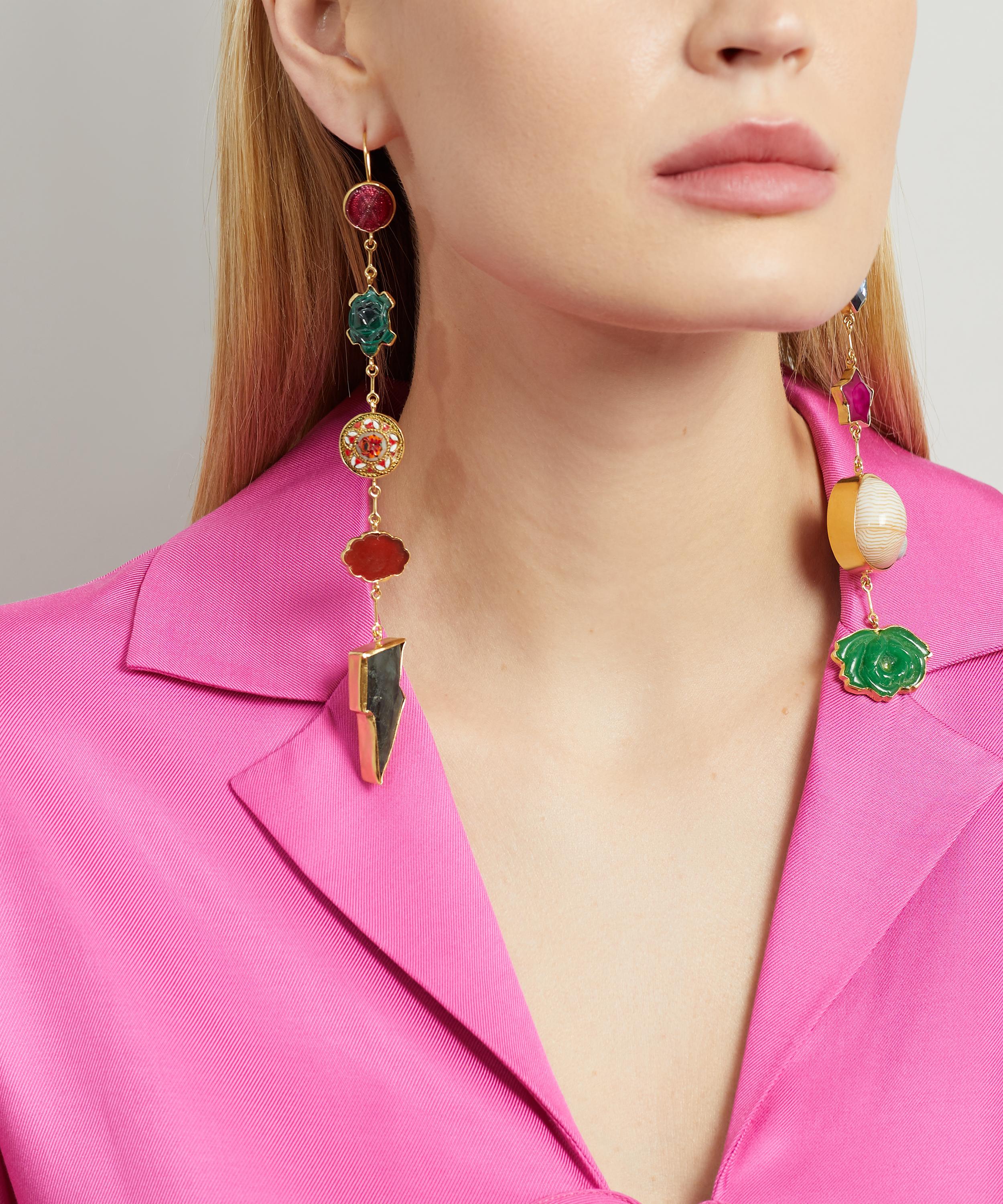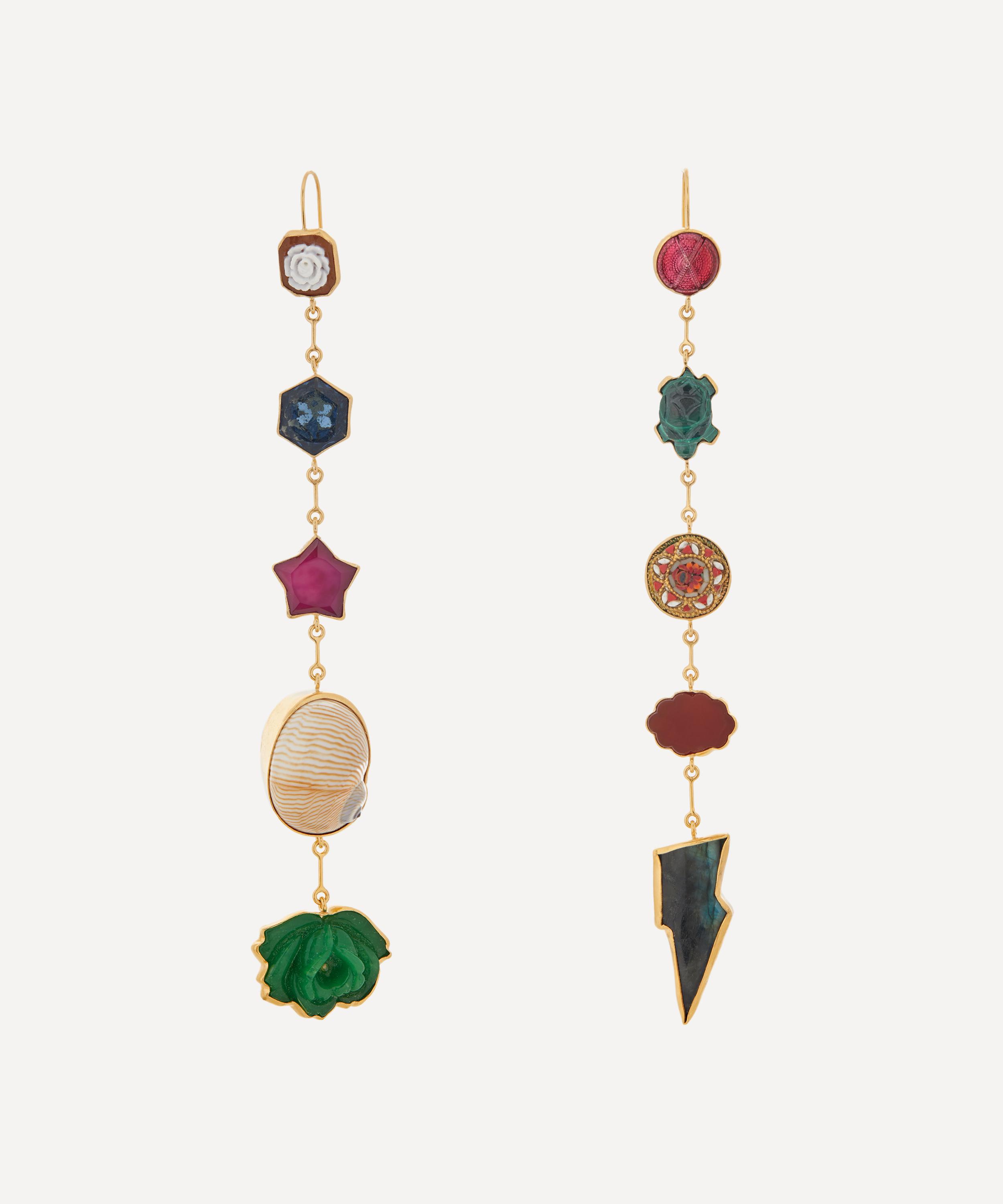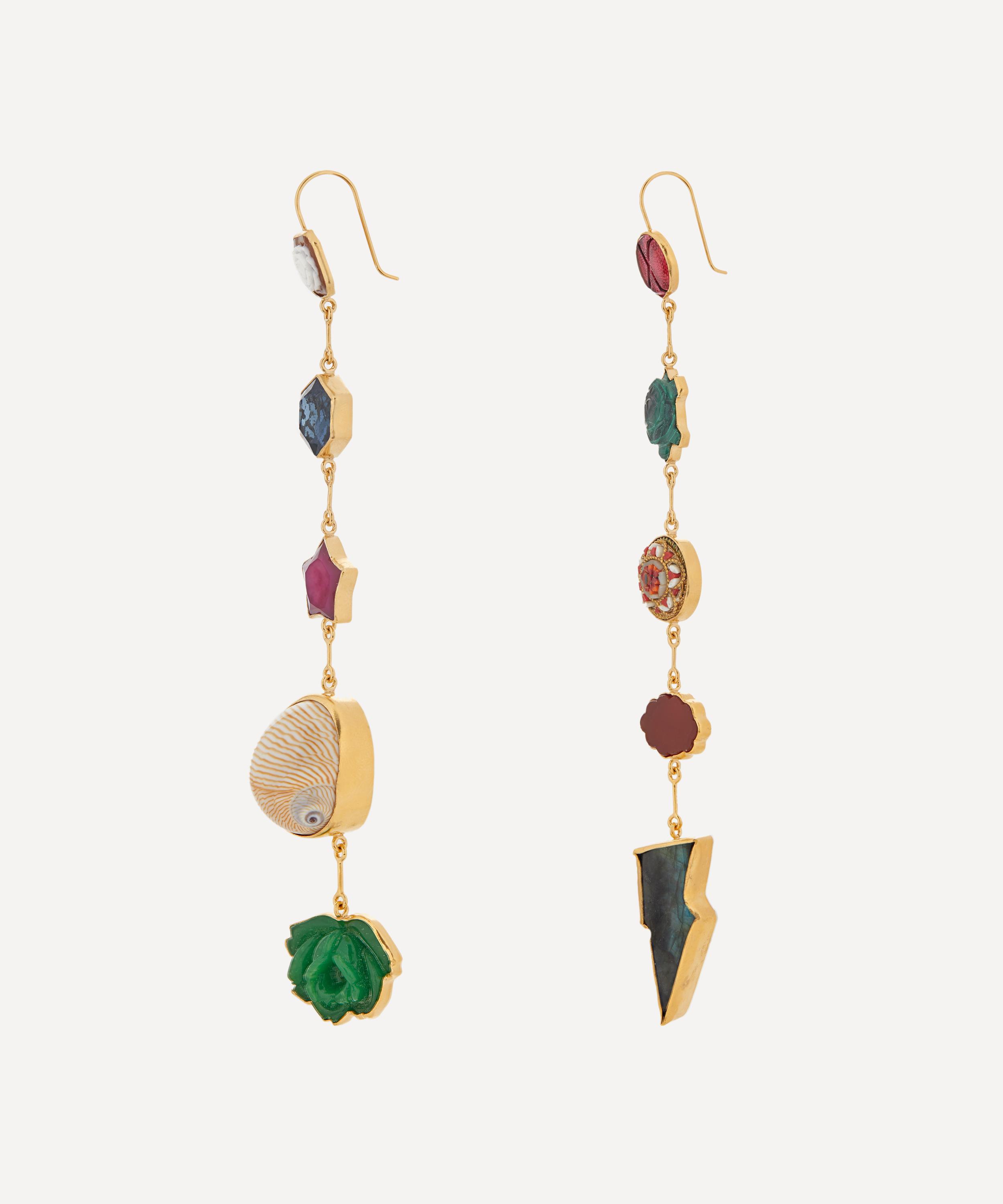 In the late 1980s, Grainne Morton left her home in Northern Ireland to study at the Edinburgh College of Art where she became an avid antique collector - a passion which eventually evolved into creating jewellery from the objects she’d accumulated. Every Grainne Morton design is formed of an eclectic assortment of found objects, coloured gems and tiny trinkets that are hand-selected and arranged by the designer into one-of-a-kind pieces. Try a pair of asymmetric chandelier earrings for an unexpected curation of charms that come together to tell their own unique story.