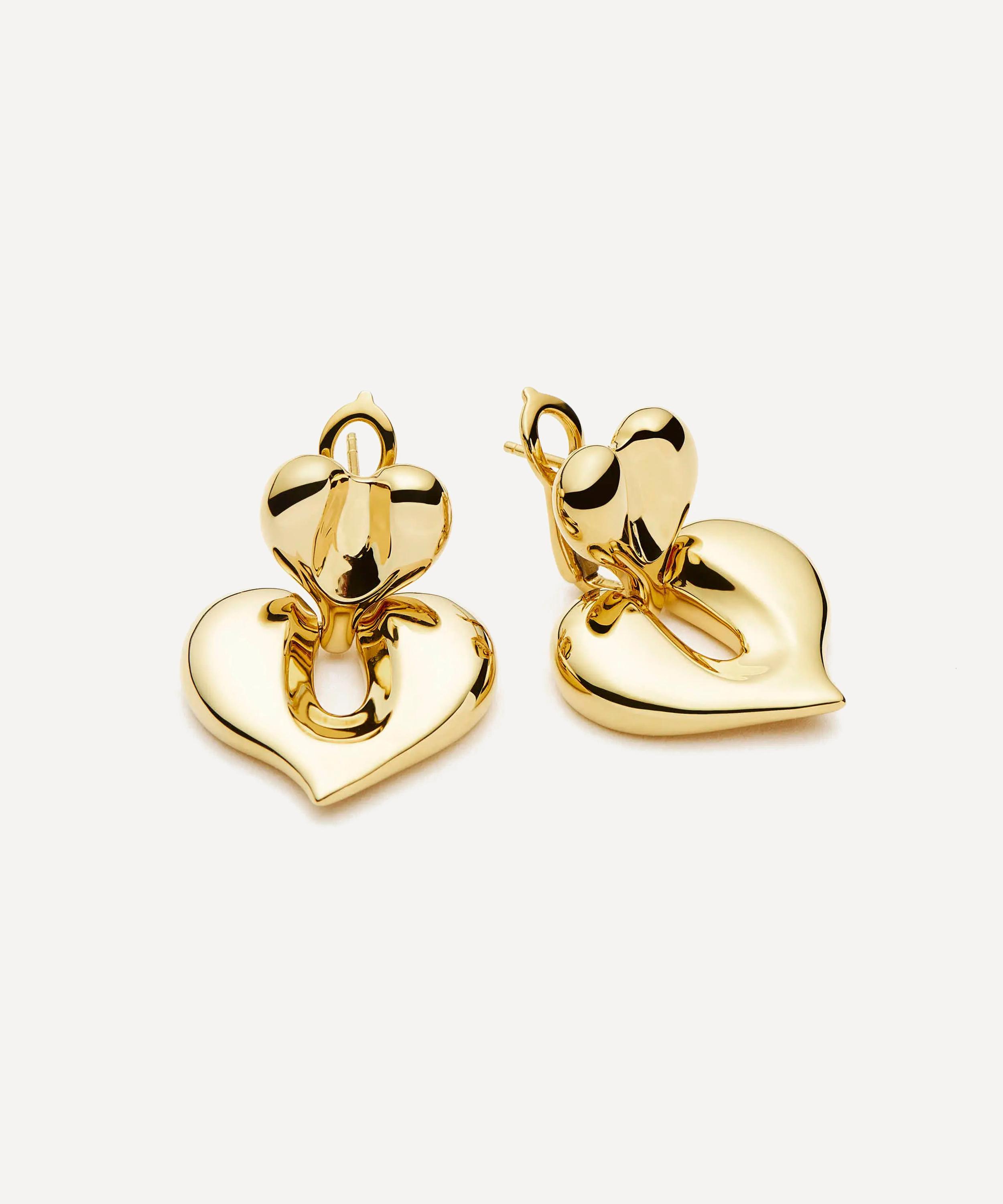 Crafted from 18ct gold-plated brass, and featuring a fluid silhouette, these earrings are adorned with a sculptural stud heart and a signature molten-inspired drop heart, exuding sensuality and glamour in its delicate design. Whether you wish to lean into maximalist layering with a unique ear stack, or elevated minimalism, they will be a stunning addition to your collection.