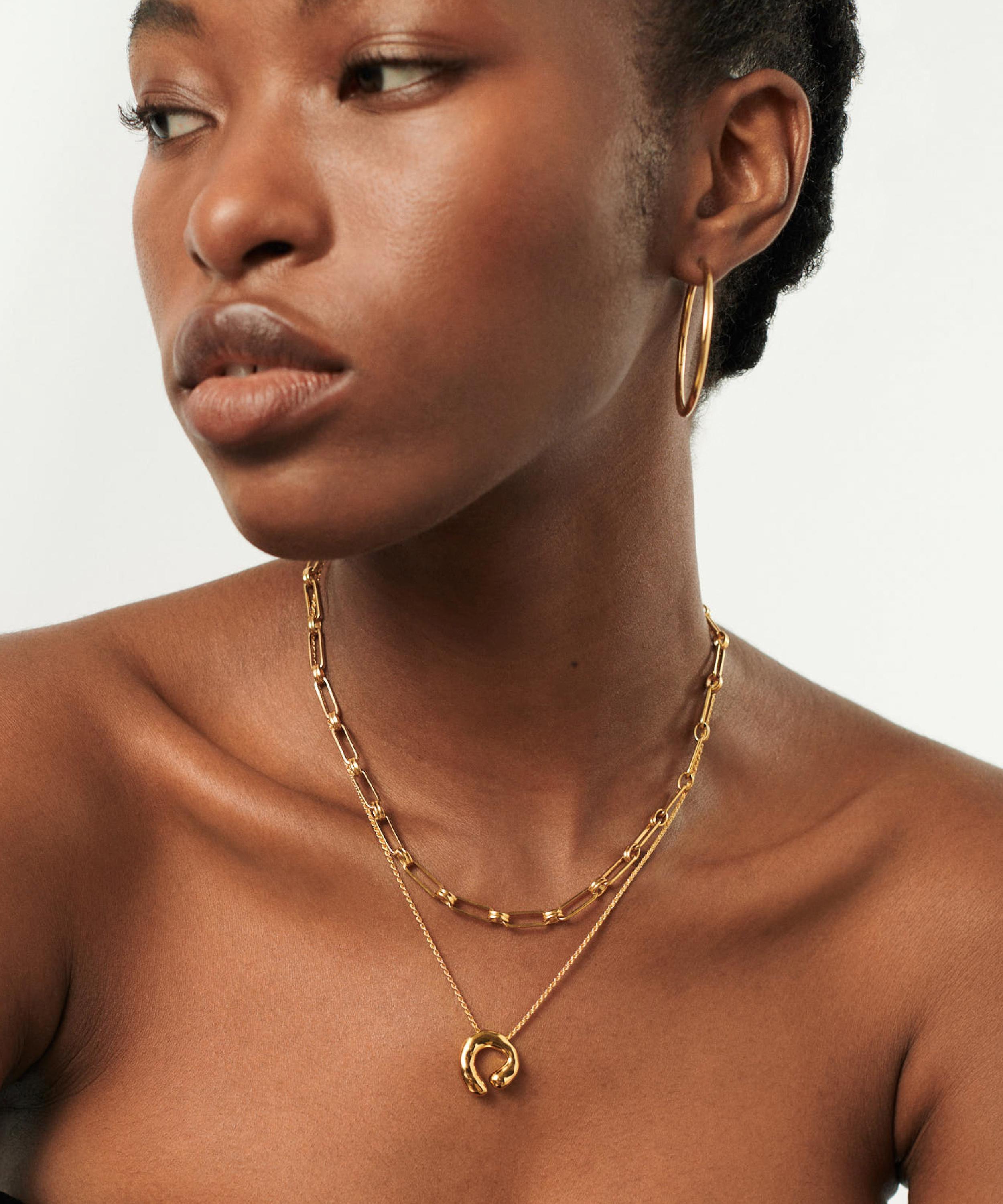 Crafted from 18ct gold-plated brass, it features a delicate chain, adorned with an organic-inspired charm at the centre in a polished finish for a captivating, molten-look. Style it solo, or incorporate it into a layered stack with additional chains and pendant necklaces.