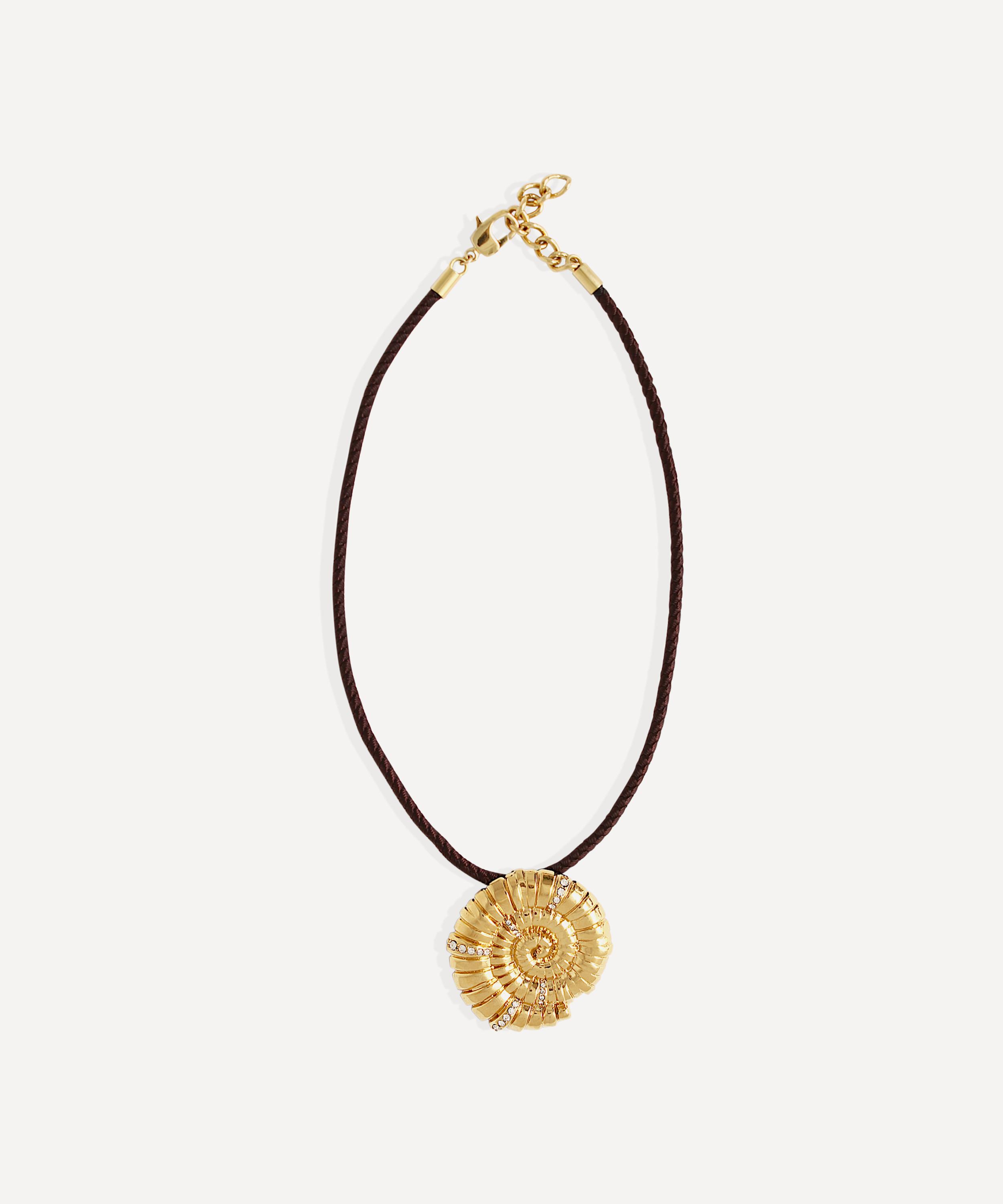 Thoughtfully crafted in London from 18ct gold-plated brass, this distinctive and enduring heirloom features a large fossil pendant with cubic zirconia crystals, suspended from a brown braided cord – offering a timeless yet modern aesthetic with vintage sensibilities. Whether worn as a personal talisman or a statement of confidence, it invites you to embrace your identity with elegance and intention. Style it solo or pair it with other pieces from the brand.