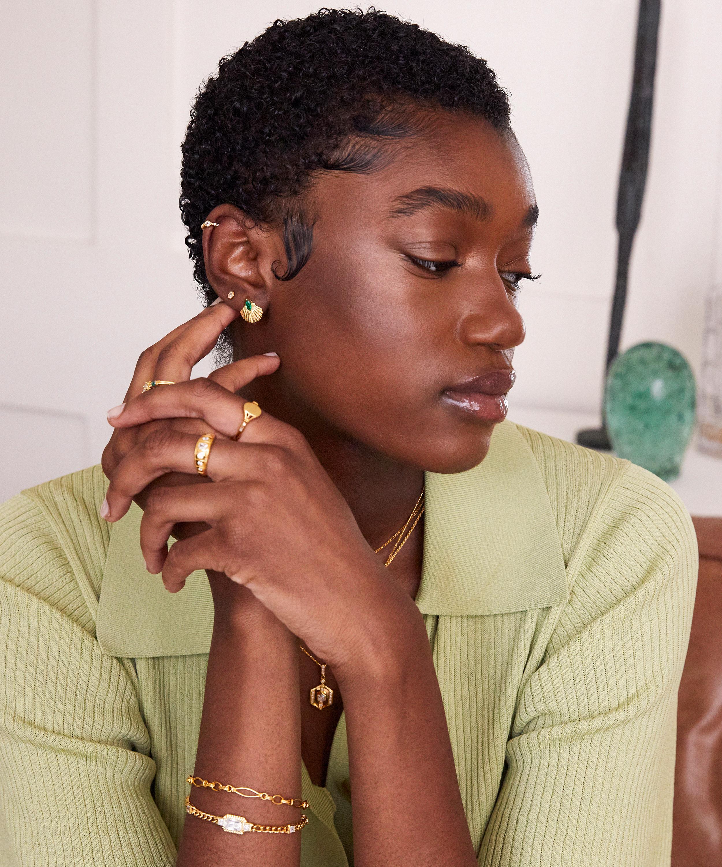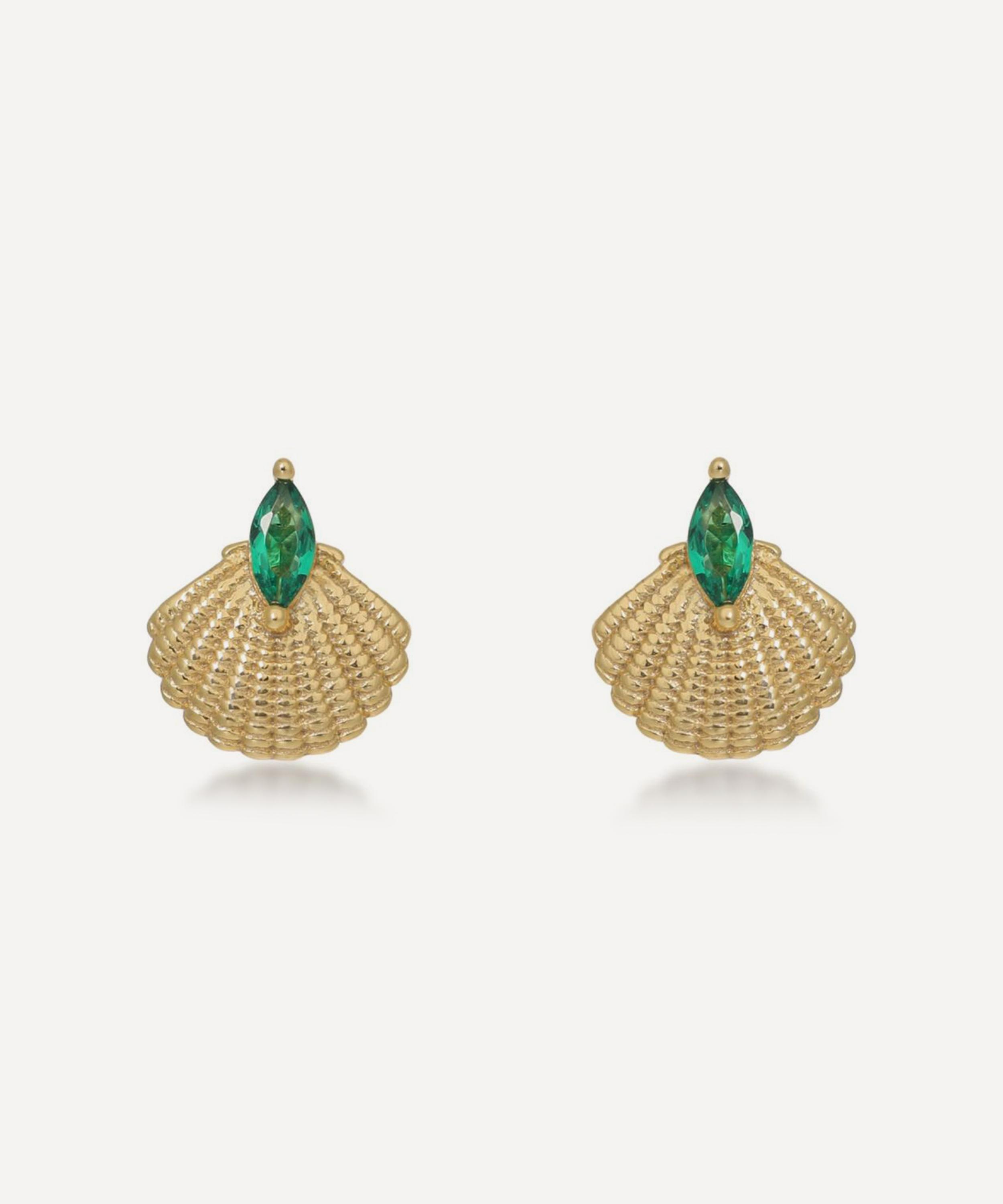Crafted from 18ct gold-plated silver, these Art Deco-inspired earrings feature a shell-shaped silhouette adorned with a marquise cut nano stone. Bound to become a new jewellery box staple – style with the matching earrings and necklace for a coordinated look.