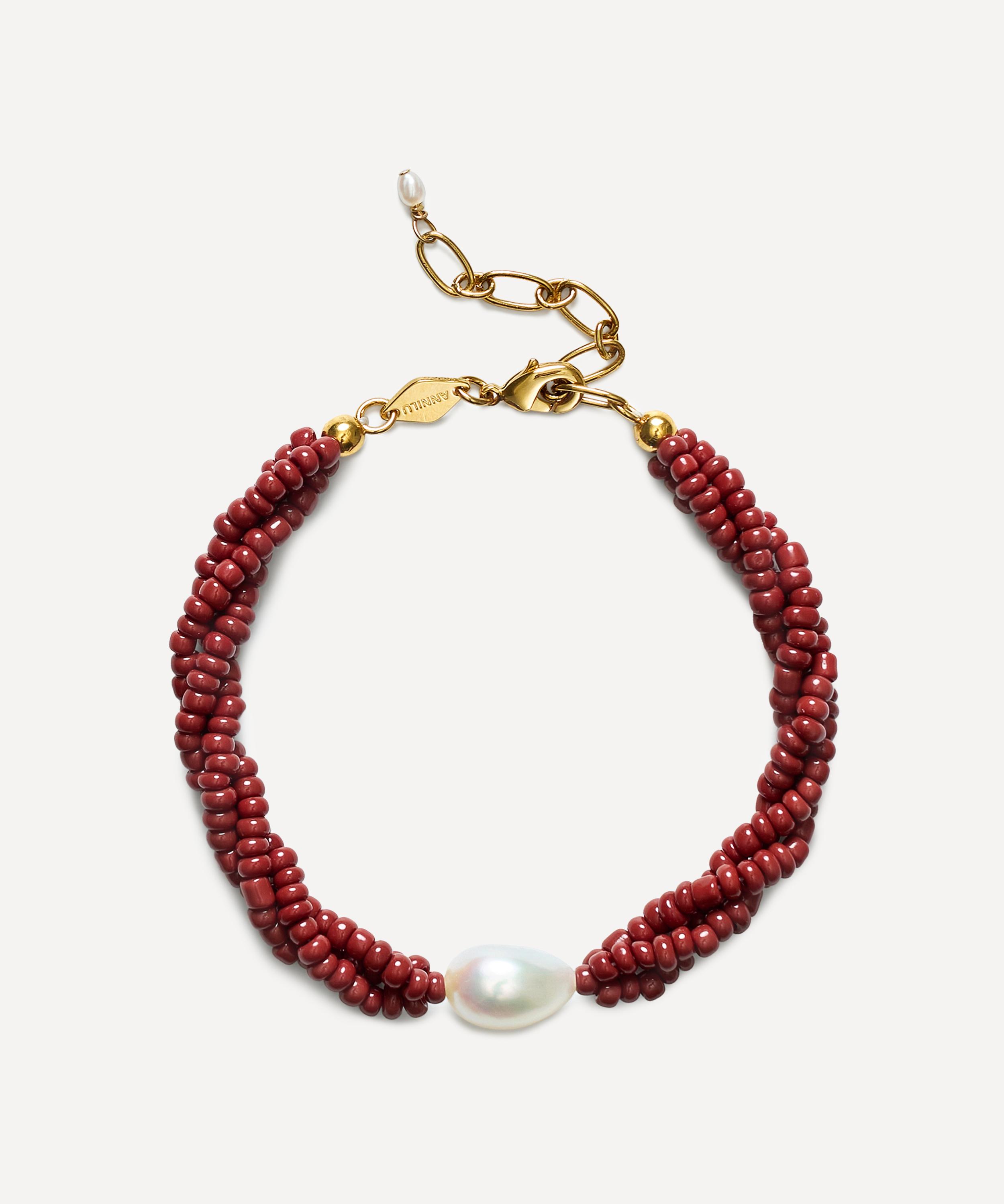 Handcrafted from 18ct gold-plated brass, it is strung with glass beads in a deep burgundy hue, entwined with a central freshwater pearl. Embrace a boho look and wear it alone, integrate it into your curated stack for a unique take on layering or pair it with the Rodeo necklace from the brand’s collection.