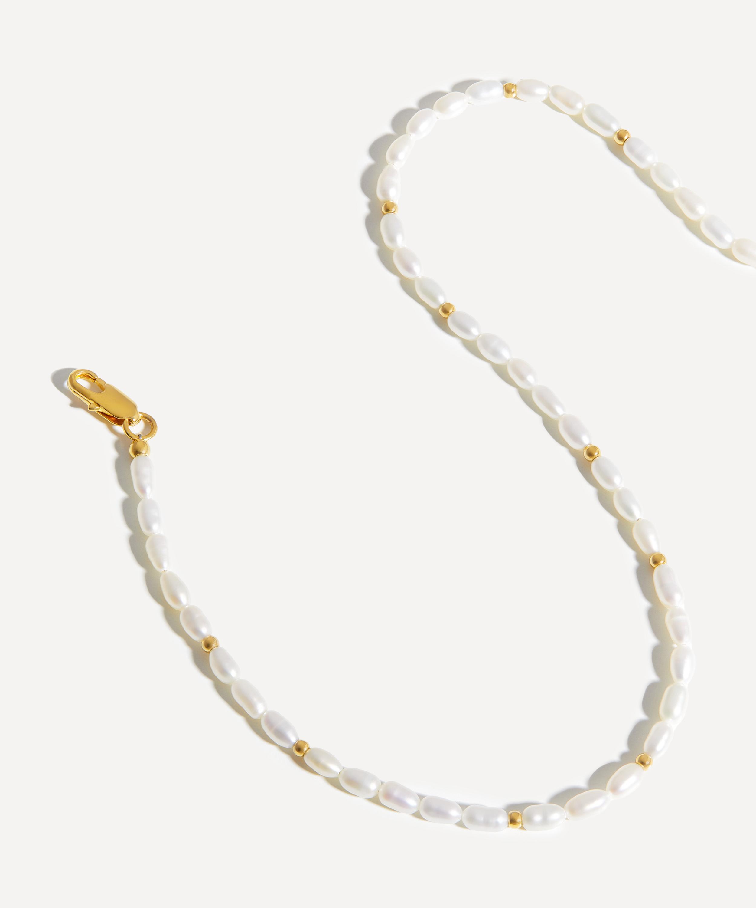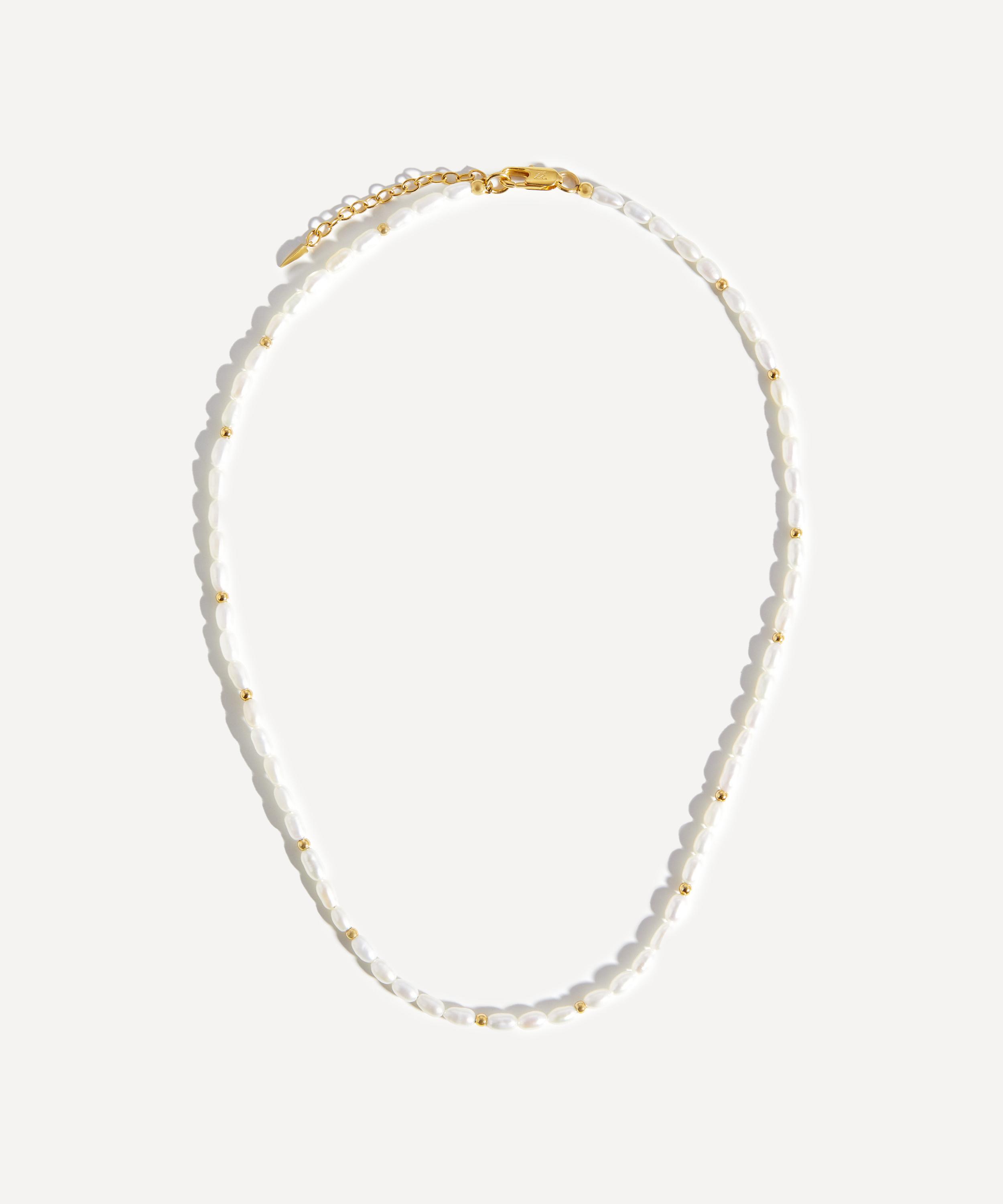 Crafted from 18ct gold-plated brass, it features a string of freshwater seed pearls interspersed with tiny golden beads for a distinctive finish. Style it solo, or incorporate it into a layered stack with additional chains and beaded necklaces for the ultimate holiday-ready look.