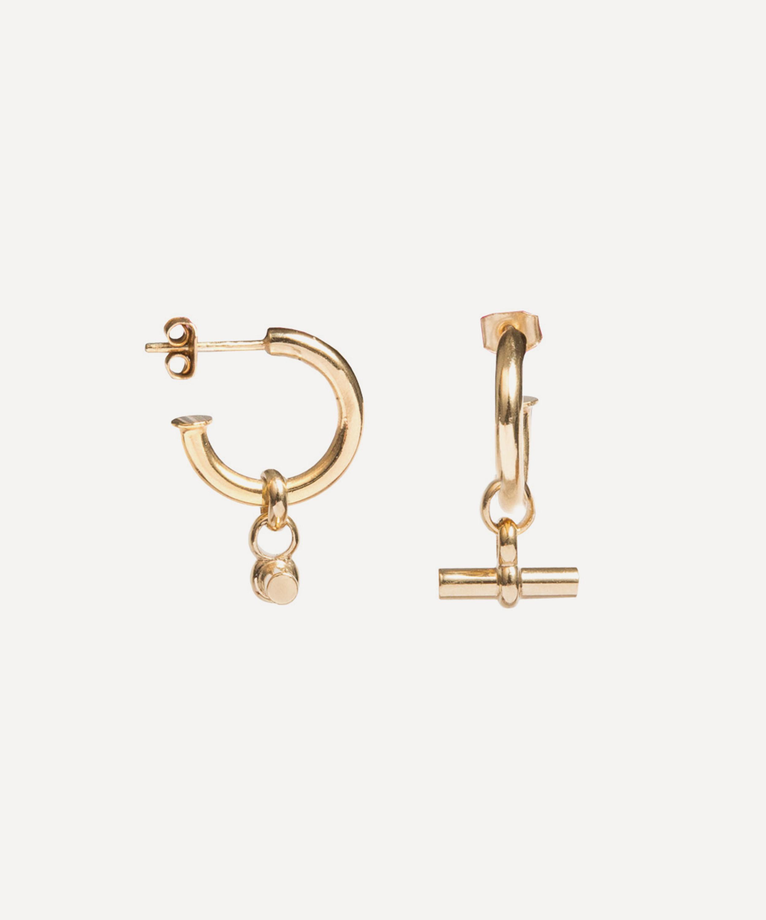 Effortlessly transform everyday outfits with these stackable drop hoop earrings from Tilly Sveaas. Crafted from 18ct gold-plated brass, each earring features a sleek half hoop embellished with an elegant T-bar drop. Offering visual interest to your look, this pair strike a balance between contemporary design and ageless staples to serve as a building block in your jewellery collection.