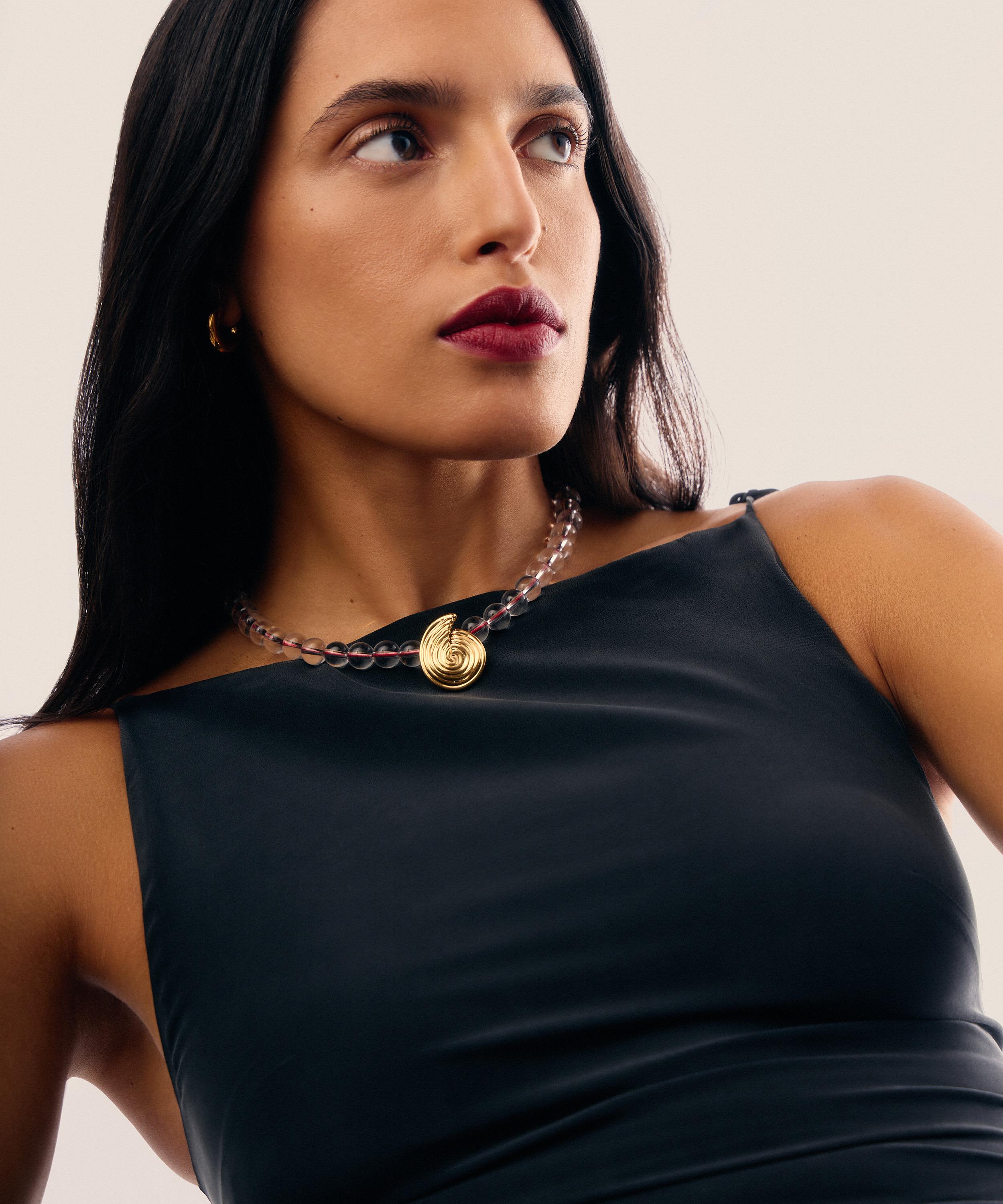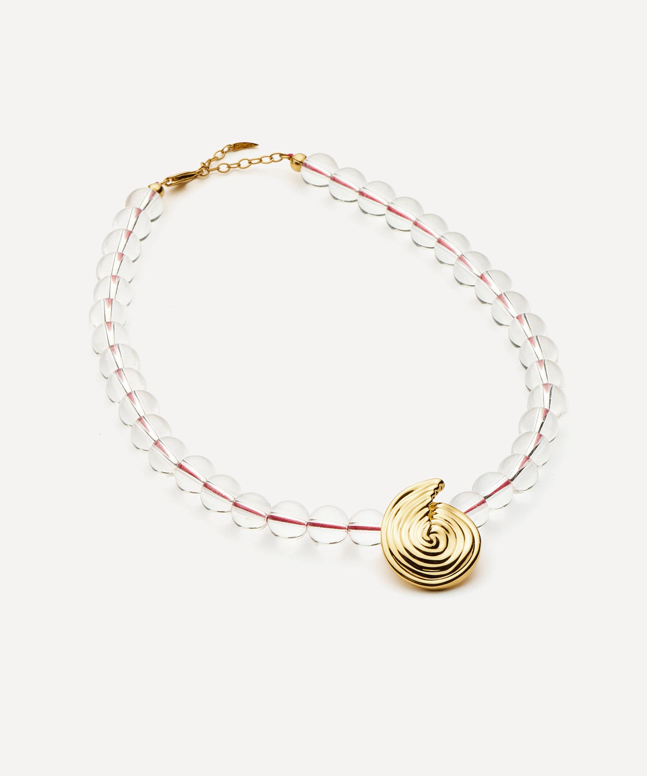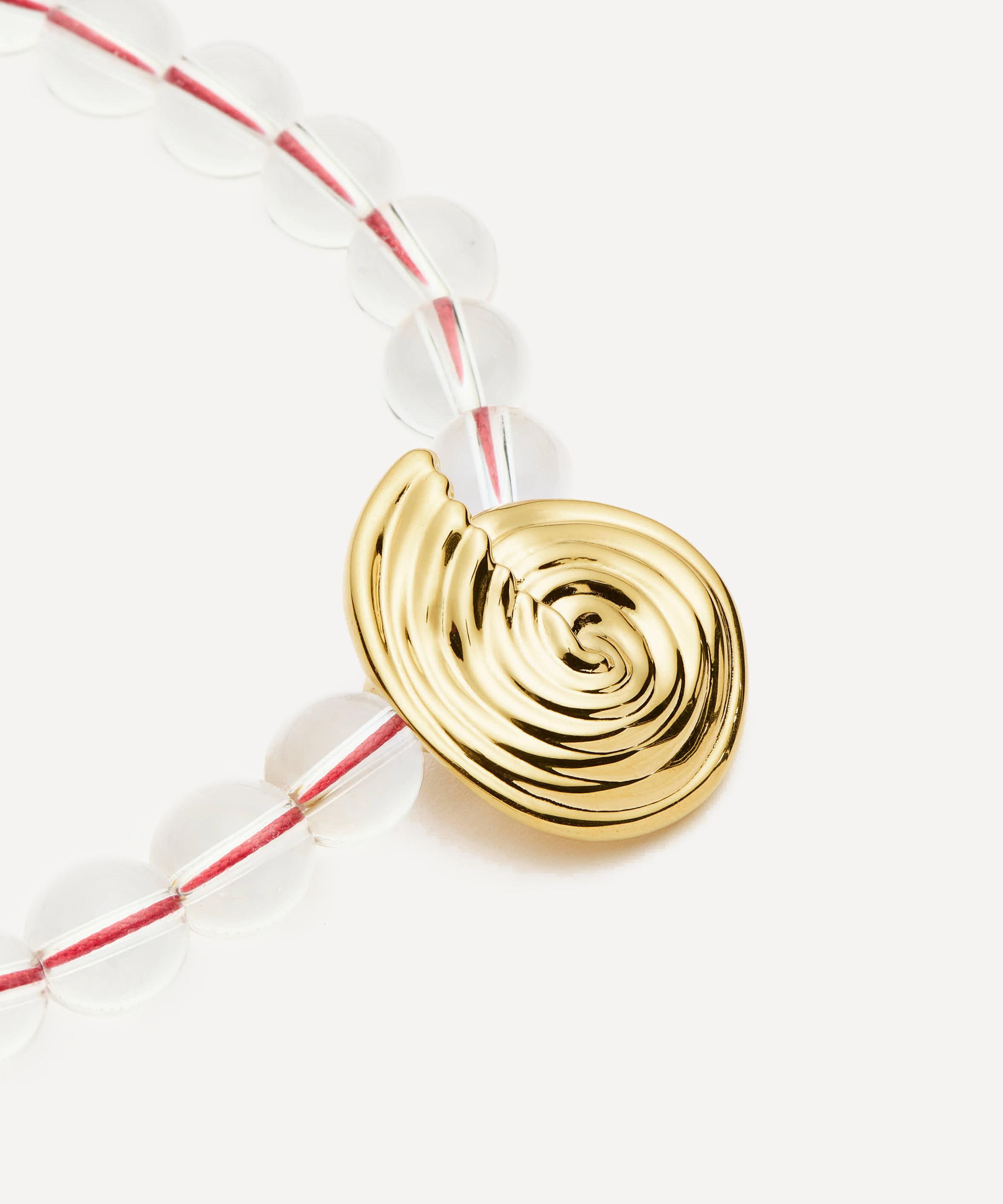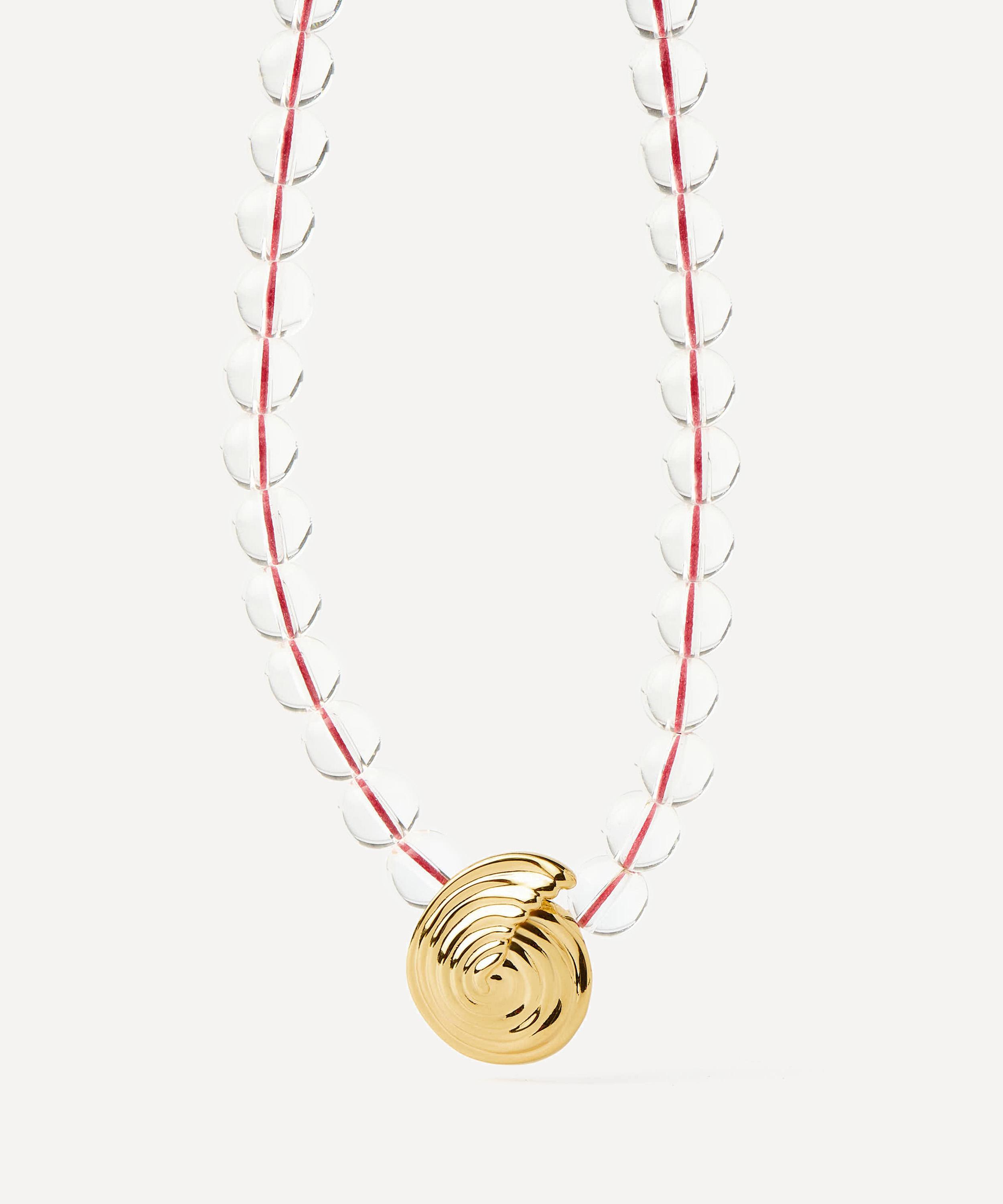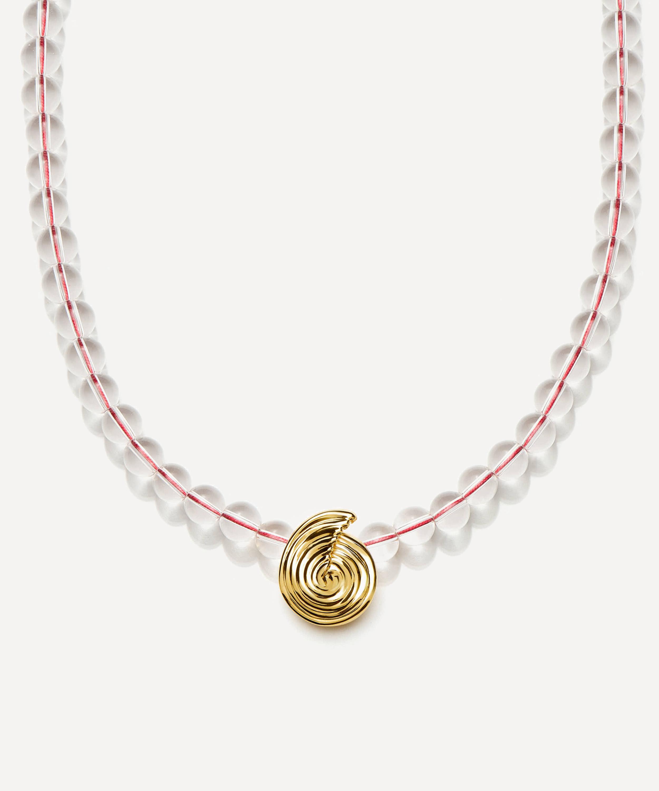 Drawing on elevated costal shapes, it features clear crystal quartz beads strung on a red thread, adorned with a spiral pendant in 18ct gold-plated brass. Perfect for the summer season and beyond, it can be worn as a solo piece or complimented with contrasting chain necklaces and a pair of bold earrings.