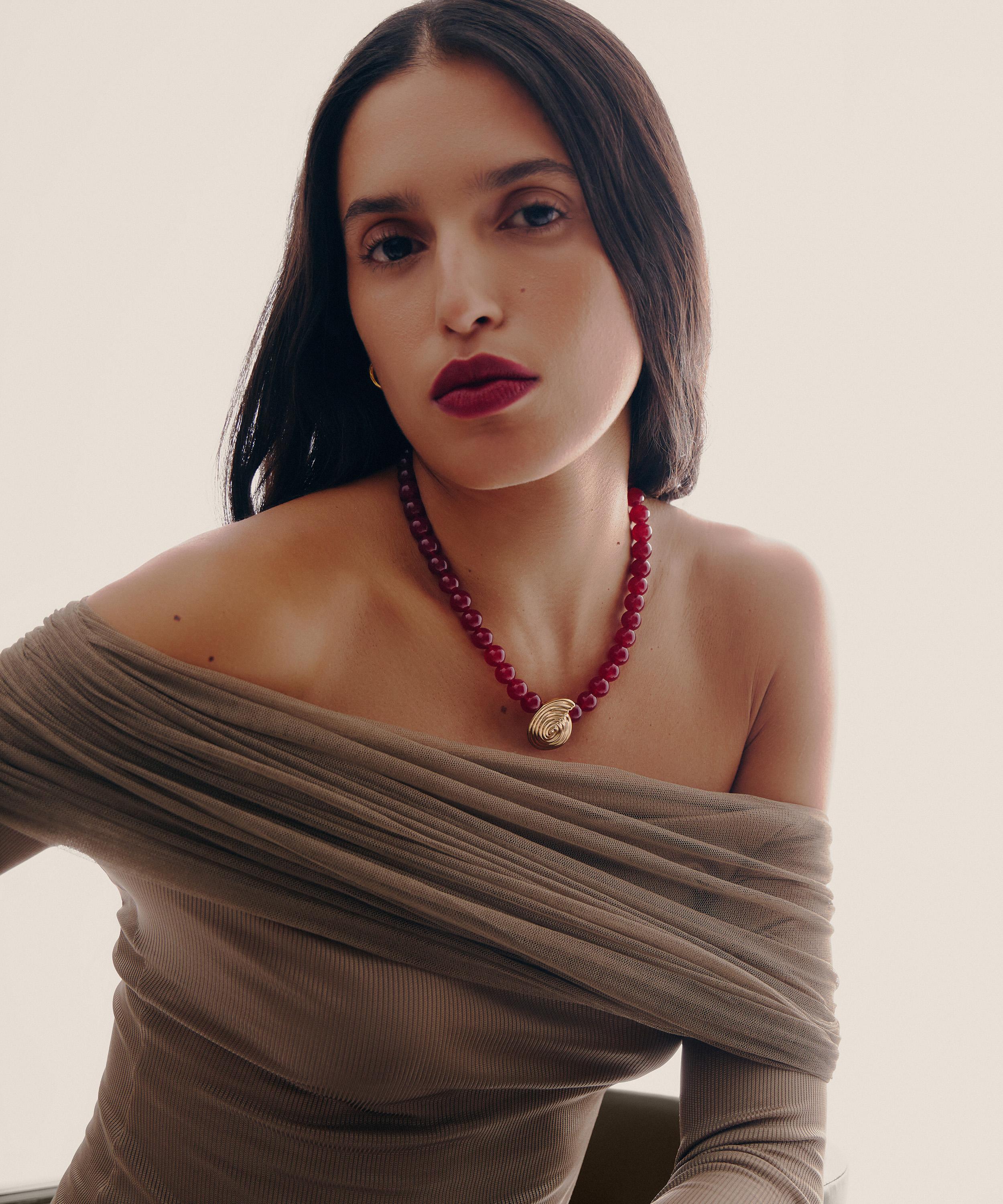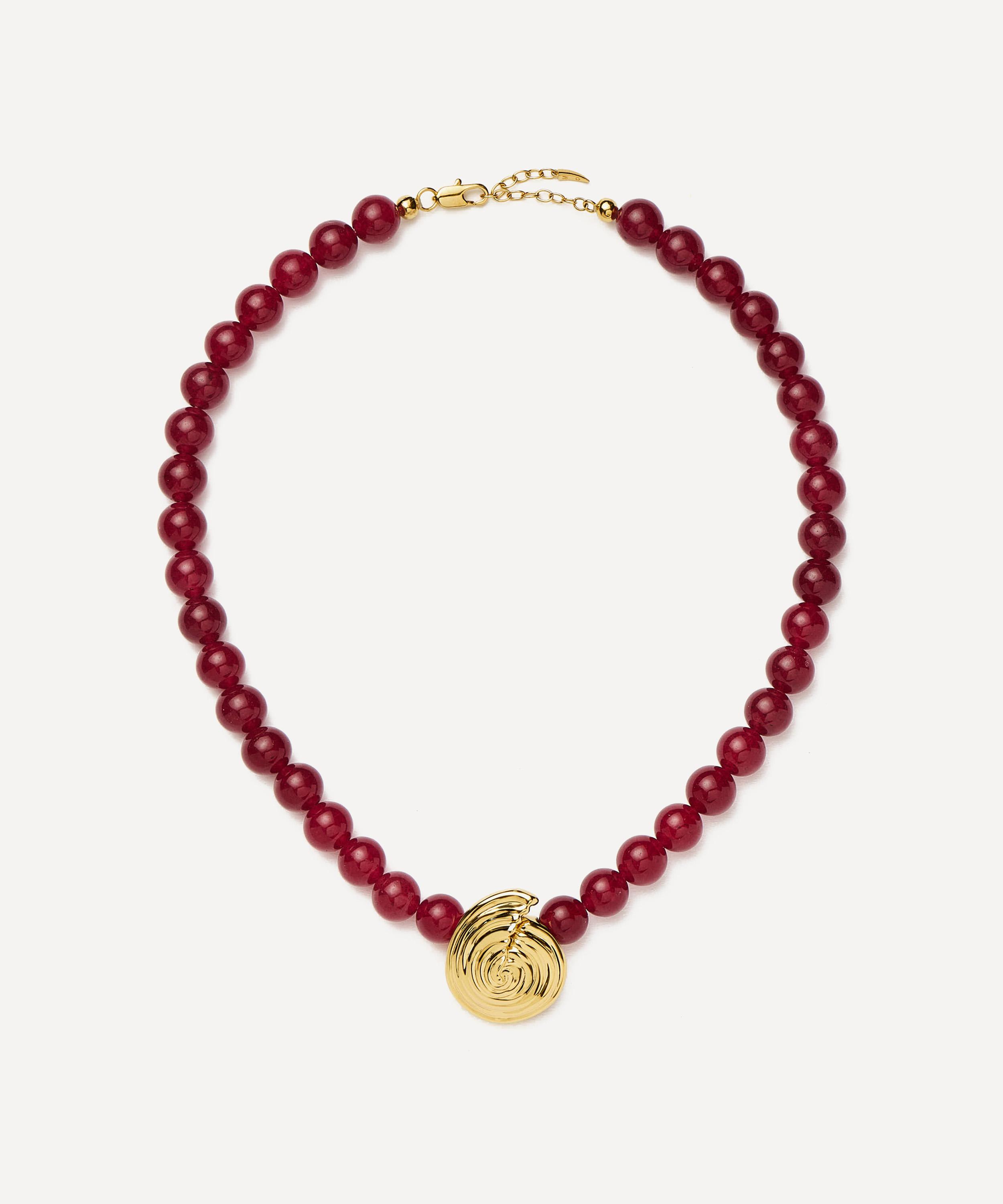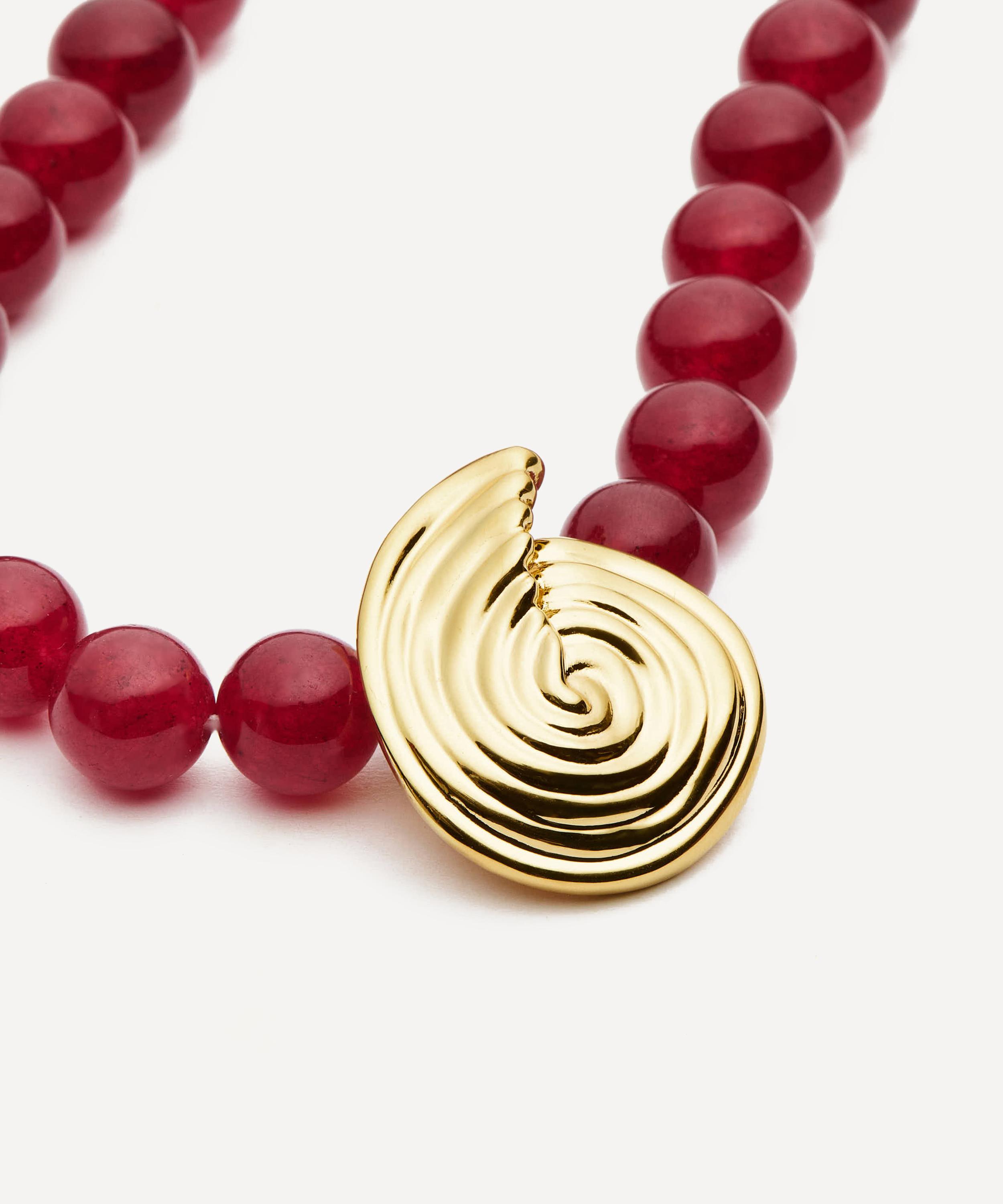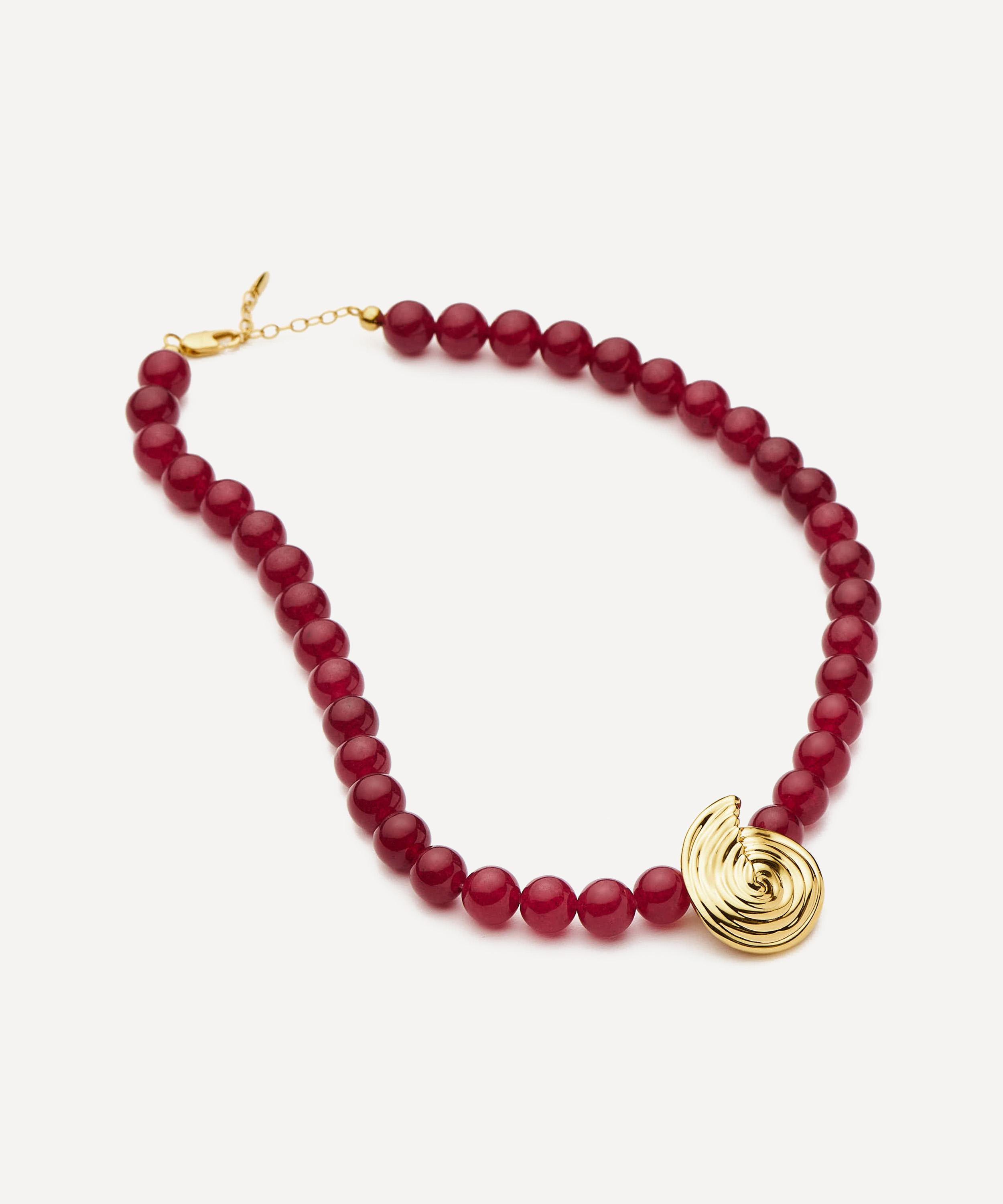 Drawing on elevated costal shapes, it features cherry-red crystal quartz beads strung on a thread, adorned with a spiral pendant in 18ct gold-plated brass. Perfect for the summer season and beyond, it can be worn as a solo piece or complimented with contrasting chain necklaces and a pair of bold earrings.