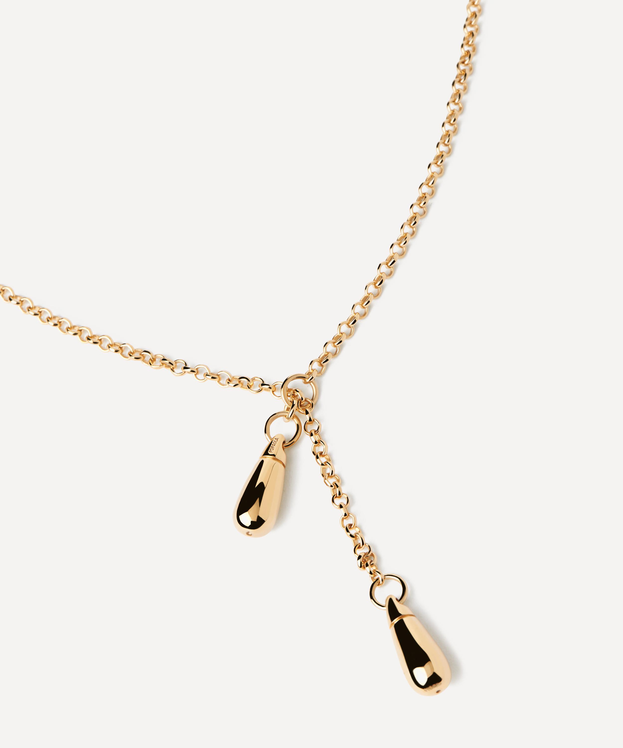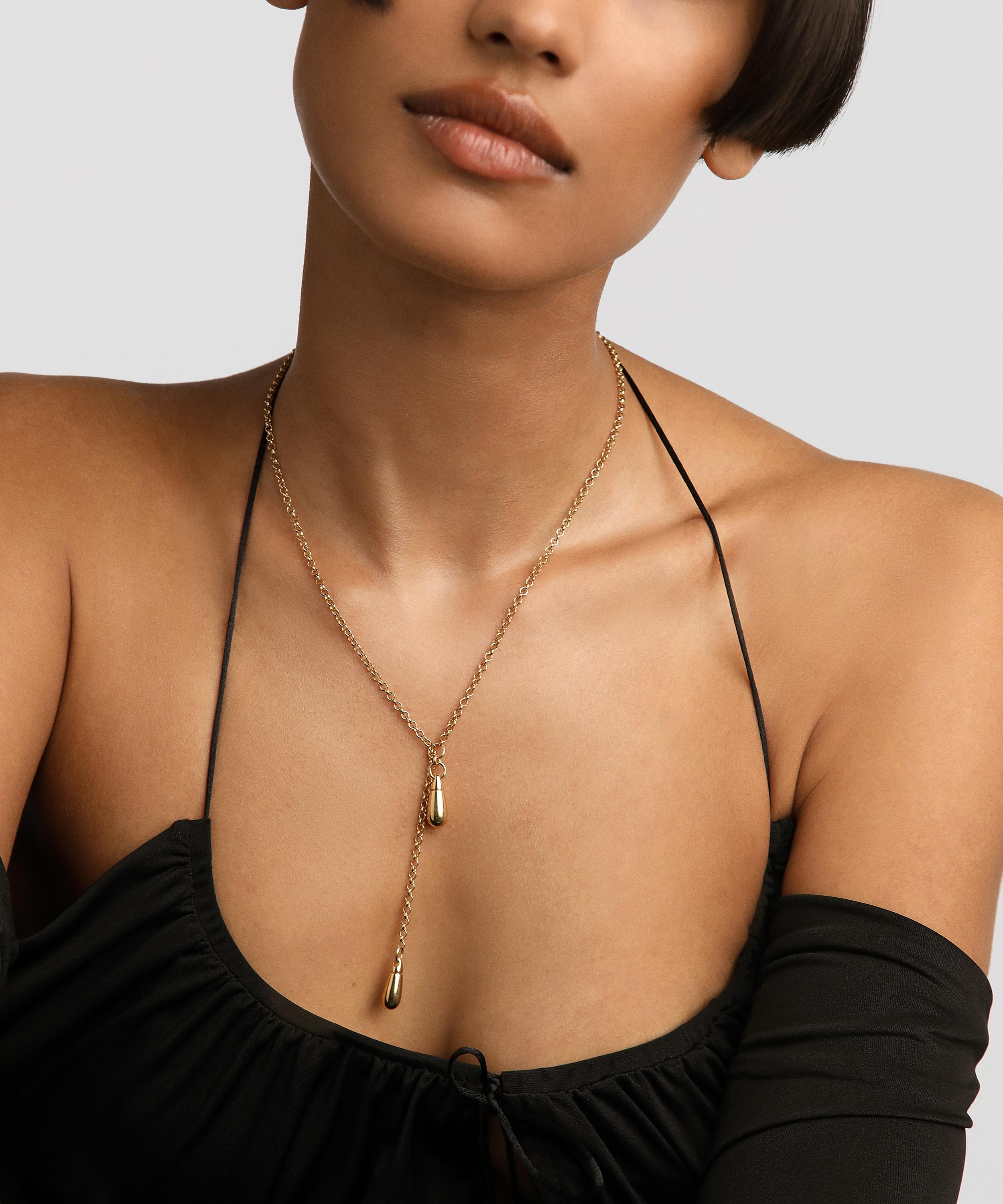 Fashioned from 18ct gold-plated sterling silver, this versatile piece features an adjustable length Y-chain, adorned with two drop-shaped pendants that can be worn to the front, or to the back – style it solo, or as part of a stack for an on-trend curation.