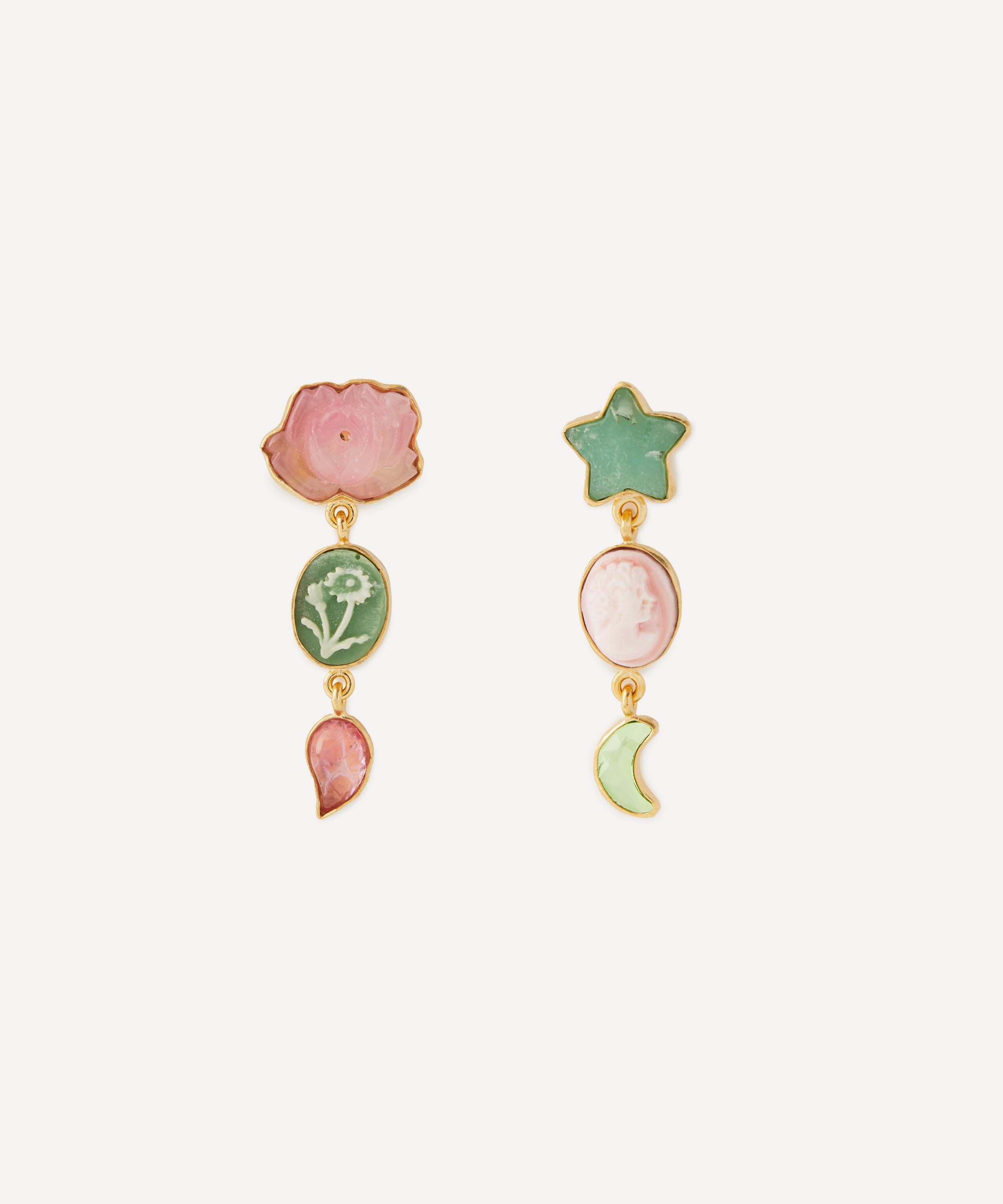 In the late 1980s, Grainne Morton left her home in Northern Ireland to study at the Edinburgh College of Art where she became an avid antique collector - a passion which eventually evolved into creating jewellery from the objects she’d accumulated. Every Grainne Morton design is formed of an eclectic assortment of found objects, coloured gems and tiny trinkets that are hand-selected and arranged by the designer into one-of-a-kind pieces. Try a pair of asymmetric chandelier earrings for an unexpected curation of charms that come together to tell their own unique story.