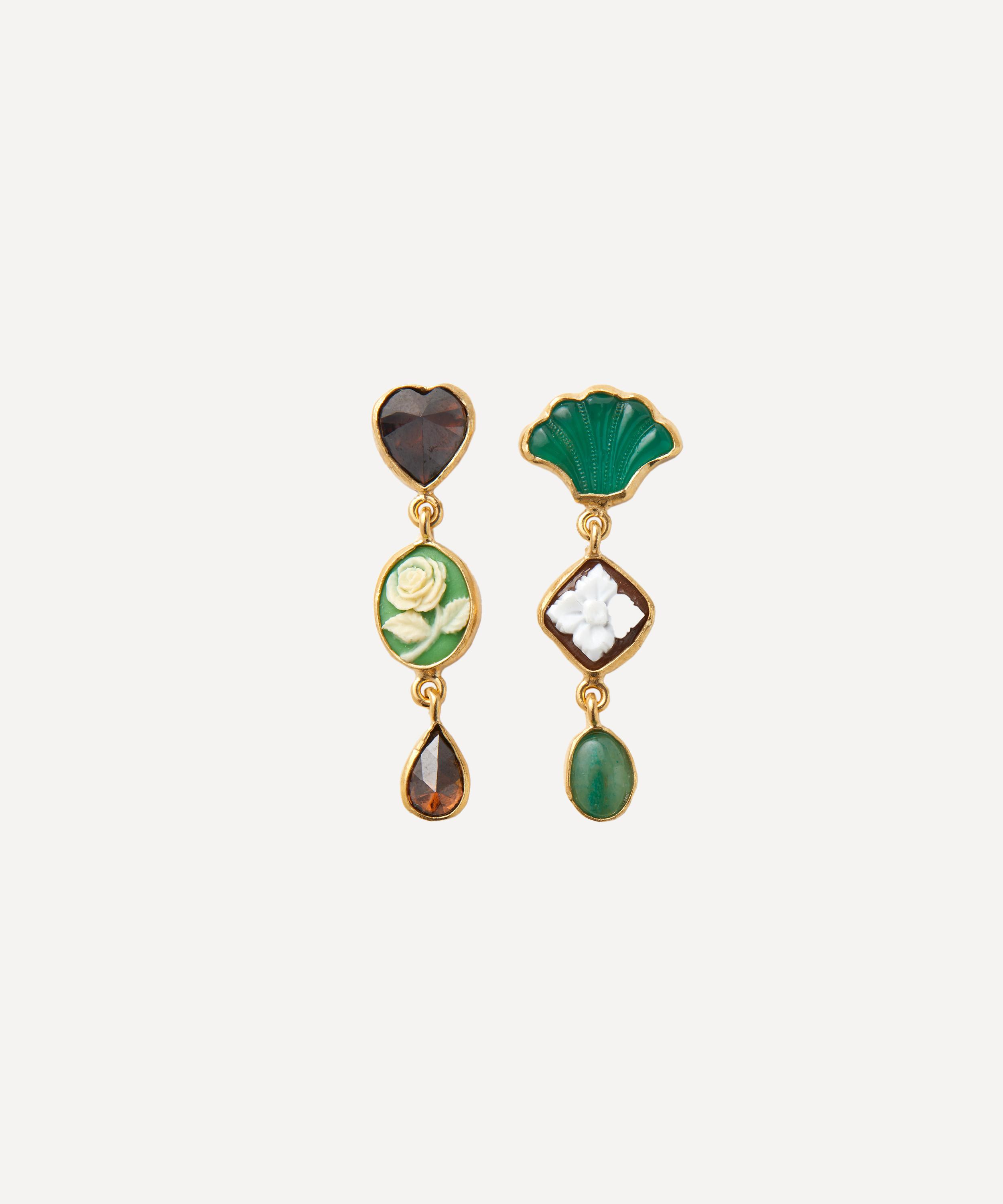 These drop earrings from Grainne Morton boasts a dreamy addition to your everyday line-up. Handmade in Edinburgh from 18ct gold-plated silver, each artful earring is characterised by a classic triple-drop design formed of mismatched charms. Featuring an unexpected juxtaposition of vintage and contemporary styles – they are perfect for adding visual interest to everyday looks.