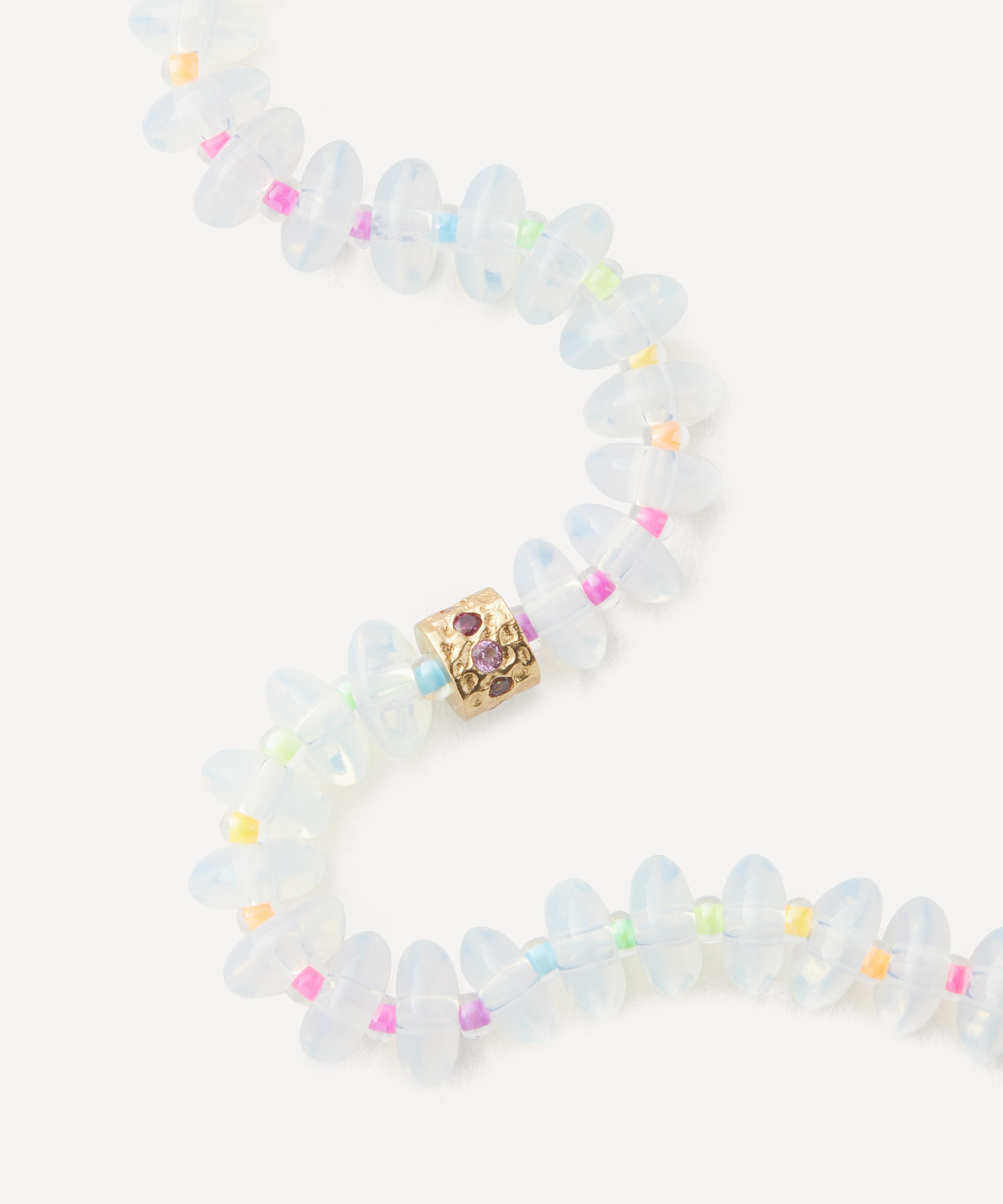 The Ice Ice bracelet boasts a signature design from Anni Lu’s Tropicana collection – welcoming a feeling of luxury and indulgence. Crafted from 18ct gold-plated brass, it features a string of opalite gems and multi-coloured glass beads, accented with an organically-shaped gold charm inlaid with cubic zirconia. Try styling it with other pieces from the collection for a fully coordinated curation.