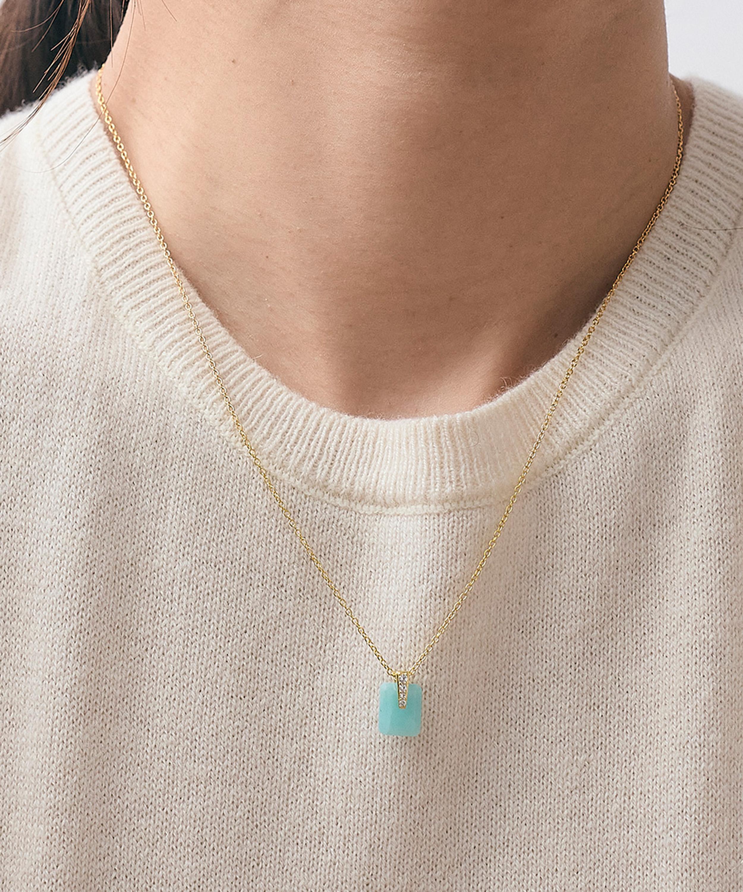 Exemplifying the geometric shapes that characterises the Deco collection, this necklace features the powerful amazonite stone – symbolic of calm and clarity – suspended from a delicate chain and bail clasp adorned with white sapphires. Style it on its own, or pair with other pieces from the collection.