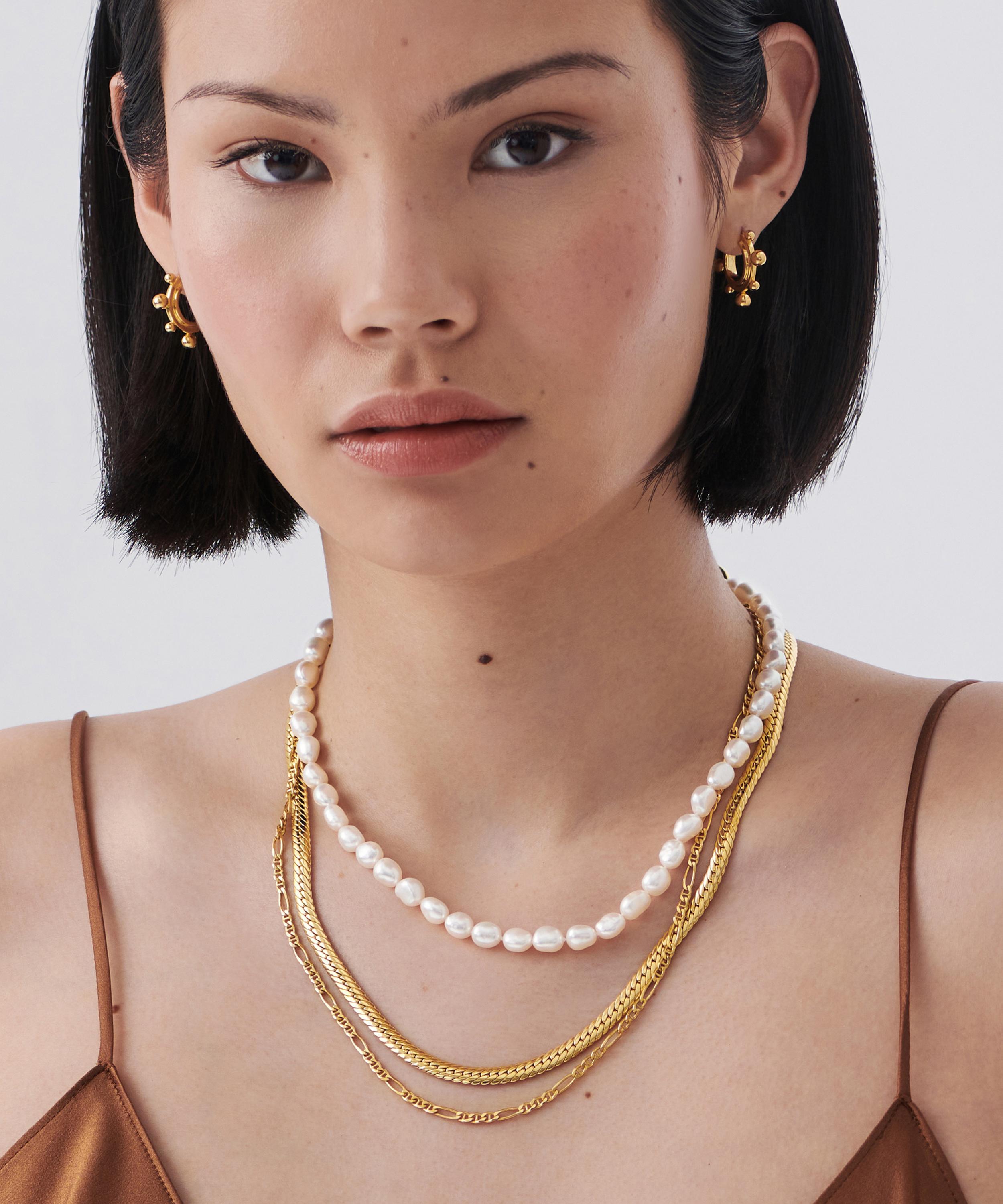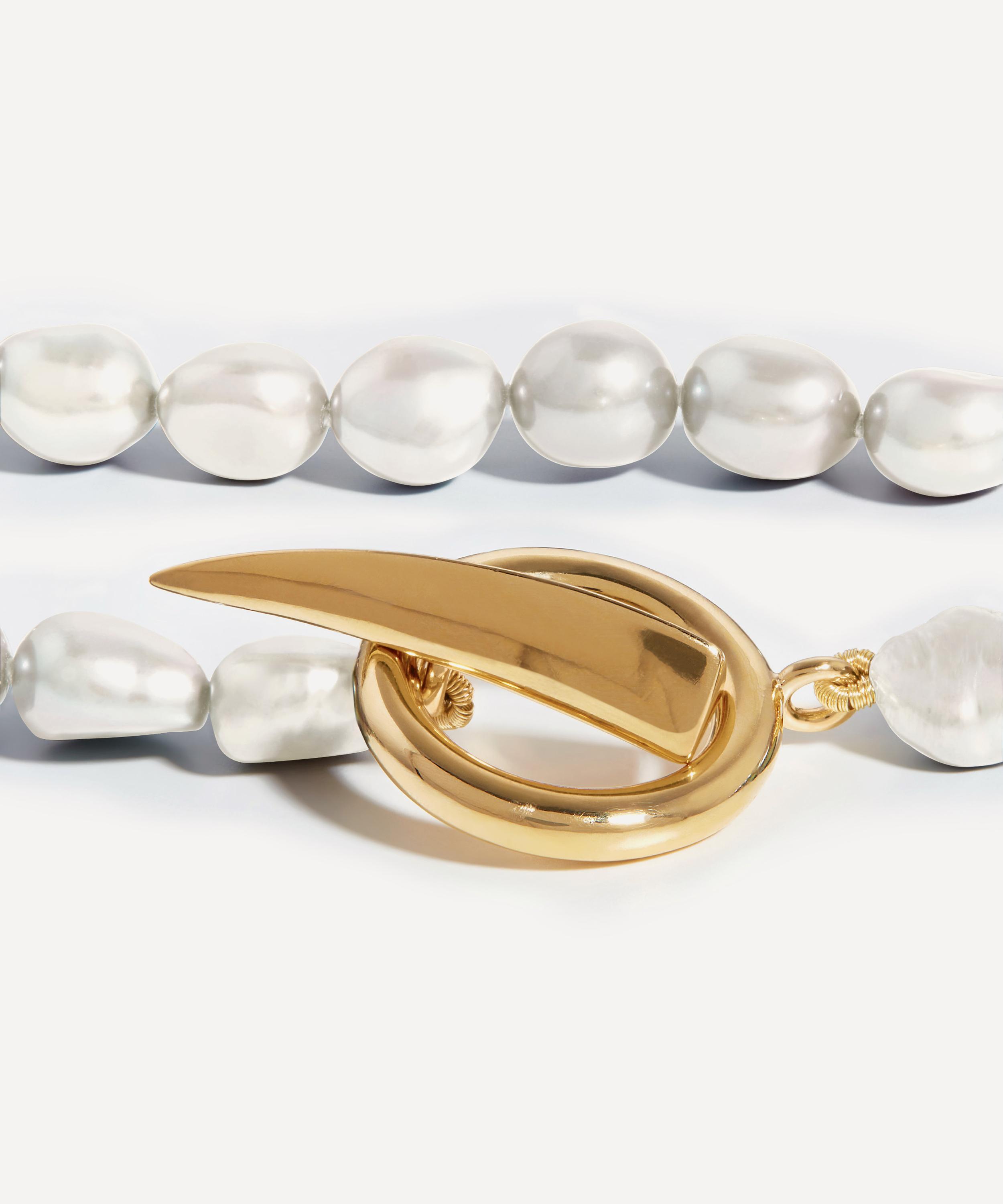 Inspired by natural forms, this pearl t-bar necklace from Missoma showcases a timeless design with a contemporary edge. Crafted in recycled silver plated in 18ct gold vermeil, this necklace features a string of uniquely shaped freshwater pearls and a distinctive claw, t-bar fastening. Style this opulent piece alone, or pair it with additional chains to add texture to your necklace curation.