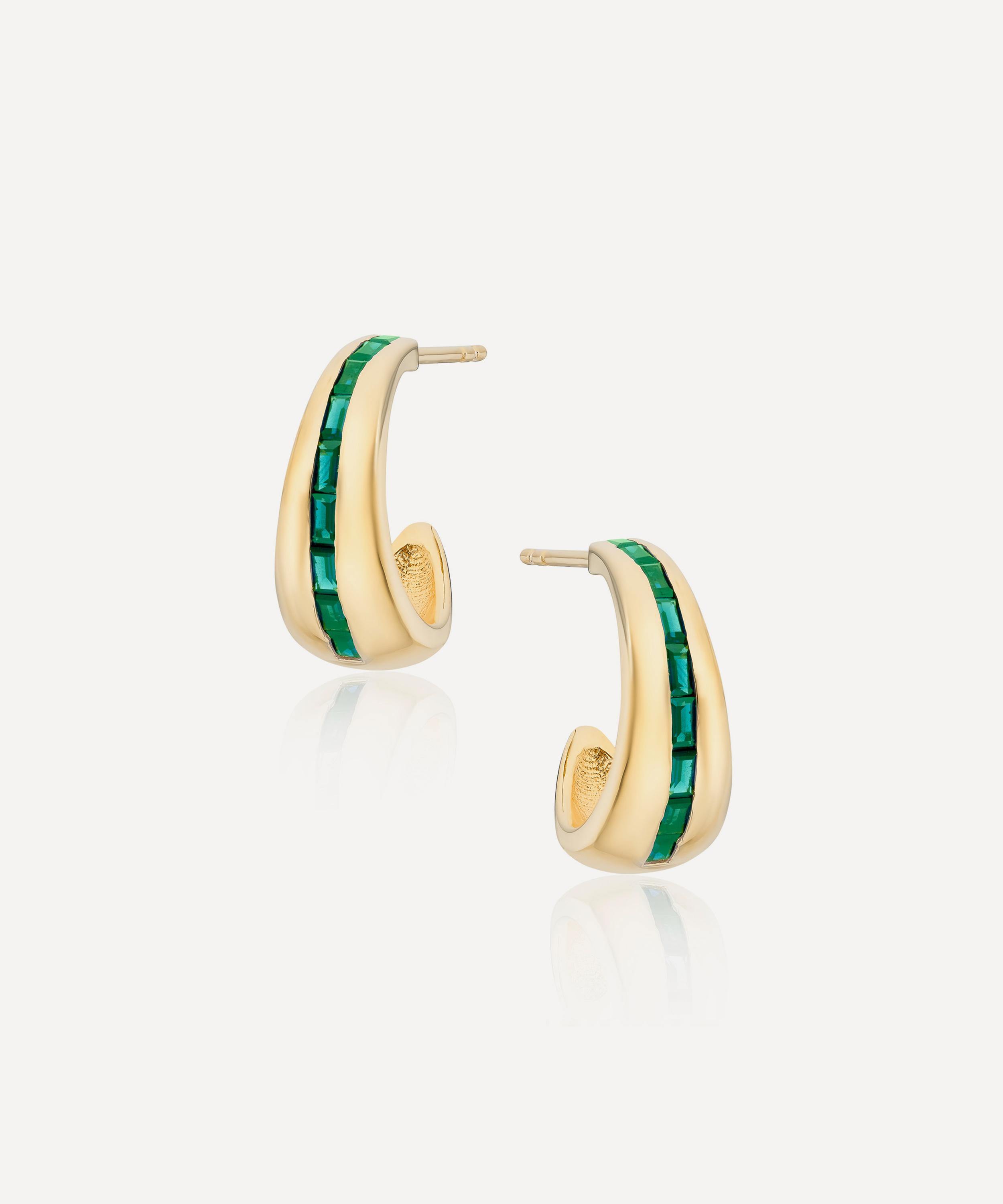 Crafted from sterling silver plated in 18ct gold vermeil, each hoop features an elegant dome silhouette lined with baguette cut, green cubic zirconia stones down the centre. Wear them solo or incorporate into a stack with a mix of studs and hoop earrings.