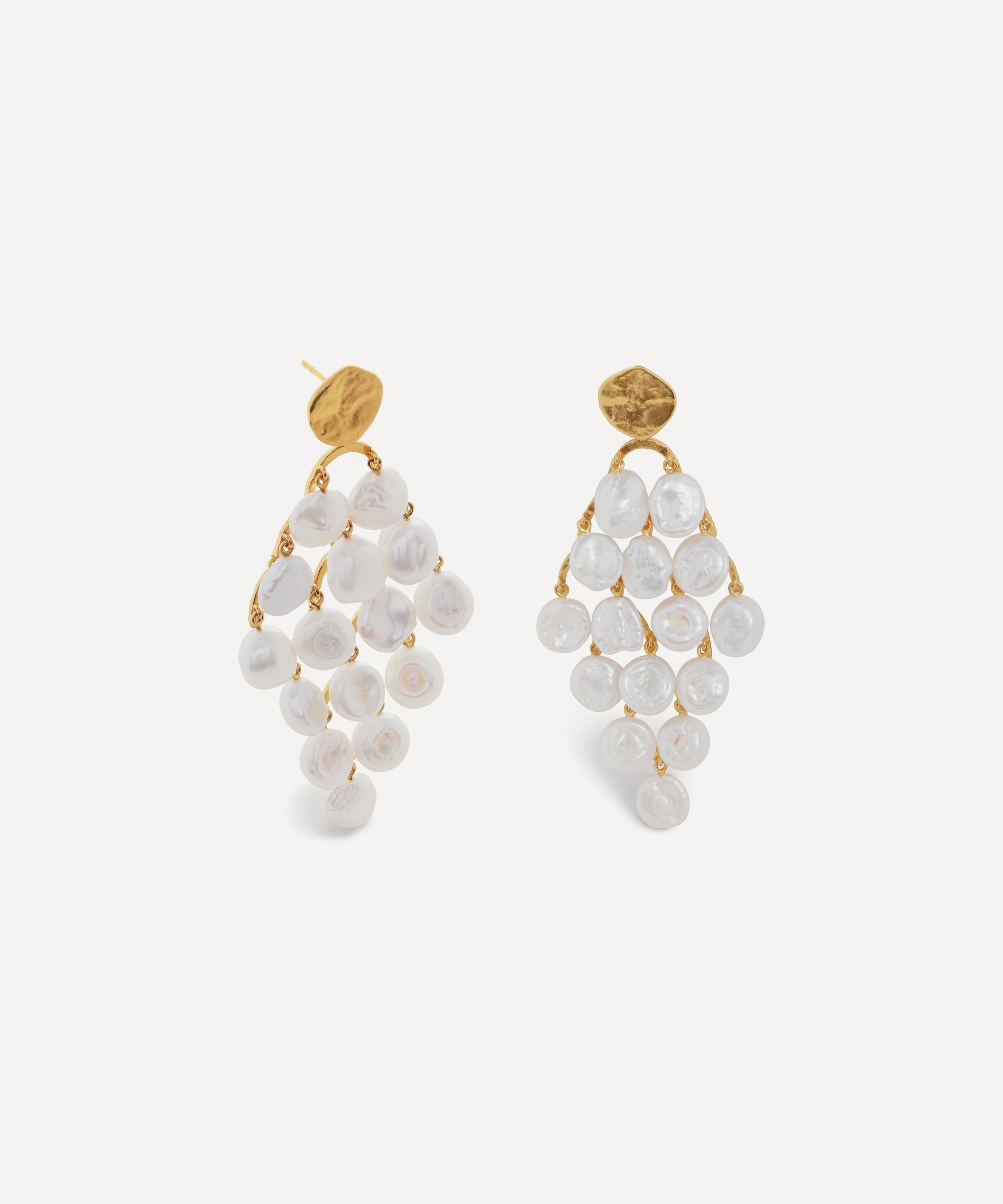 Crafted from sterling silver plated in 18ct gold vermeil, each earring features a satin-finish disc top and a chandelier-style drop with lustrous, cascading Keshi pearls - inspired by deep-sea treasures. Style them solo for a statement look or stack with other earrings and let them transport you to the rugged landscape the island is famed for.