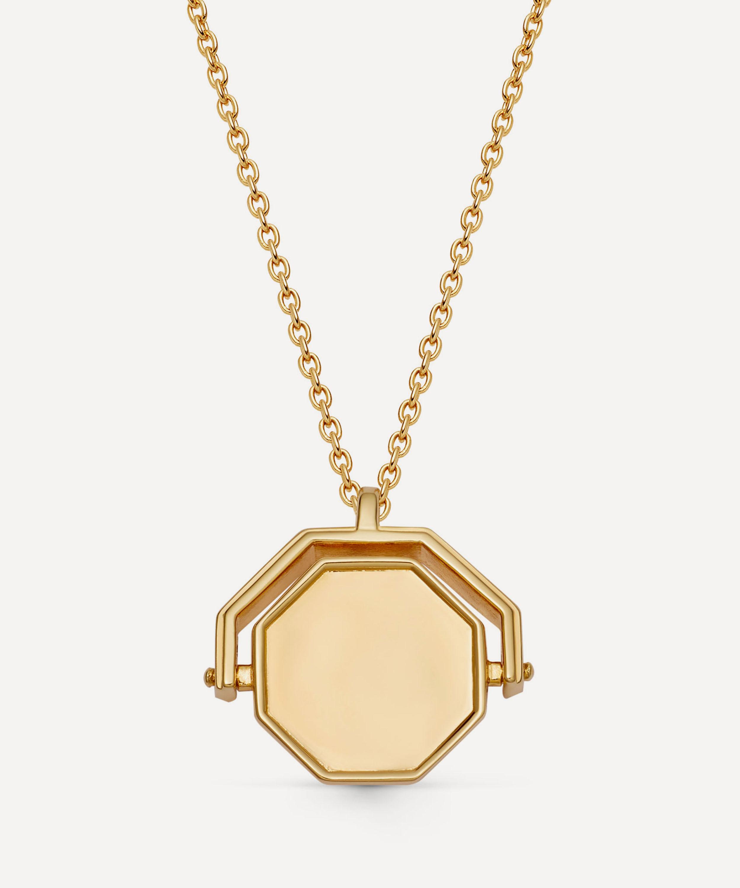 Crafted from sterling silver plated in 18ct gold vermeil, it features a fine cable chain and octagon-shaped spinner locket, beautifully embellished with sunray detailing and a white sapphire. Evoking personalised, keepsake jewellery, this is a locket for life, it offers endless styling options - wear yours on its own, or layer it with another gold pendant necklace or gold necklace.