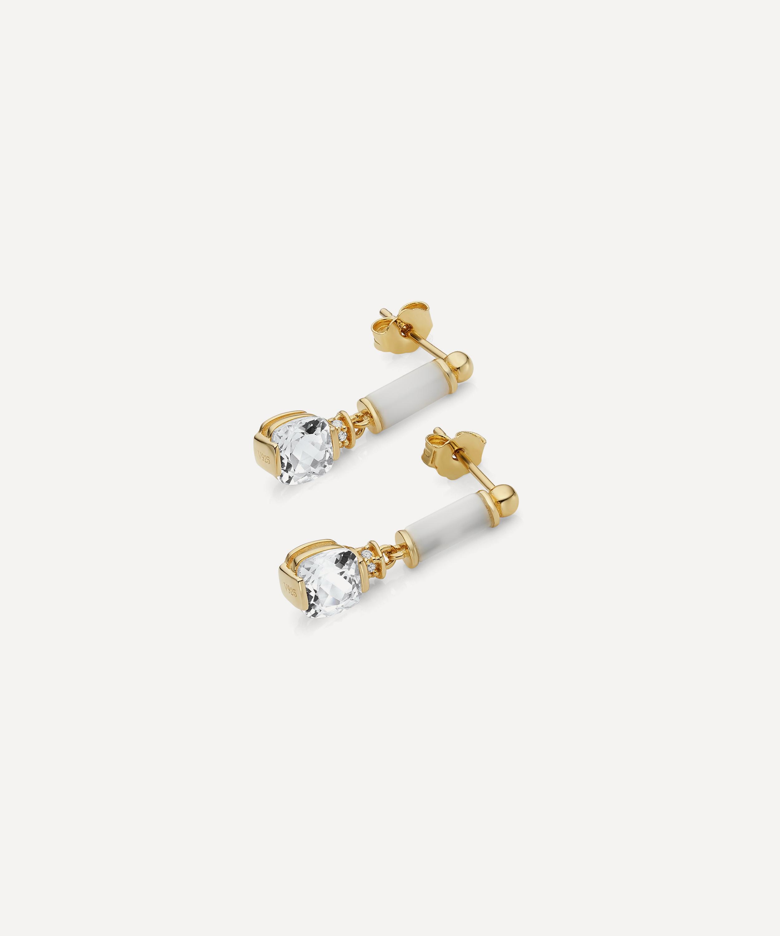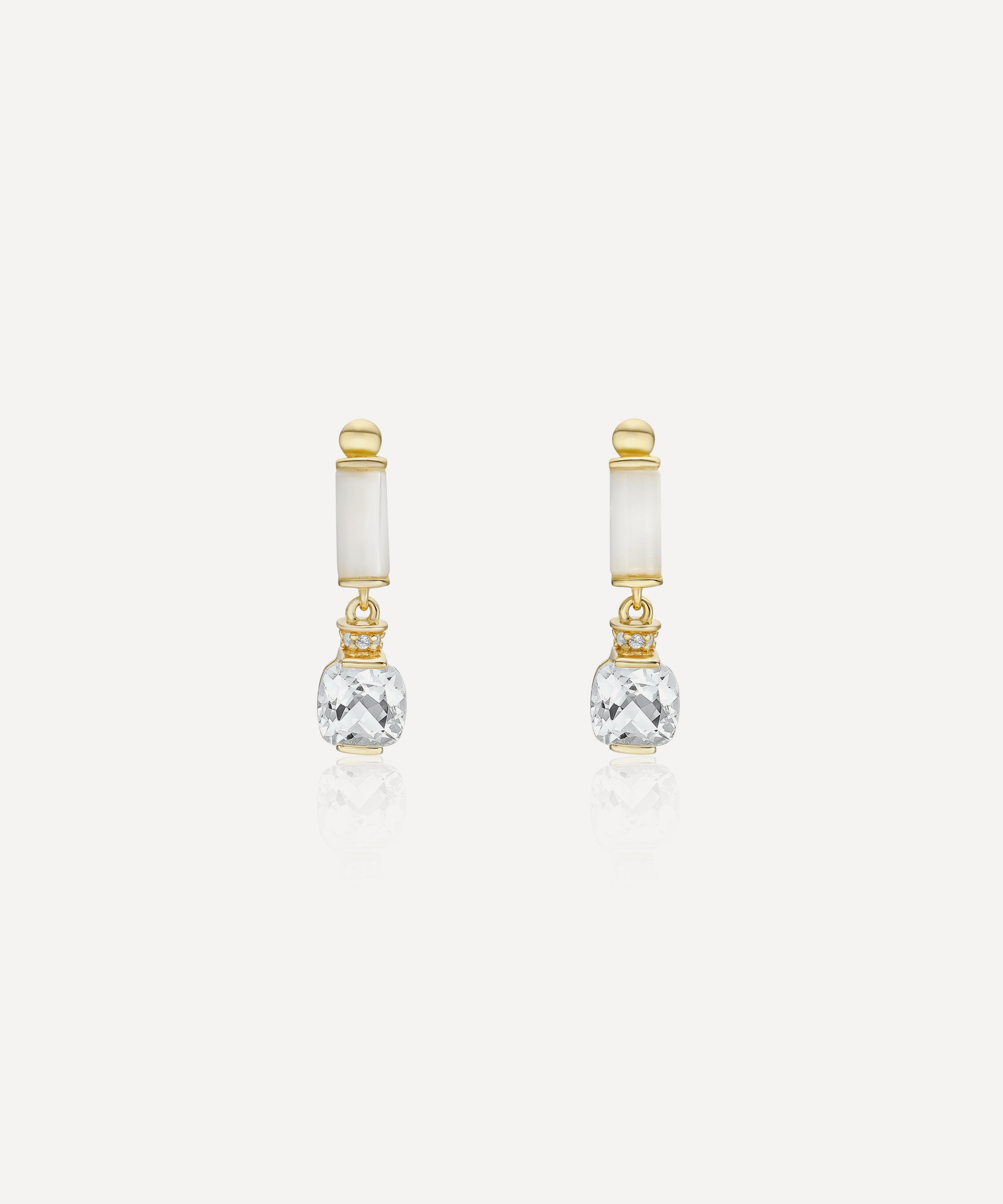 Inspired by the opulent forms and rich textures of the Art Deco era, each earring is crafted from sterling silver plated in 18ct gold vermeil. Featuring clean, cylindrical lines composed of a mother of pearl column bead, it’s contrasted by a cushion cut white topaz drop. Wear them on their own, layer with other earrings or partner them with the matching Column Mother of Pearl Necklace.