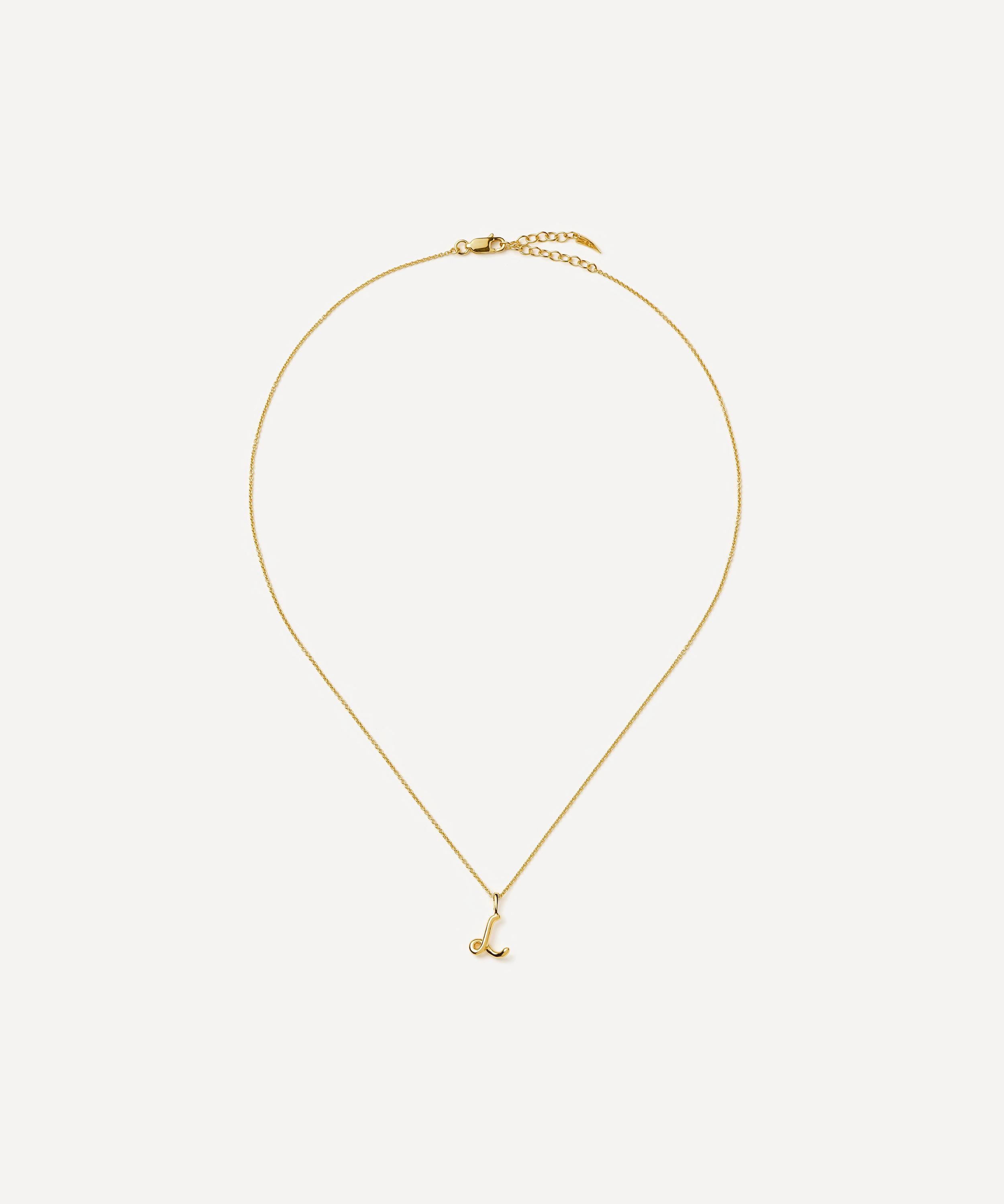 Put a unique spin on your jewellery curation with this personal initial pendant necklace from Missoma. Crafted from sterling silver plated in 18ct gold vermeil, it features a delicate trace chain adorned with a molten style ‘L’ initial pendant in a bespoke hand-drawn font. Elegant and versatile, it makes for a thoughtful personalised gift for someone special or yourself – perfect for both layering and styling solo.