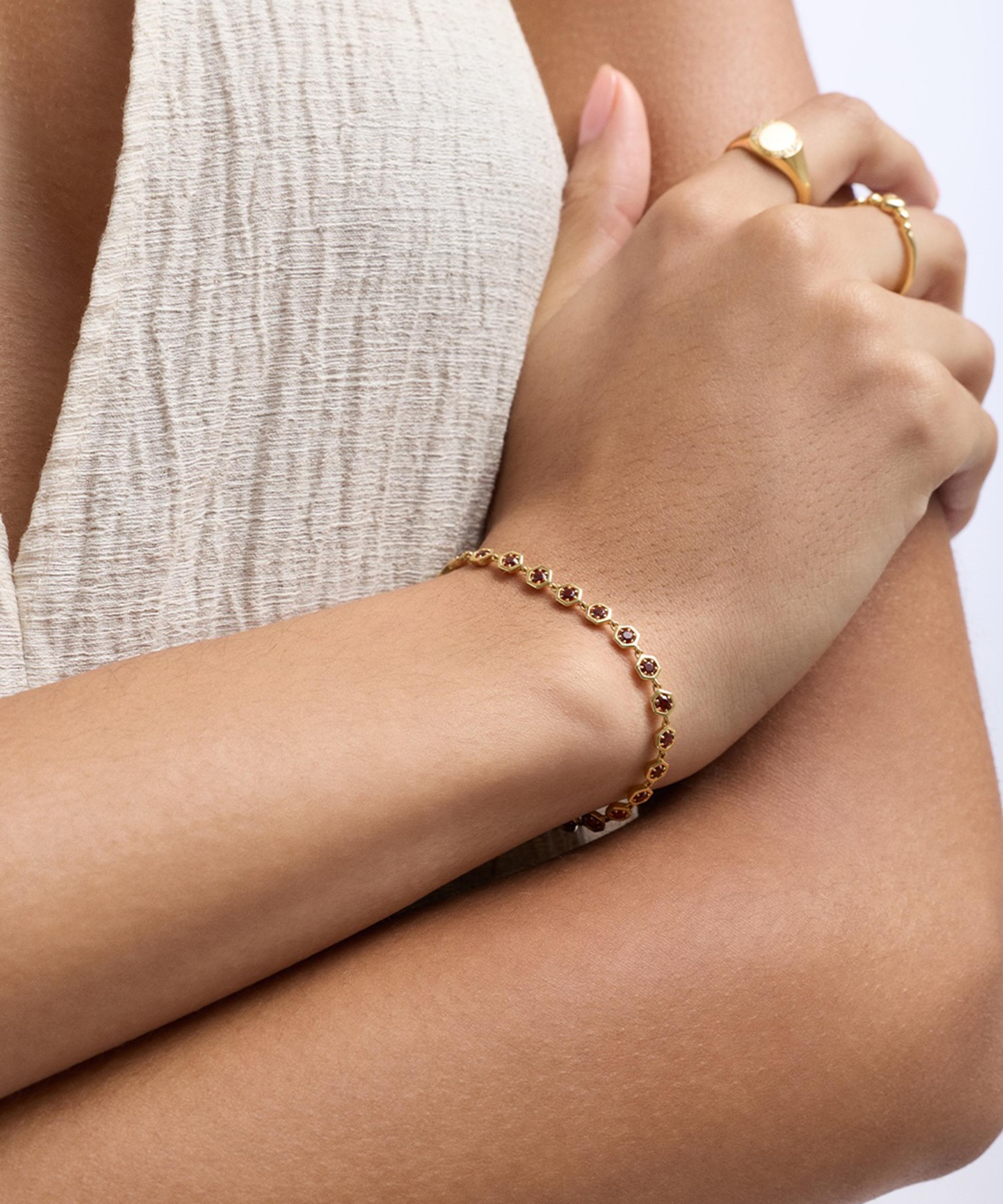 Exemplifying the celebration of geometric shapes that characterises the Deco collection, this bracelet features a row of intricately cut hexagonal red garnets, set in sterling silver plated in 18ct gold vermeil. Finished with a secure lobster clasp closure, it is perfect for stacking – try styling it with several other bracelets from the collection to enrich the composition of your wrist curation.