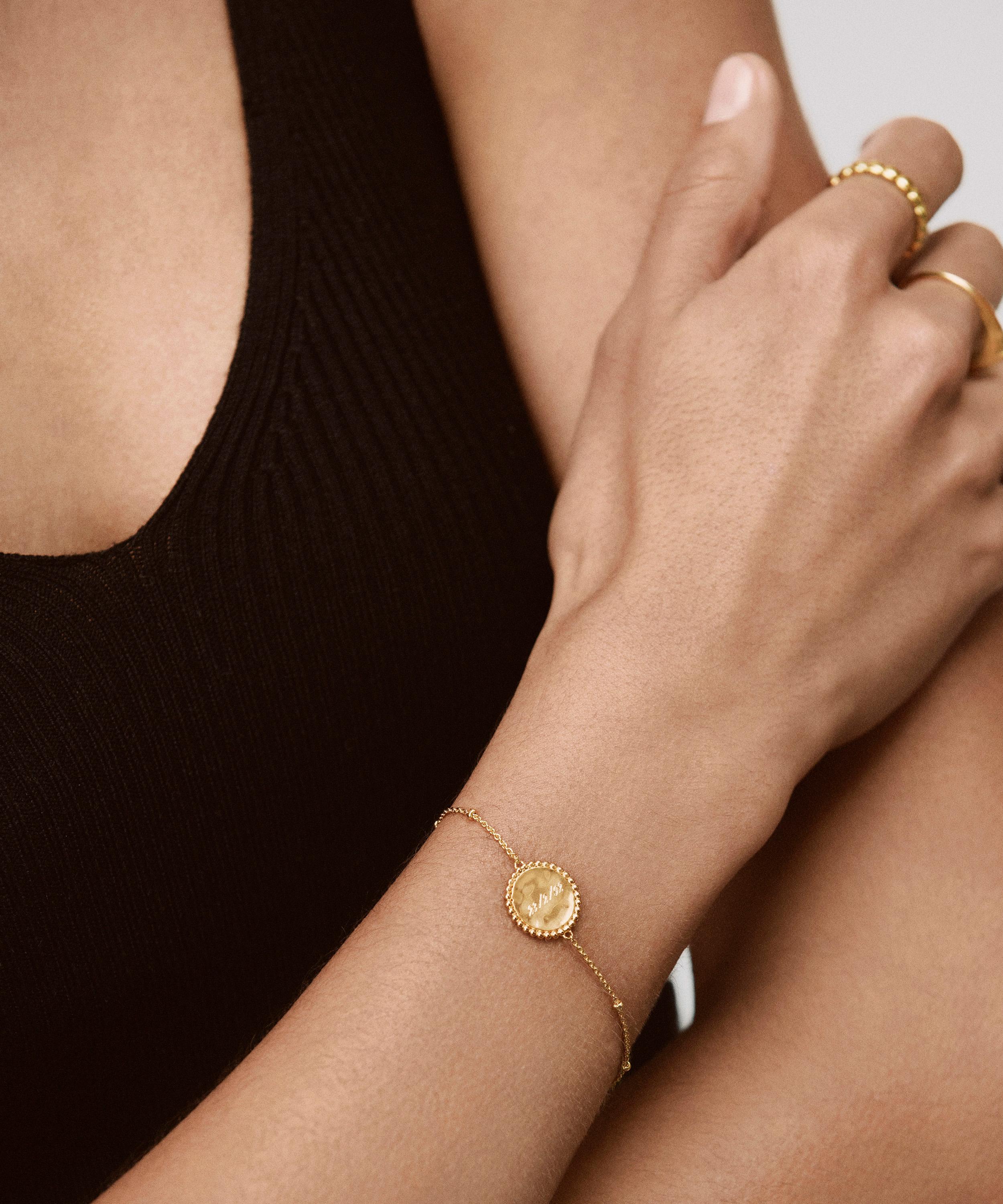 Crafted from sterling silver plated in 18ct gold vermeil, this bracelet features a delicate chain and disc pendant with hammered, beaded detailing. Style yours with several bracelets and the matching ring.