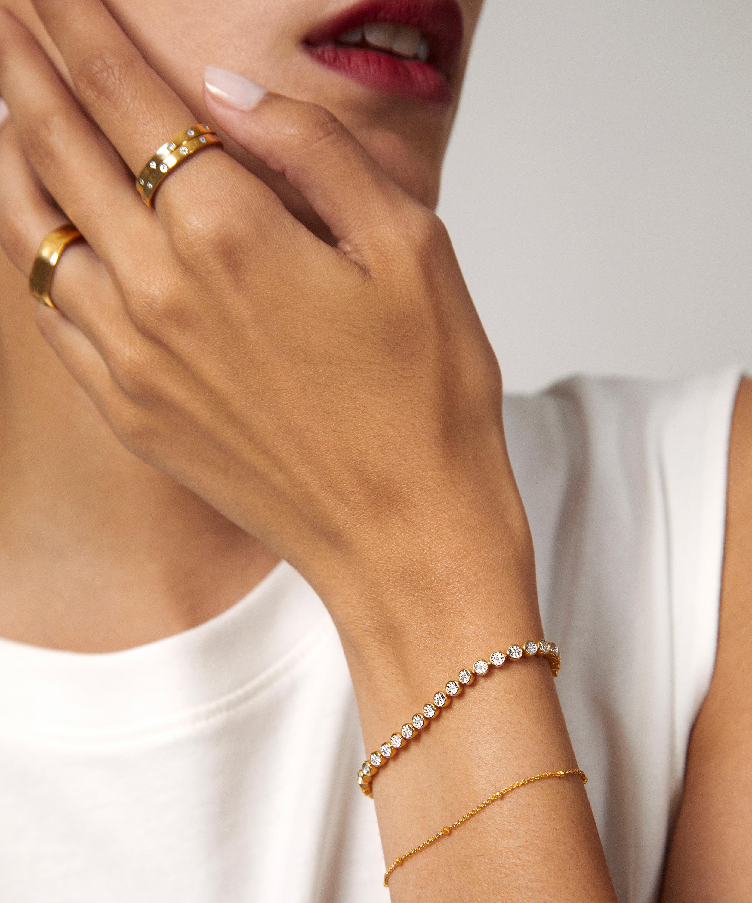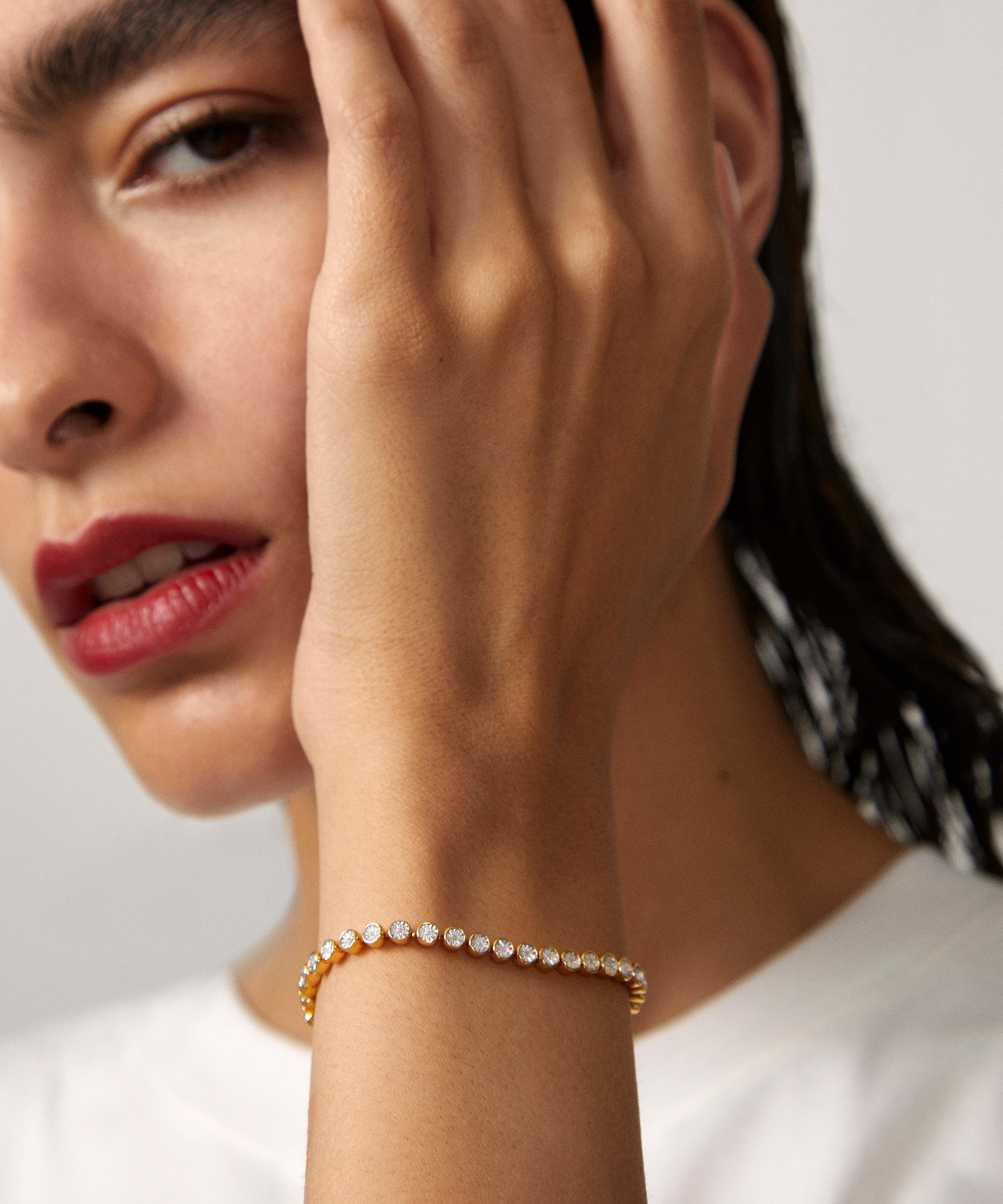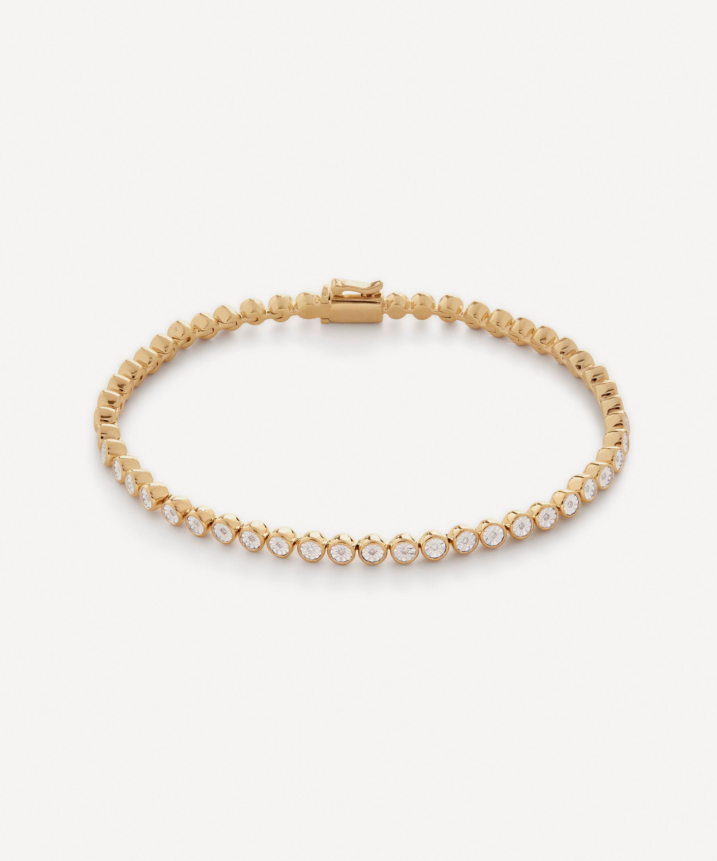 Handcrafted from sterling silver plated in 18ct gold vermeil, this vintage-inspired tennis bracelet is another essential piece from Monica Vinader – perfect for stacking. Boasting a timeless staple, this bracelet features an all-over brilliant-cut diamond design with a gold bezel cup setting surrounding each diamond.