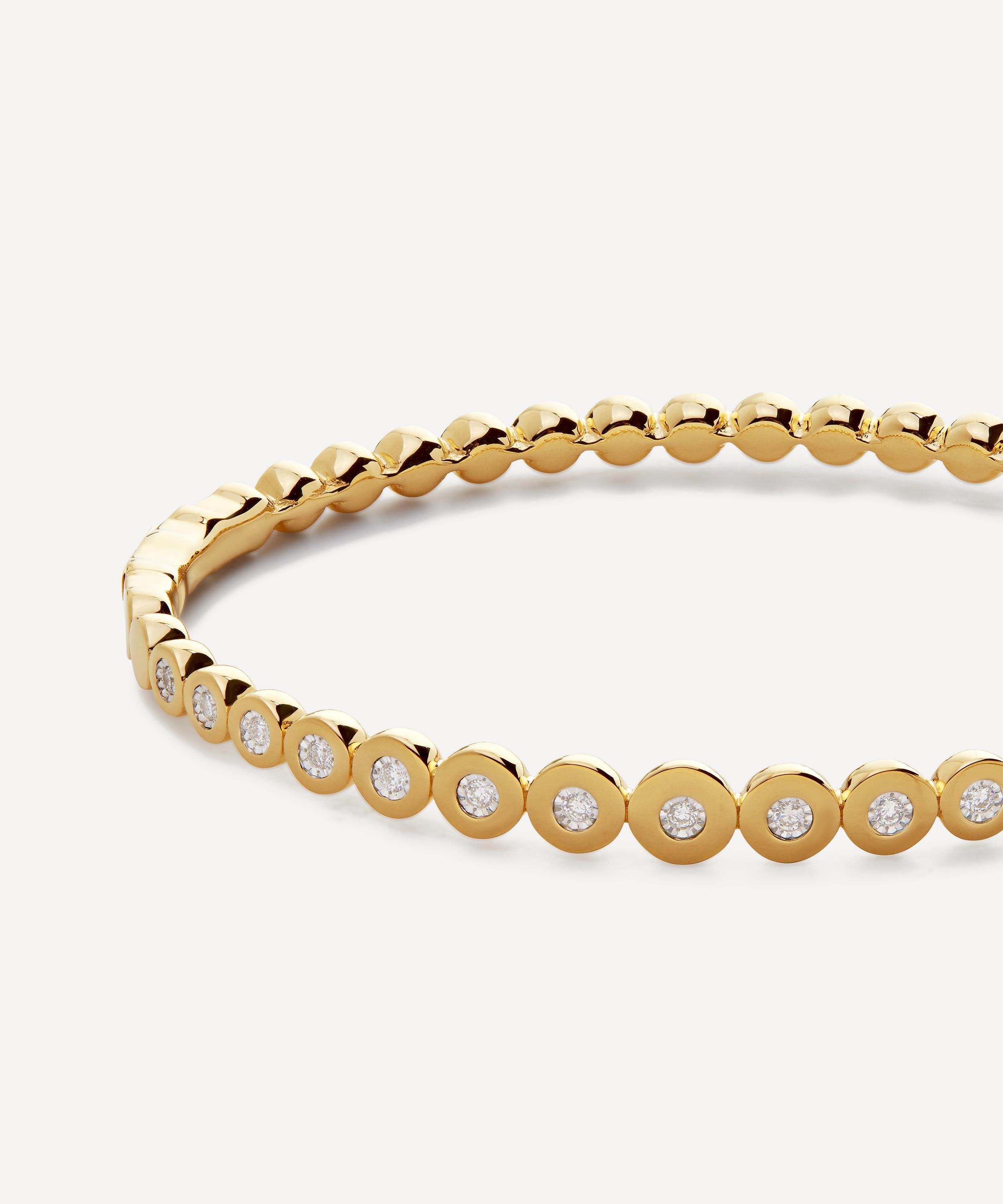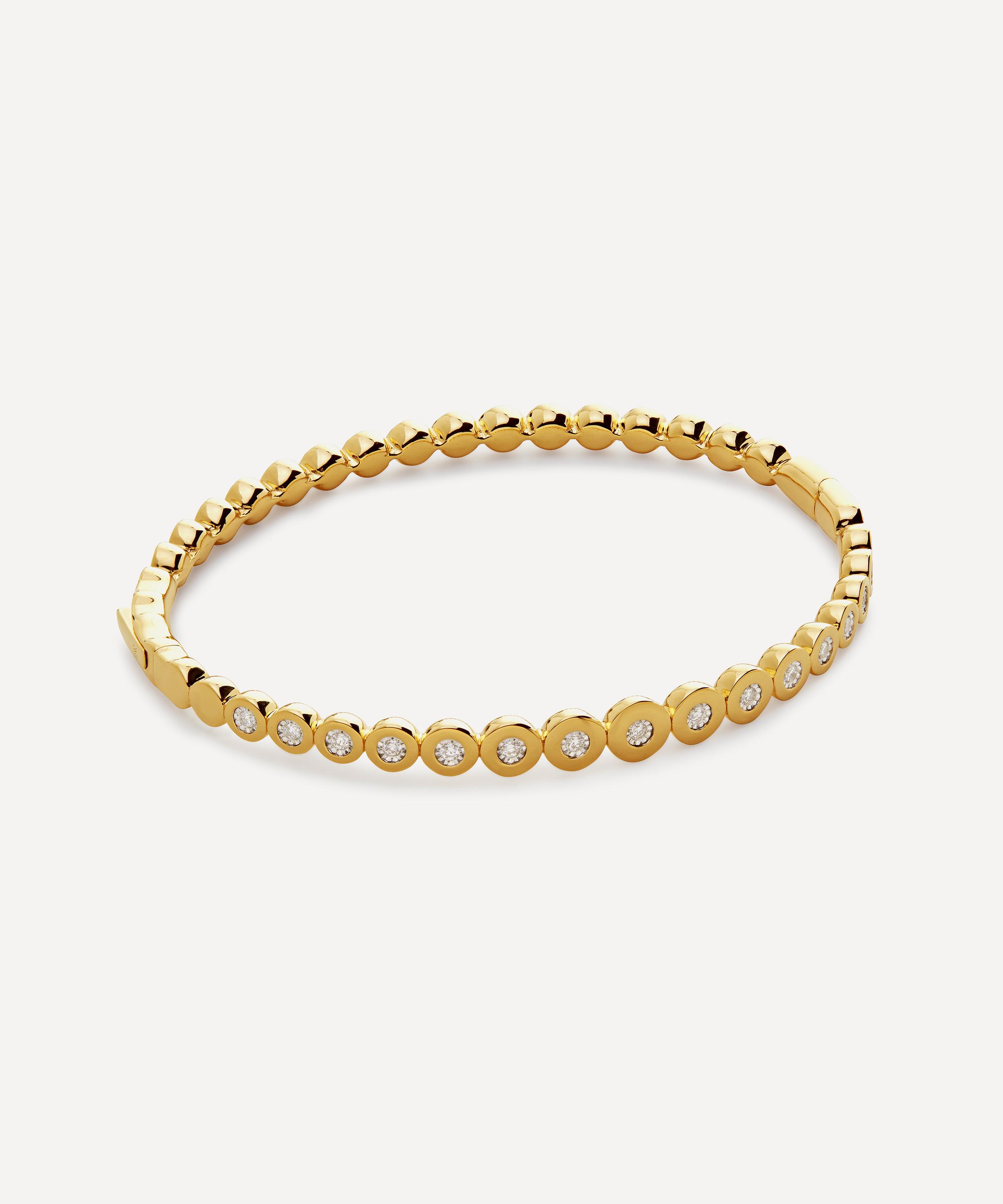 This sparkling diamond bangle bracelet from Monica Vinader is perfect for a quick finishing touch when you want to make a statement. Crafted from sterling silver plated in 18ct gold vermeil, it features hand-set lab-grown diamonds fitted into golden plates that gradually taper down.