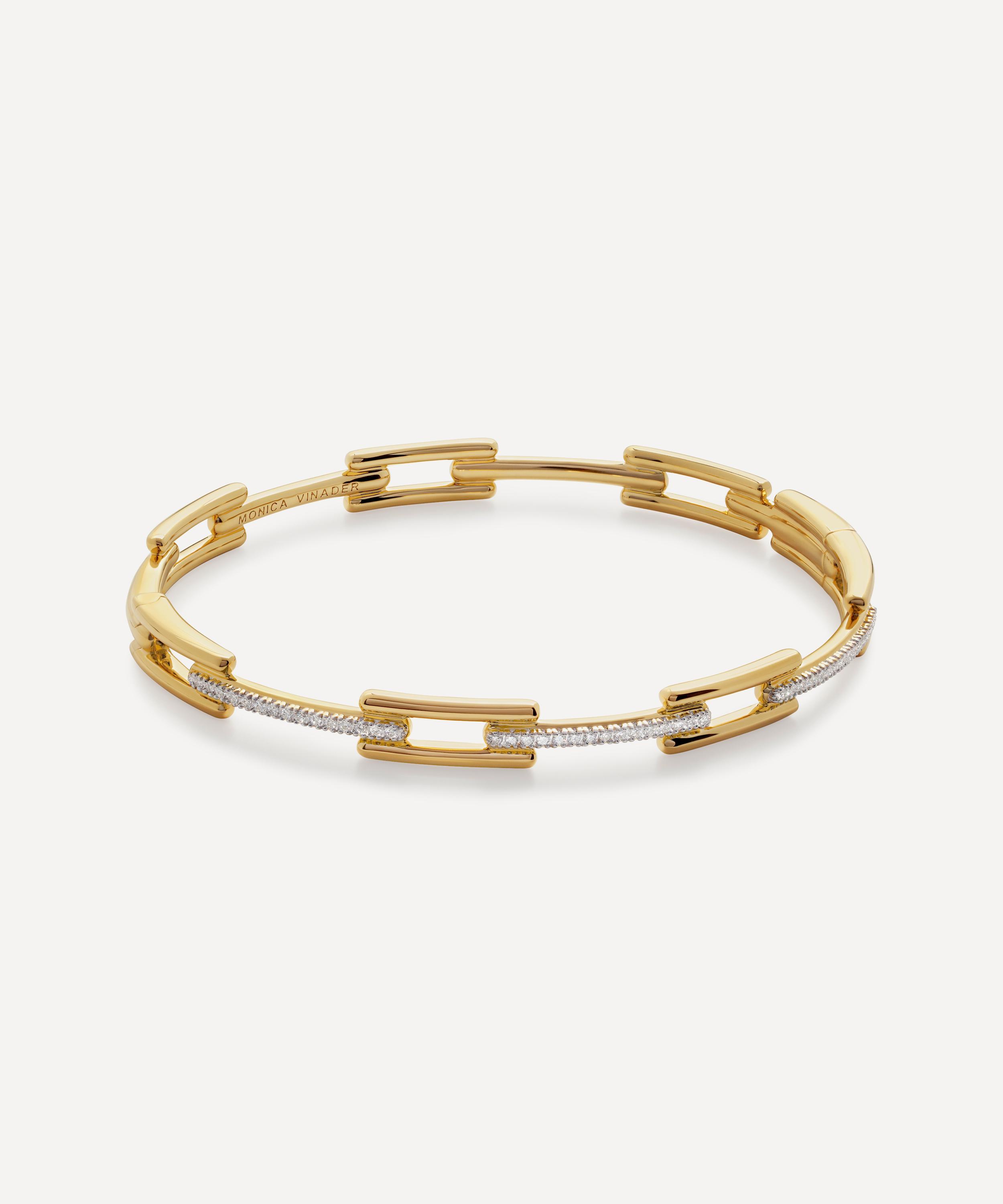 Crafted from sterling silver plated in 18ct gold vermeil, this bracelet takes inspiration from contemporary architecture, combining strong, clean lines and flowing curves for a modern and feminine finish. Perfect for stacking or styling alone, it features geometric links and pavé-set lab grown diamonds - try wearing it with several contrasting Signature bangles for a seamless stack of polished metal that will instantly compliment your attire.