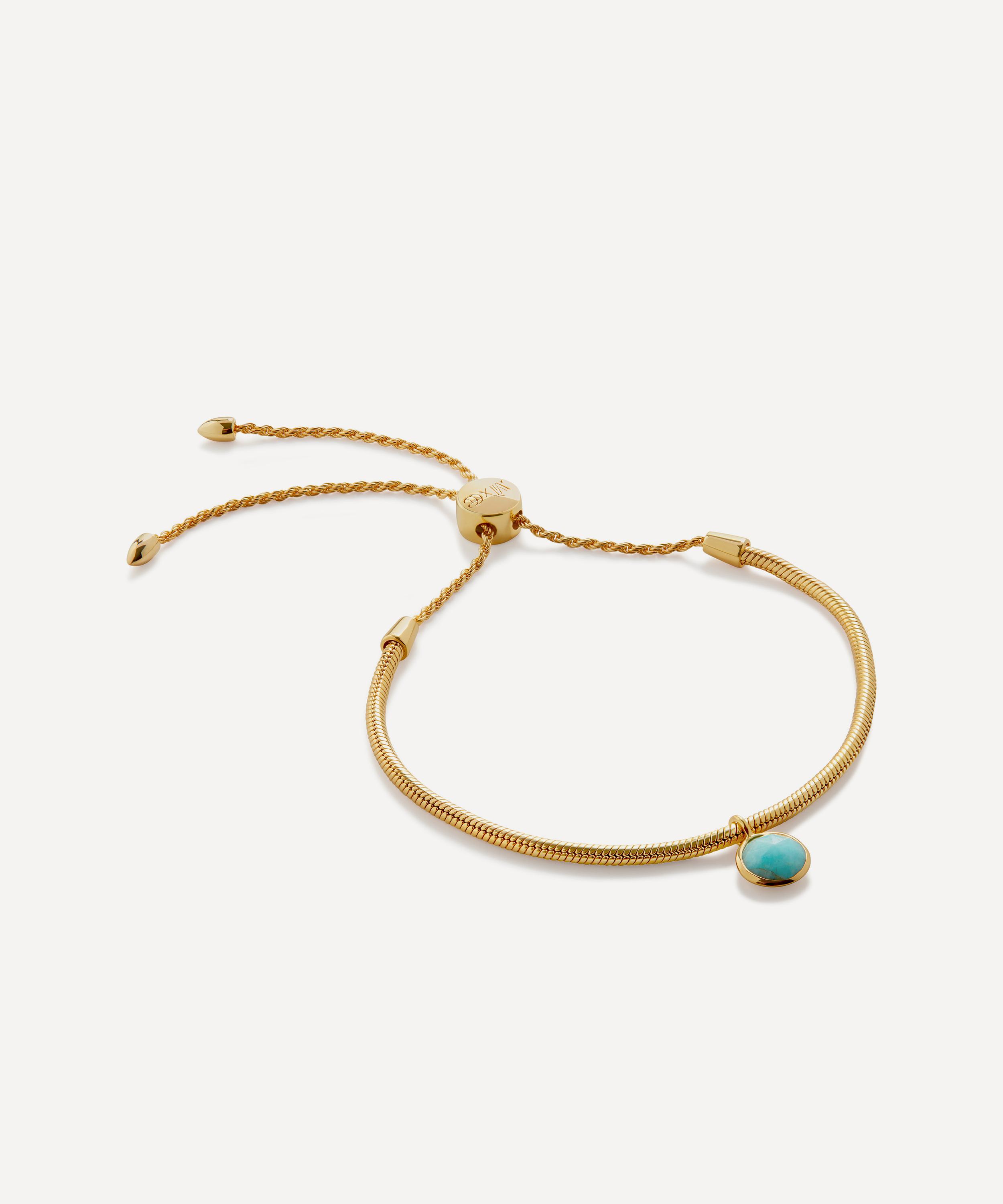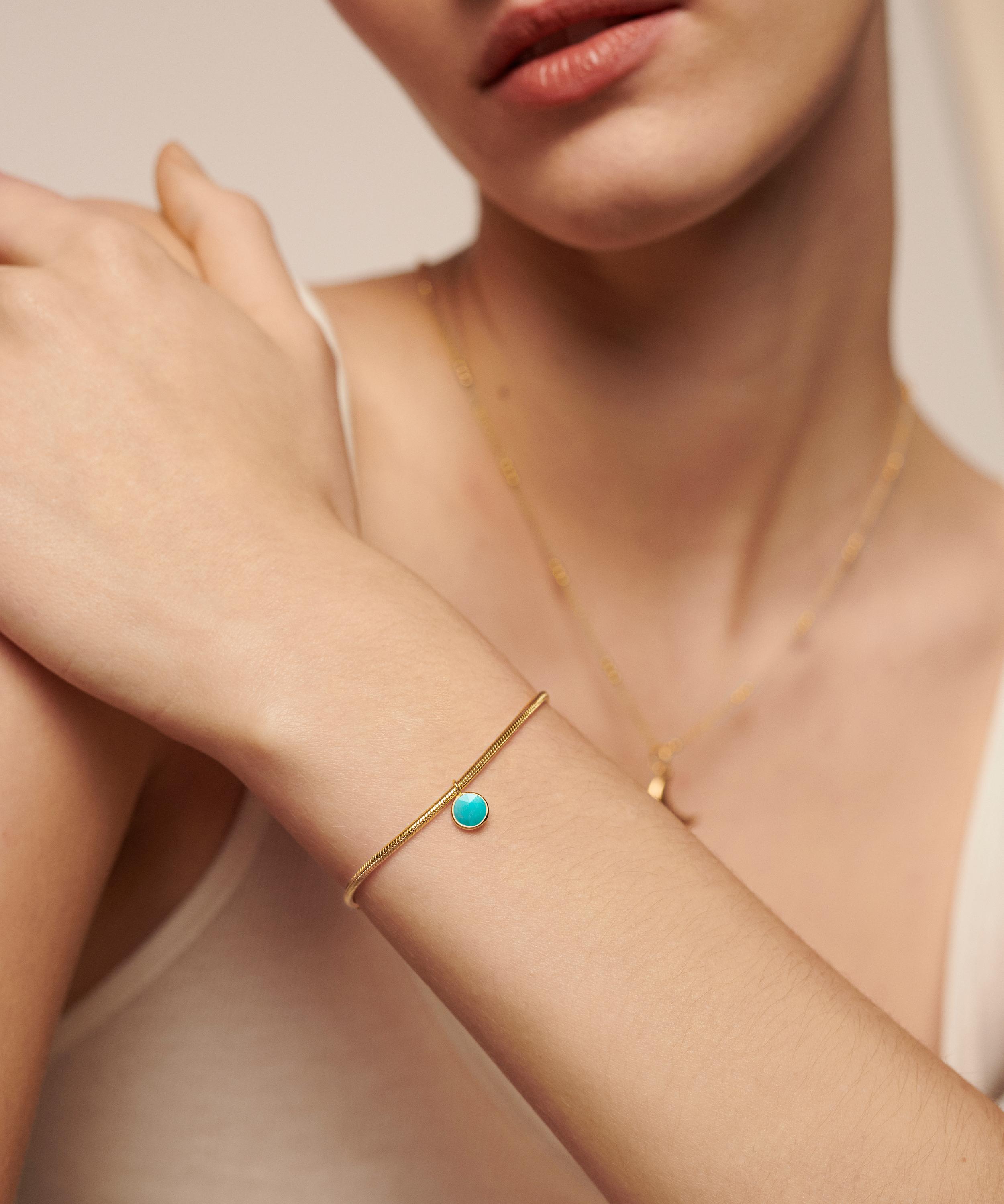 Crafted from sterling silver plated in 18ct gold vermeil, it features a round snake chain adorned with a vibrant dropped amazonite charm that captures the light from every angle, and is complete with a toggle slider to ensure the perfect fit.