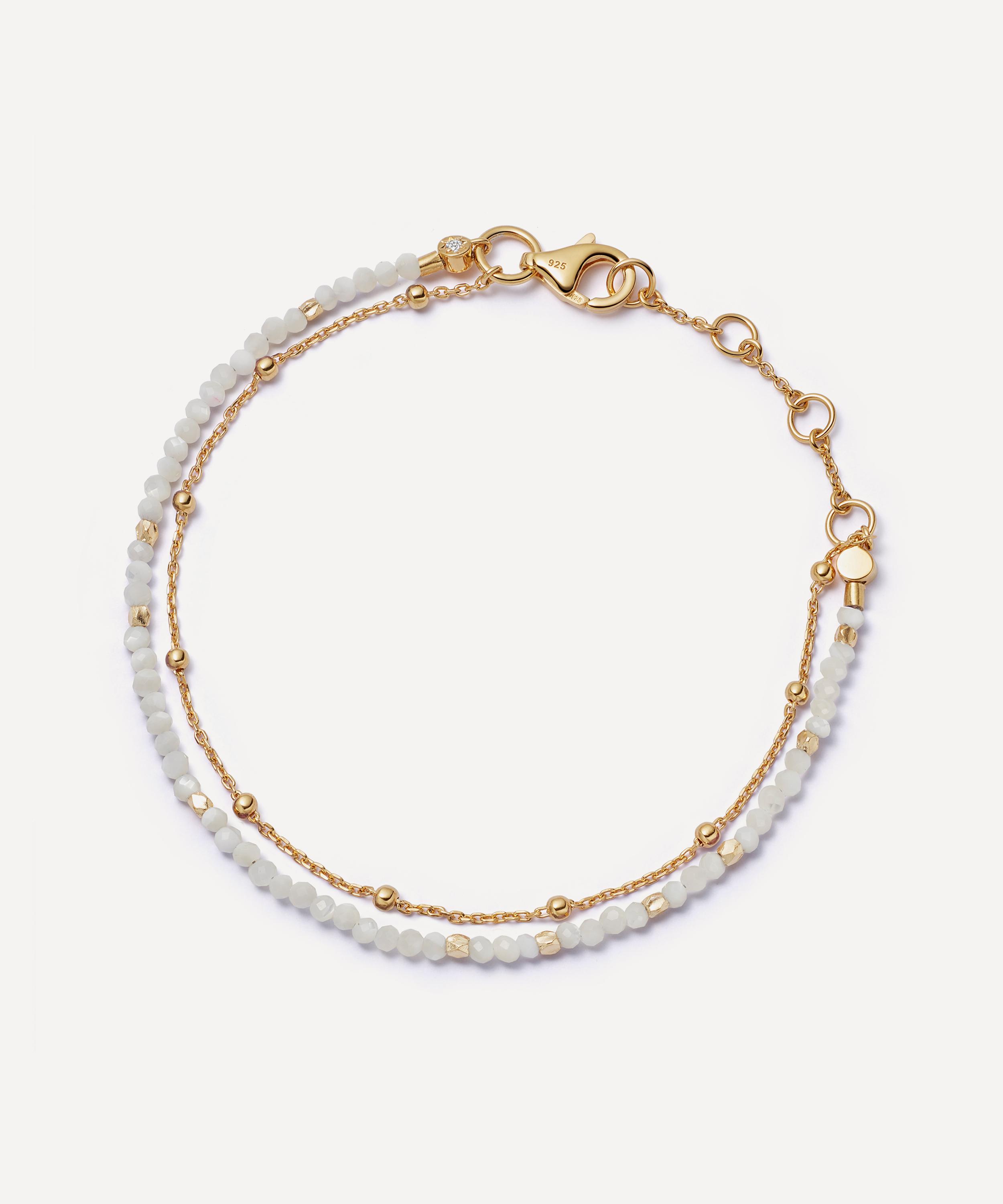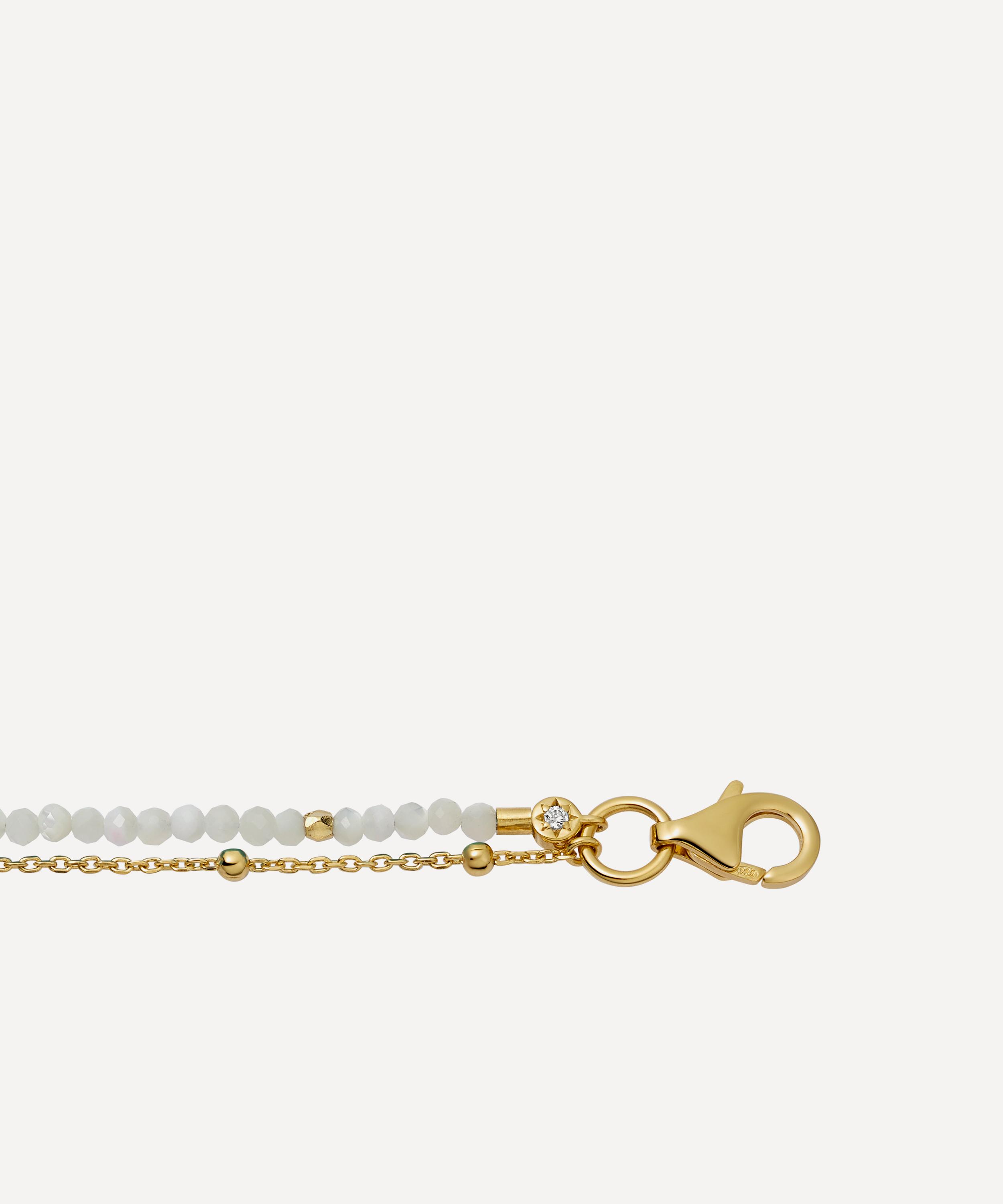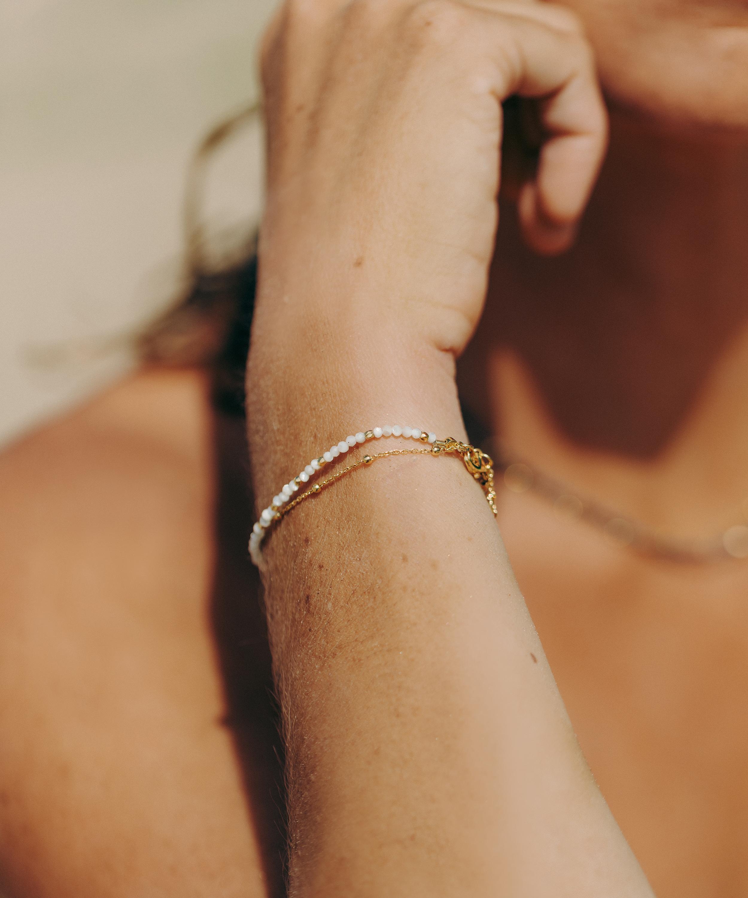 Crafted from sterling silver plated in 18ct gold vermeil, this bracelet features the collection’s signature double-layered chain, composed of a beaded trace chain and a string of hand-cut mother of pearl and golden nuggets. Stack this talismanic piece with several other Biography styles for a contemporary alternative to the traditional woven friendship bracelet.