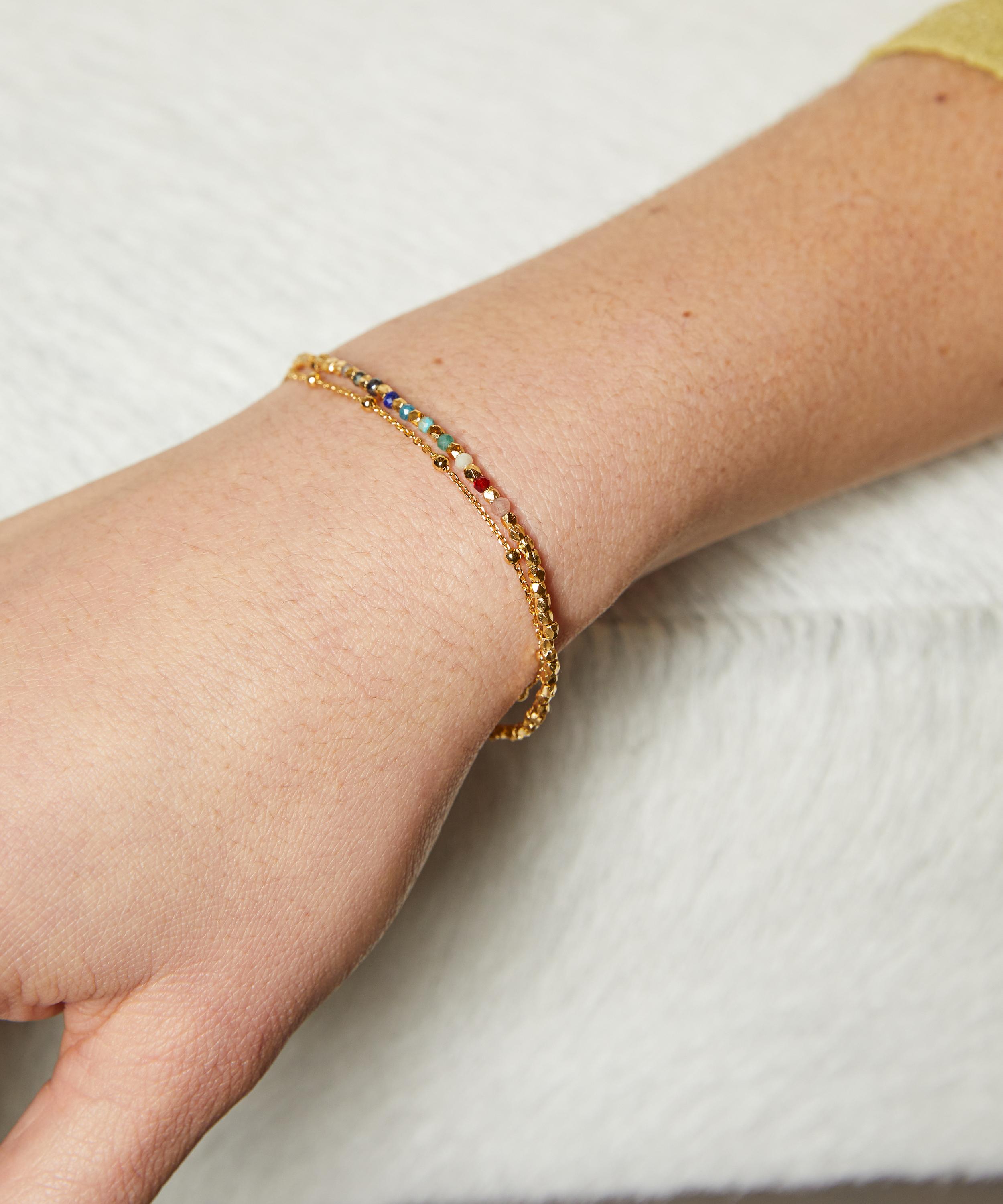 Crafted from sterling silver plated in 18ct gold vermeil, this bracelet features the collection’s signature double-layered chain, composed of a beaded trace chain and a string of hand-cut rainbow gemstones interspersed with golden nuggets. Stack this talismanic piece with several other Biography styles for a contemporary alternative to the traditional woven friendship bracelet.