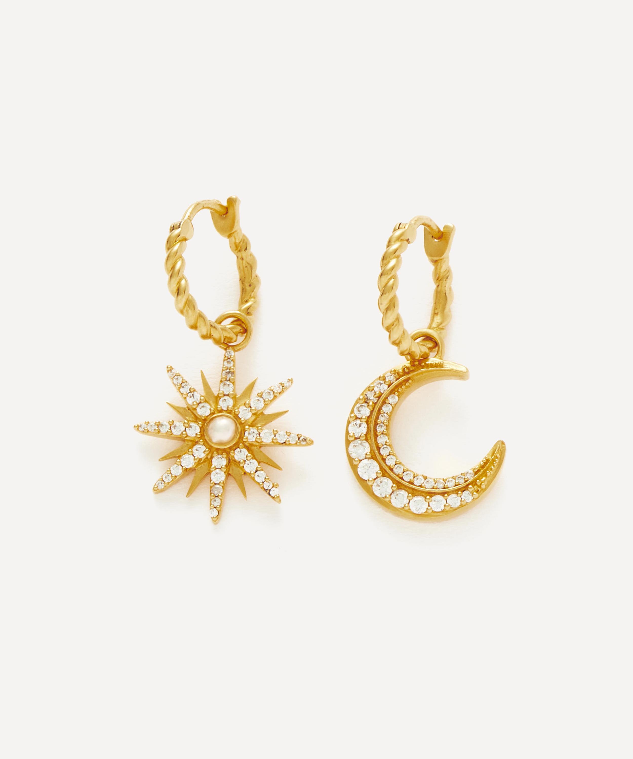 Embrace your individuality with the Moonlight Pearl hoop earrings from the Harris Reed x Missoma collaboration collection. Crafted from sterling silver plated in 18ct gold vermeil, this mismatched pair features twisted rope hoops, one characterised by a crescent moon drop, and the other by an intricate star drop adorned with a cabochon pearl – both charms are encrusted with sparkling pavé cubic zirconia.