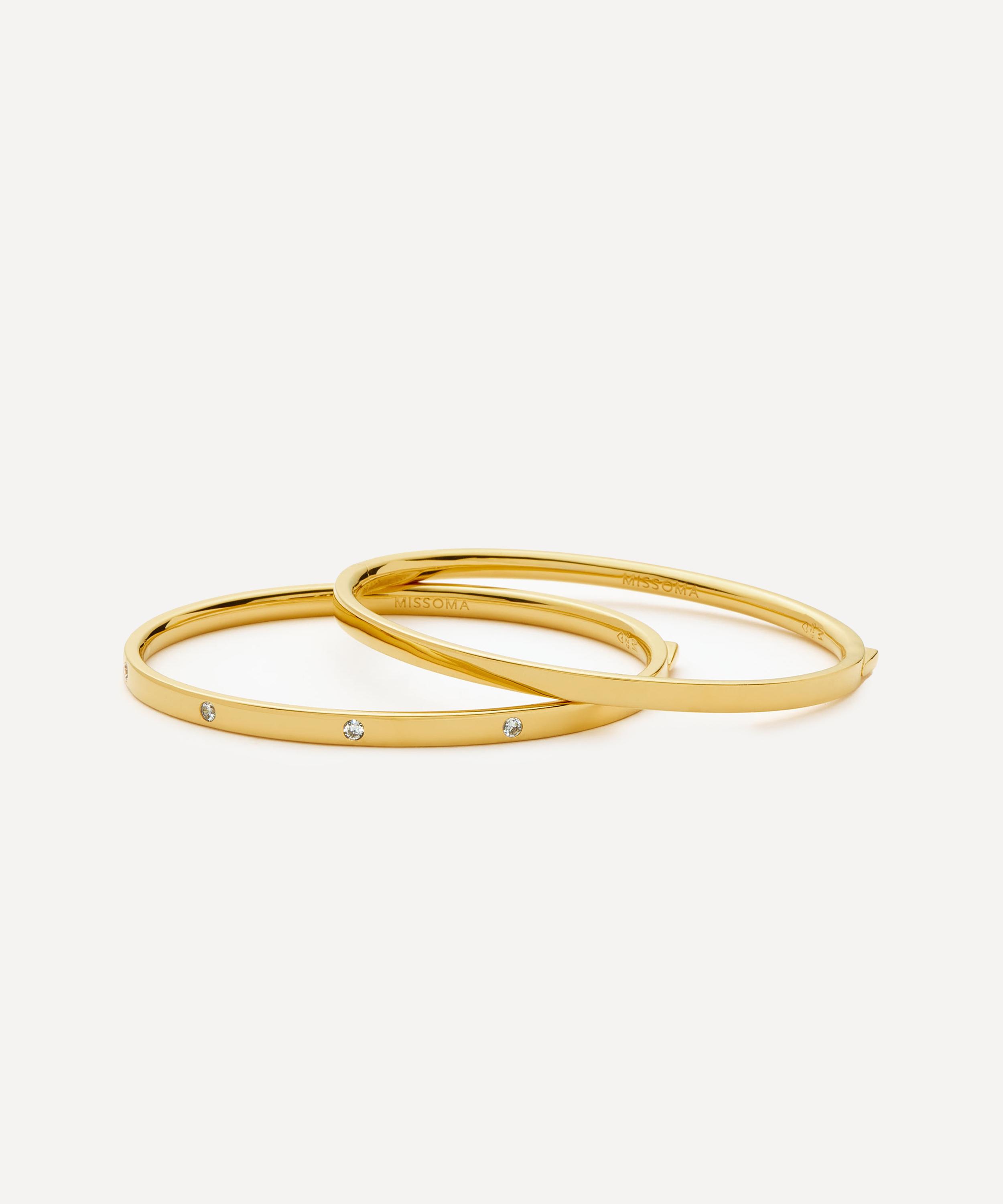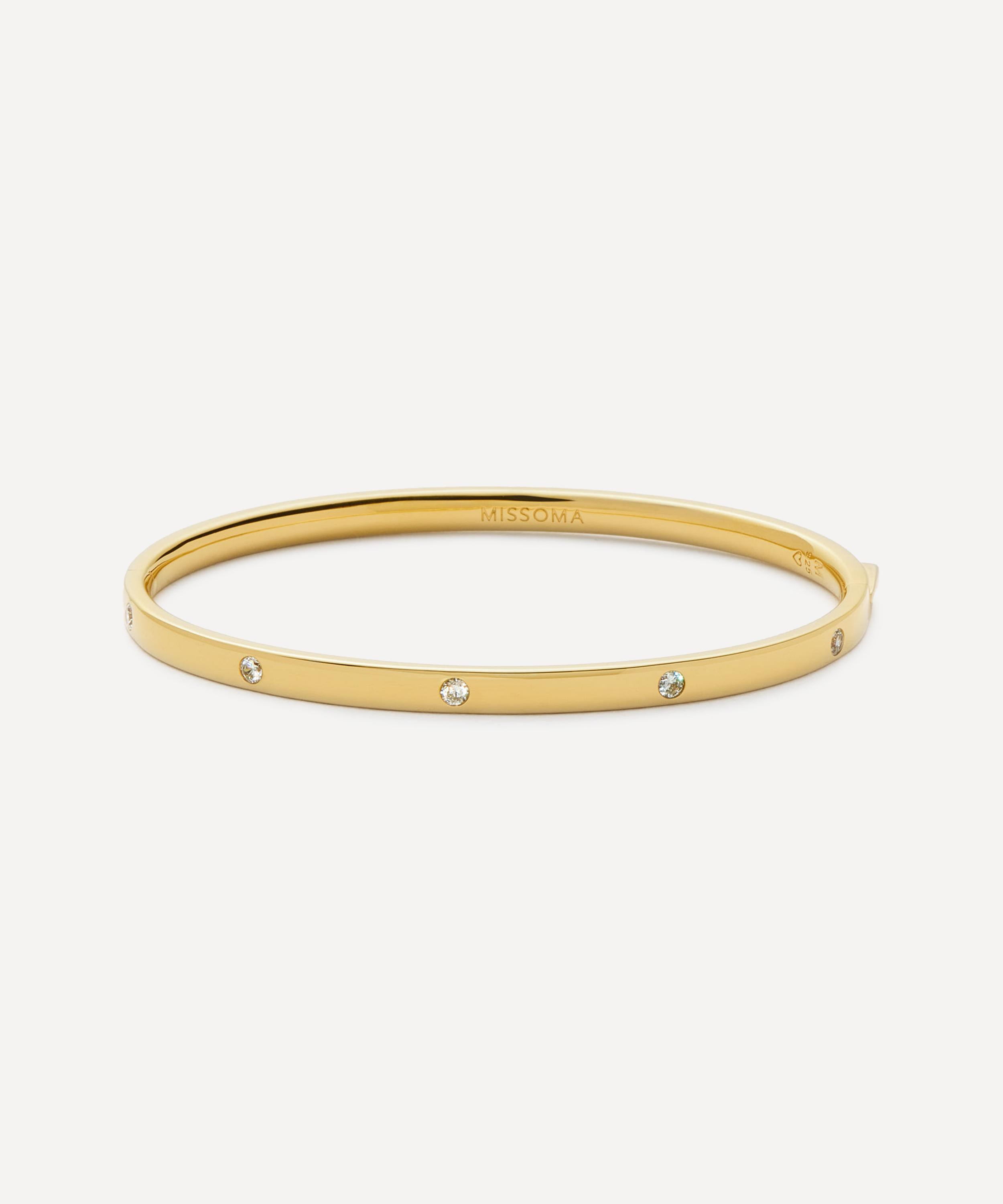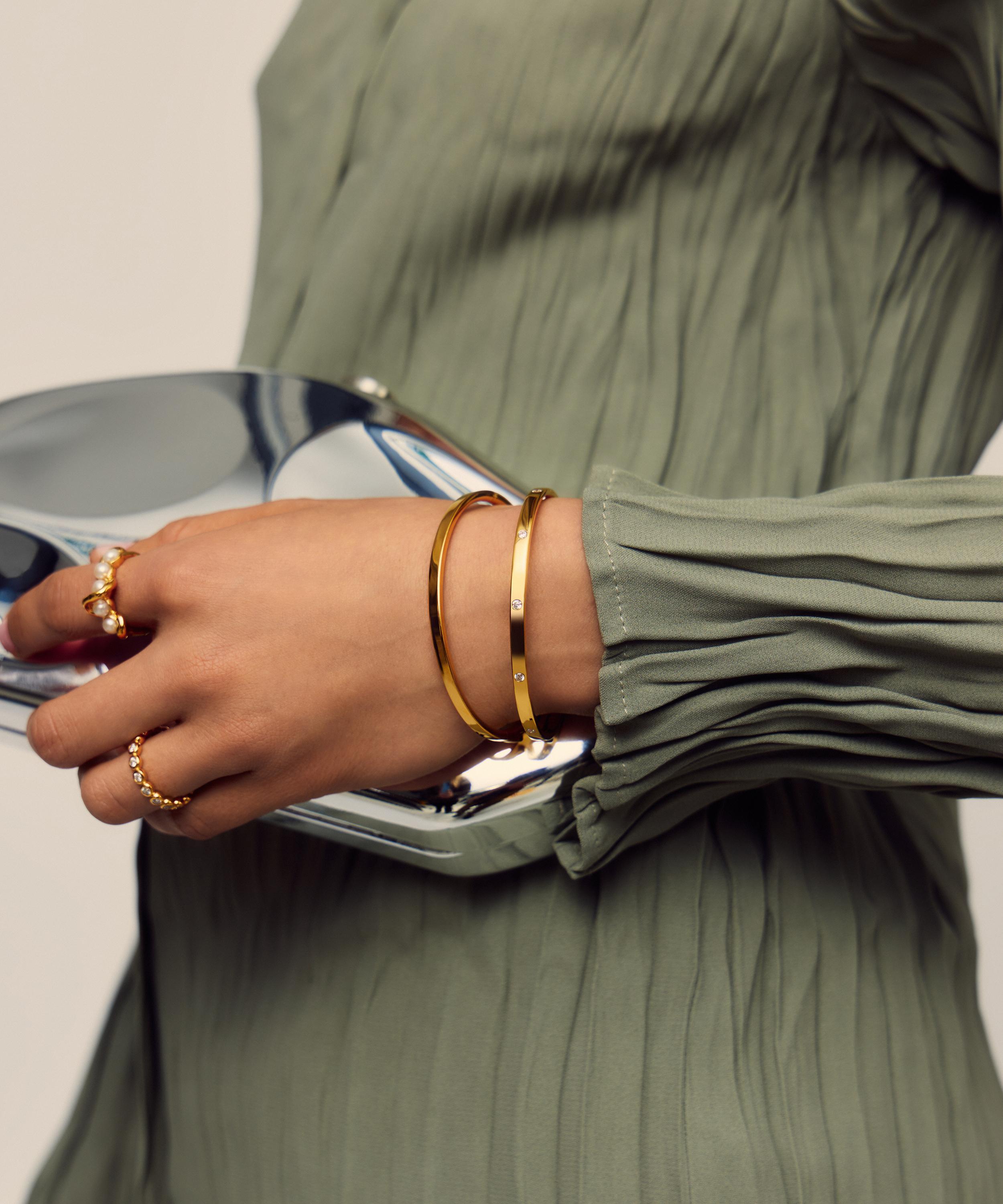 Enhance the appeal of everyday looks and occasion outfits with the Interstellar Hinged Bangle Bracelet from Missoma. Boasting an essential jewellery box staple, it features a hinged oval shape in sterling silver plated in 18ct gold vermeil, adorned with sparkling cubic zirconia stones. Due to its sleek and simple design it offers versatile wearability. Style it solo for a minimal look, or pair it with a mix of chains and additional cuff bracelets to create a bold wrist stack.
