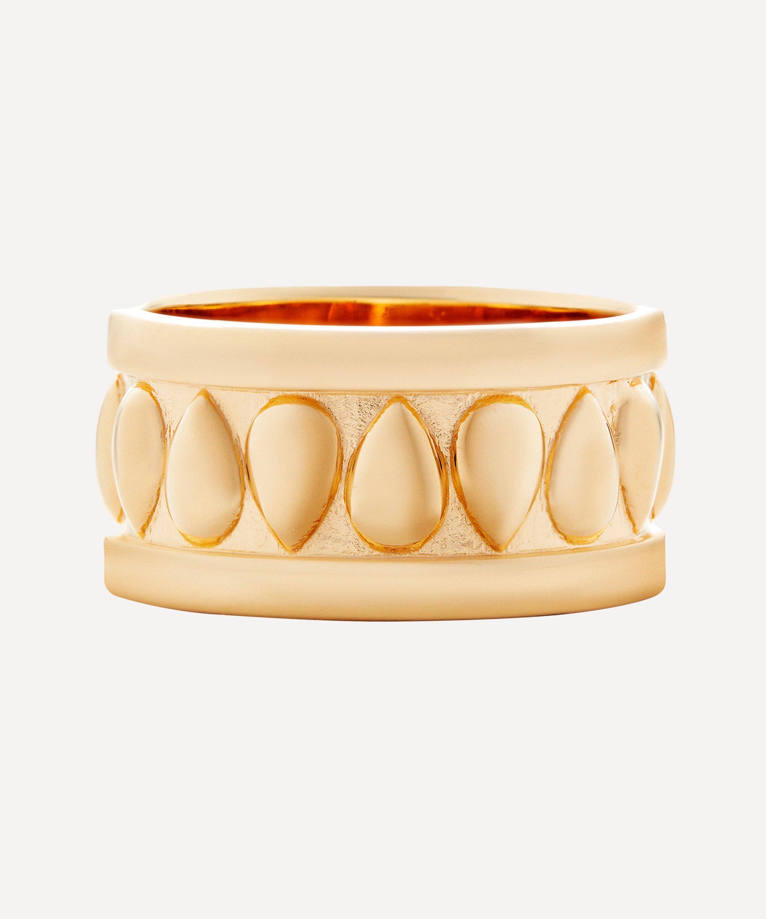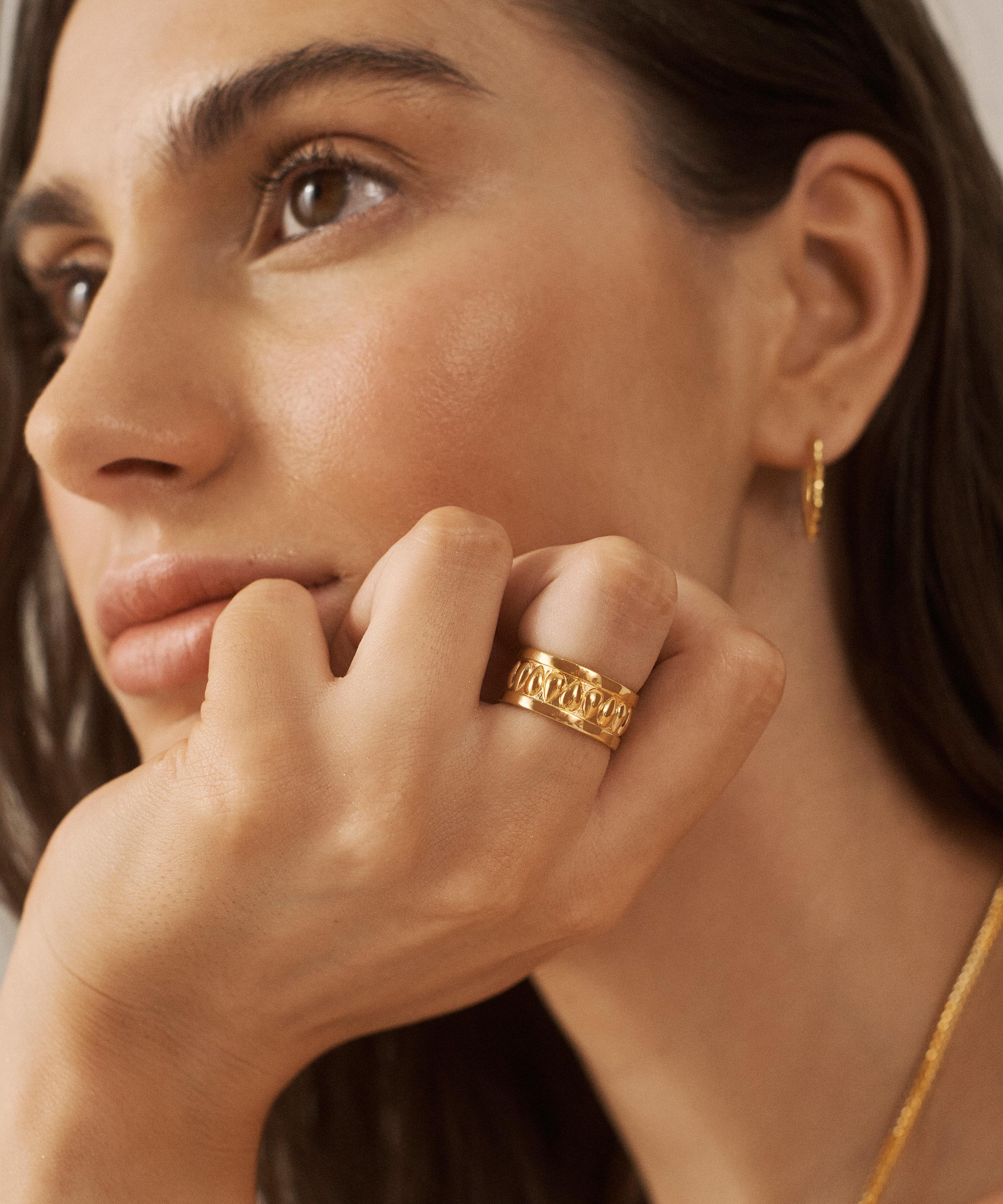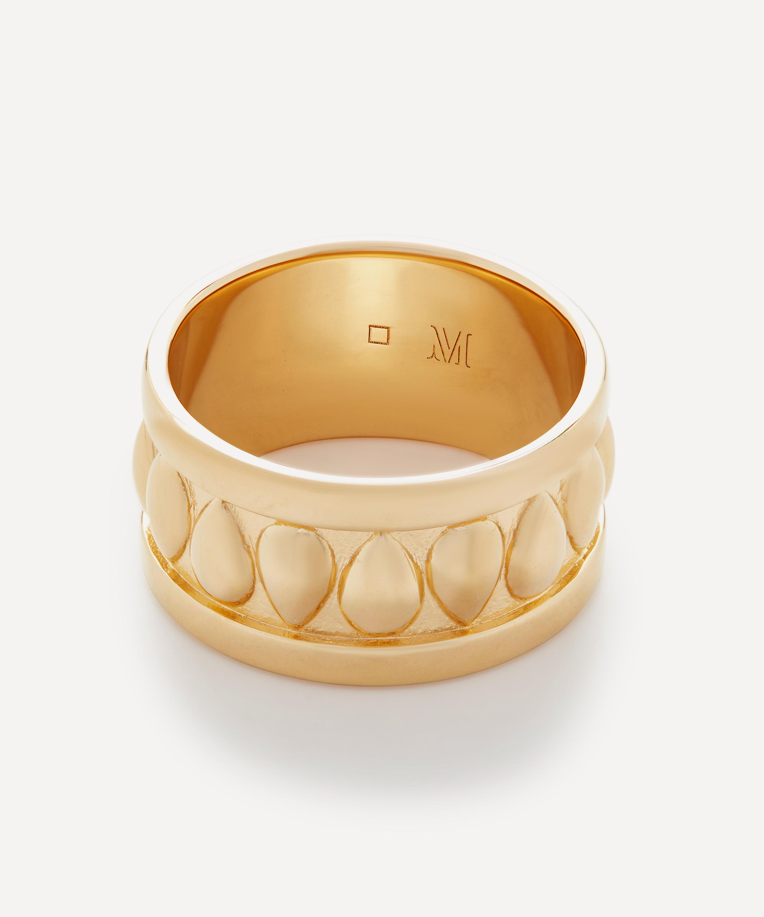 Give your regular line-up a transformation, include new styles and textures with this Juno band ring from Monica Vinader. Named after the goddess of protection, Juno, this ring features a wide silhouette adorned with a rich texture – inspired by an ancient Greek shield. Let it shine solo, or incorporate it into a stack.