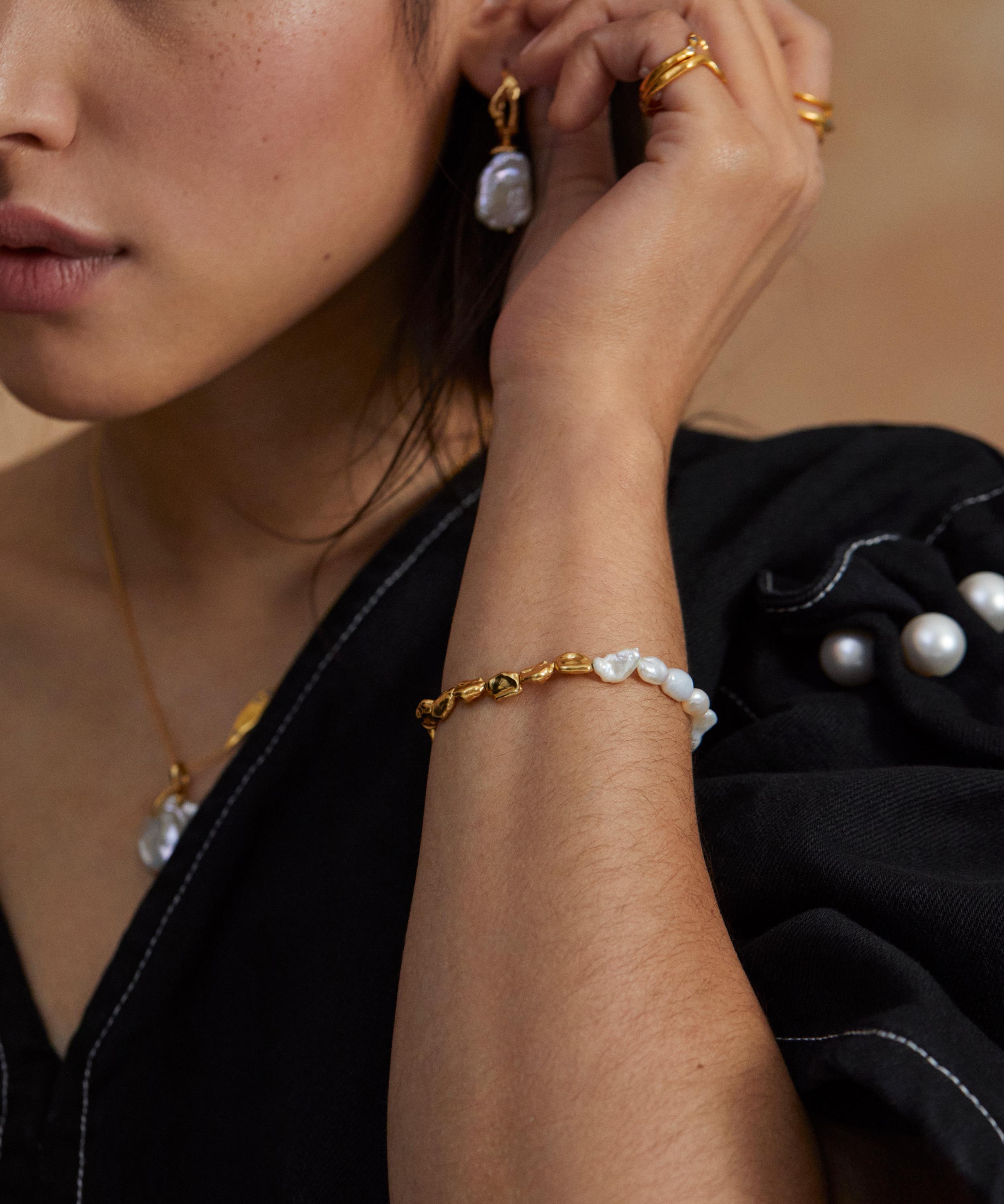 Give your jewellery collection an update with this opulent pearl bracelet from Monica Vinader. Crafted from recycled sterling silver plated in 18 carat gold vermeil, this bracelet features a striking, dual-tone design with lustrous Keshi pearls to one side, and contrasting gold-plated pearls to the other.