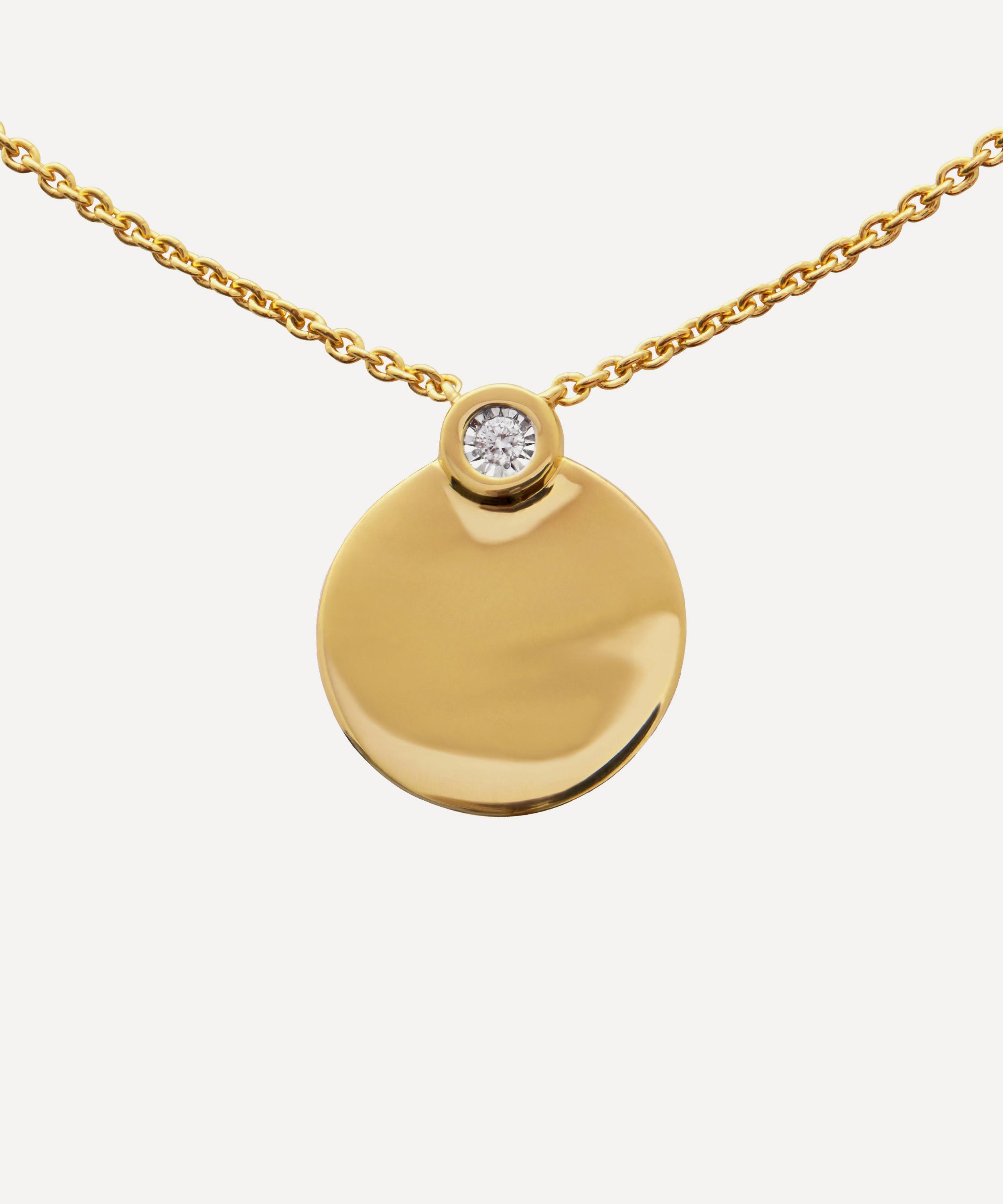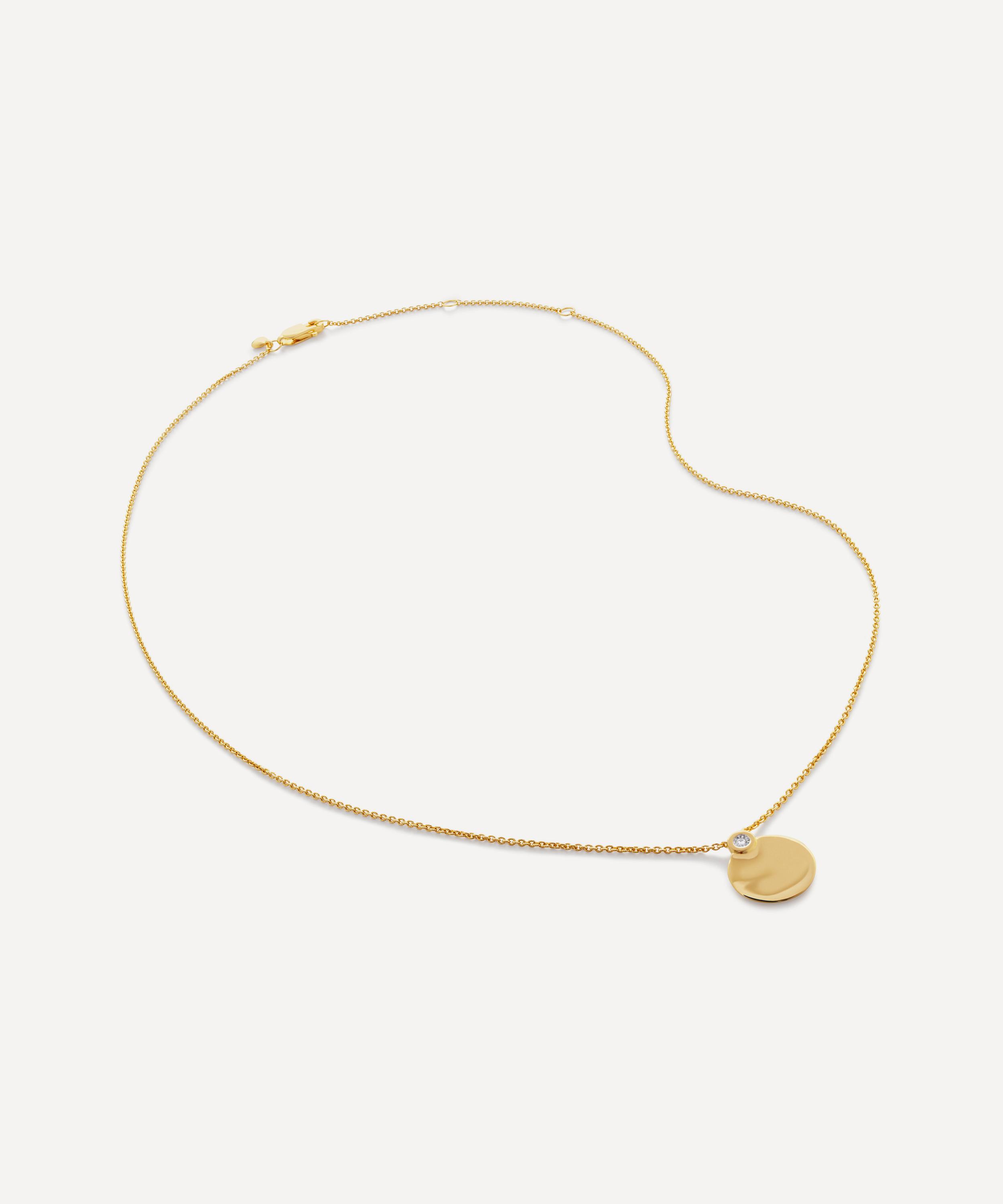 Exuding timeless elegance, this diamond pendant necklace from Monica Vinader will elevate your look with a truly unforgettable sparkle and radiance. Crafted from sterling silver plated in 18ct gold vermeil, it features a fine link chain and engravable coin pendant adorned with a round brilliant cut diamond. Style it with the matching bracelet and ring to complete your own collection or gift it to a loved one on a special occasion.