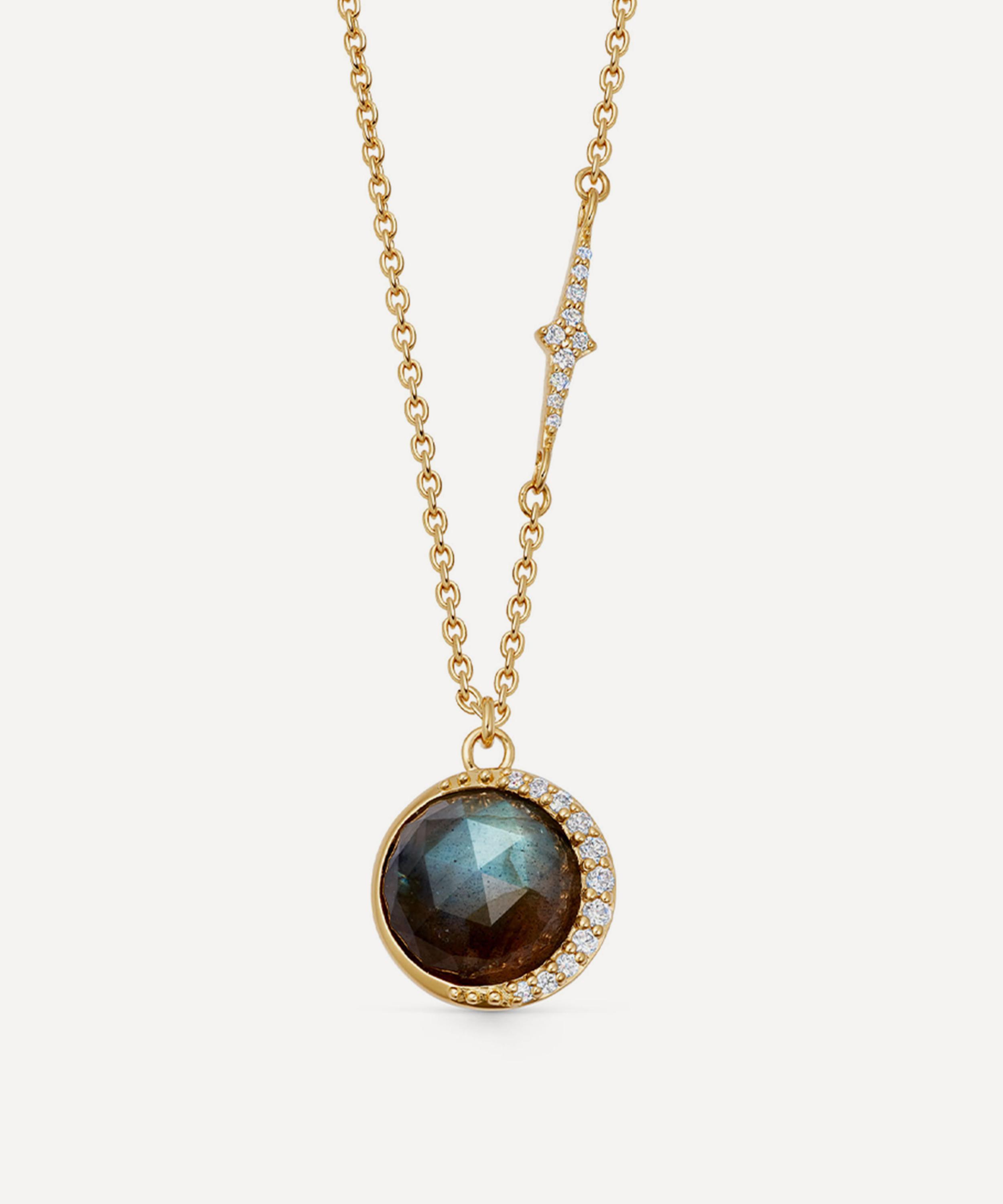 Crafted from sterling silver plated in 18ct gold vermeil, it features a round labradorite pendant – a symbol of transformation, embellished with white sapphire accents forming a crescent moon around the outer edge of the stone. Offering endless styling options, wear yours on its own, layer with multiple pendants, or pair it with the matching drop earrings for a coordinated look.