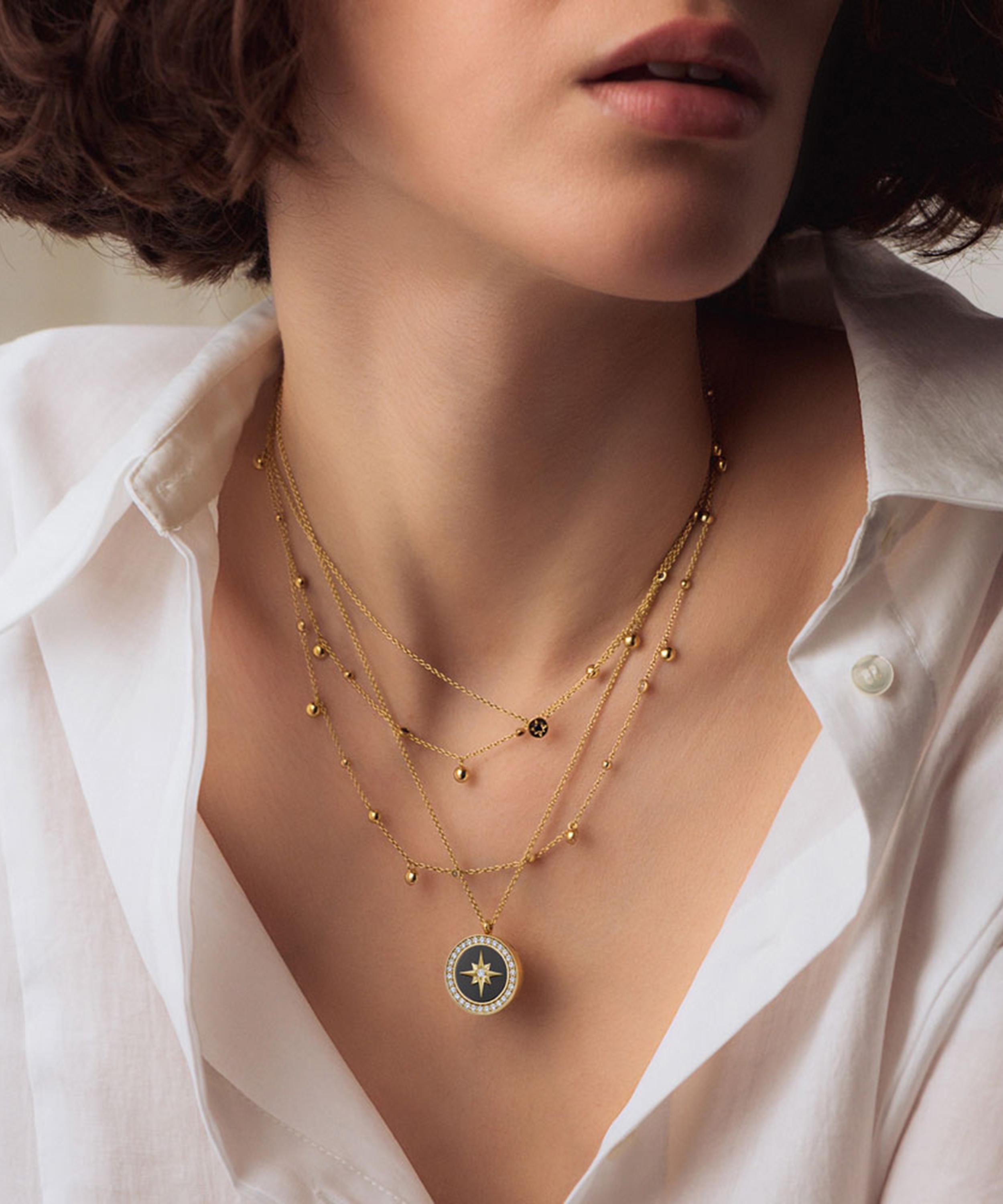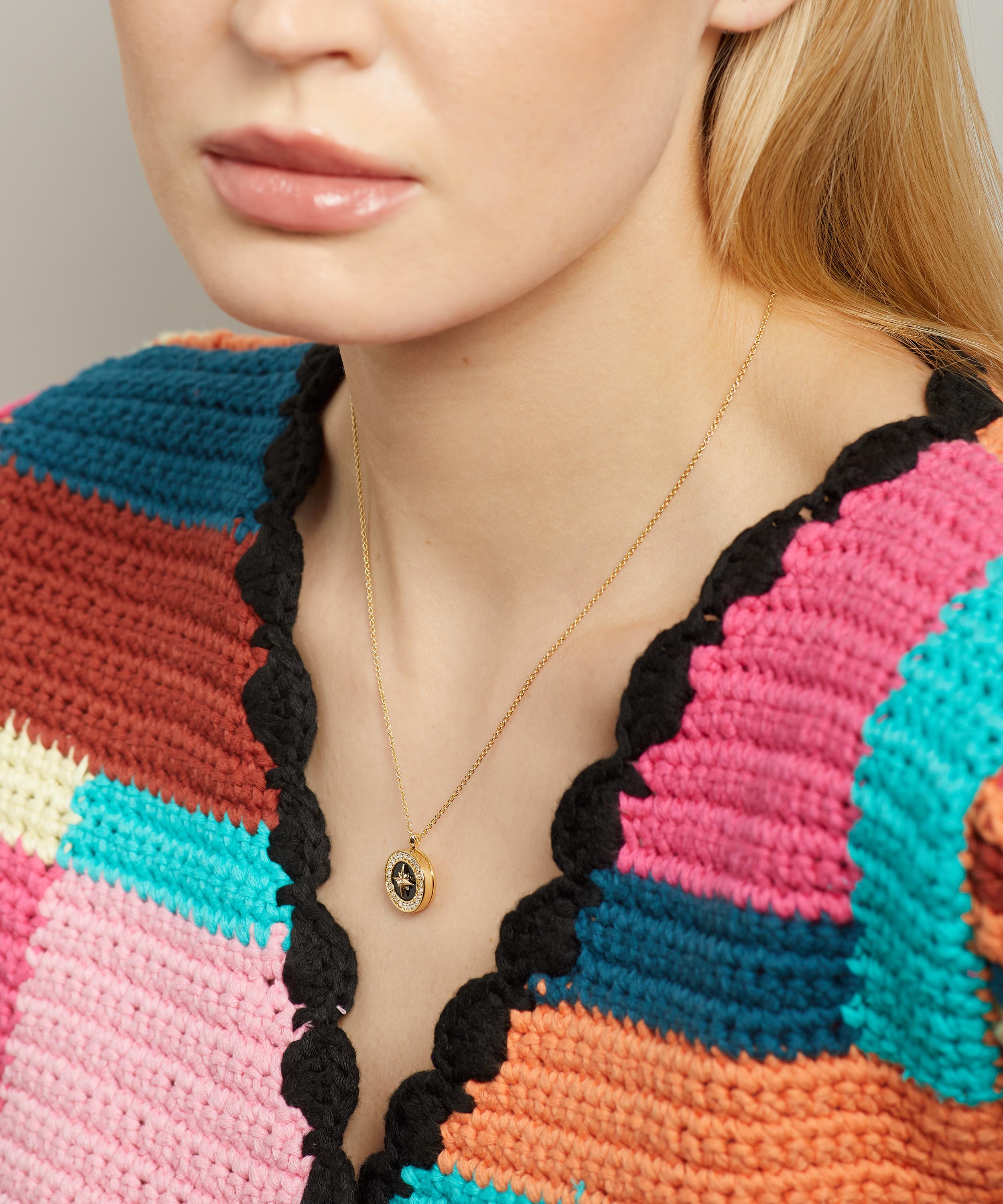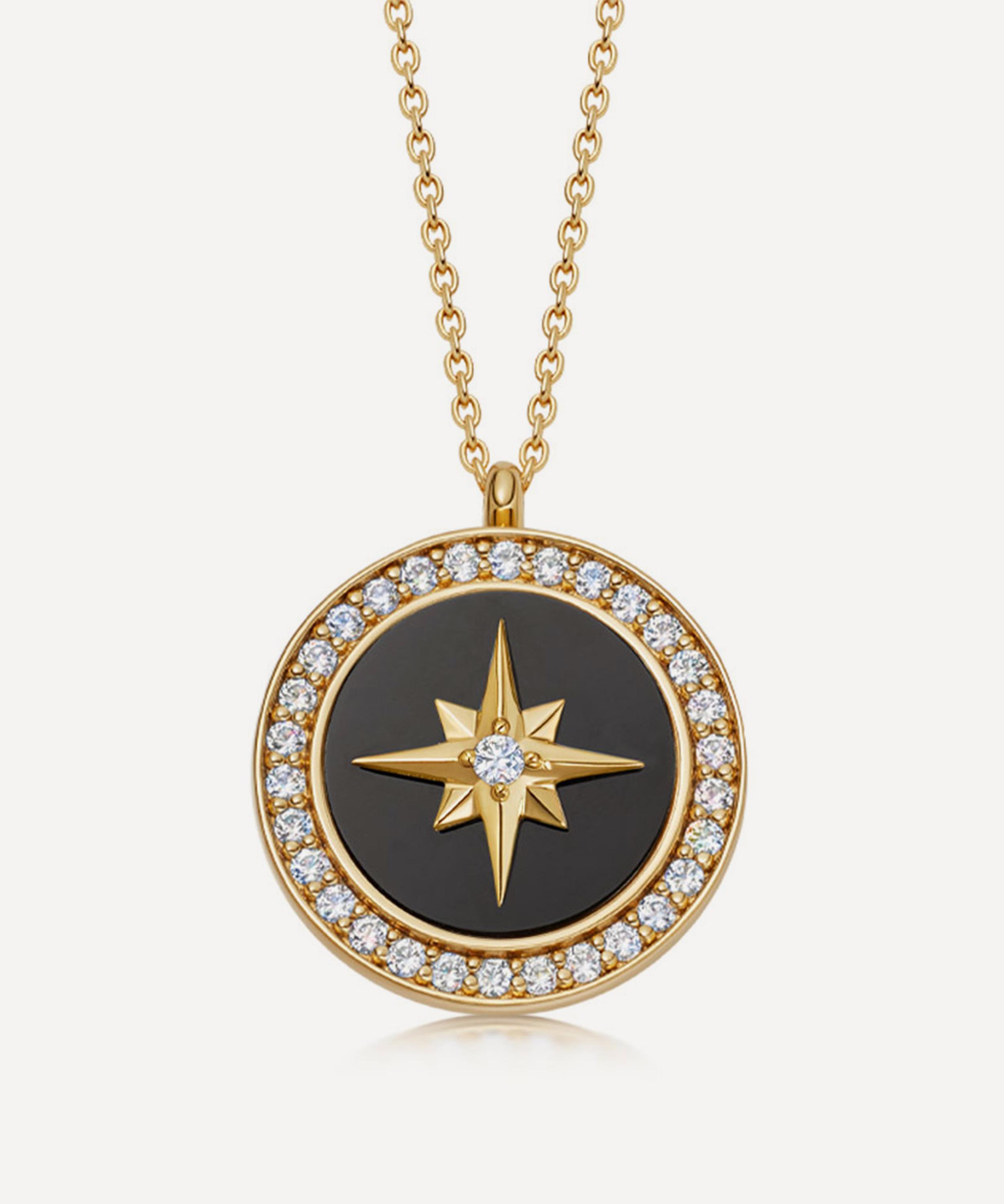 Inspired by the beauty of the North Star, this necklace features a large, compass-inspired locket detailed with a central sapphire set star motif surrounded by black onyx and encircled with glittering white sapphires. Perfect for gifting or adding to your own jewellery line-up, it can be worn alone, layered with other chains or styled with several coordinating pieces from the collection for a bold, contemporary take on a classic celestial motif.