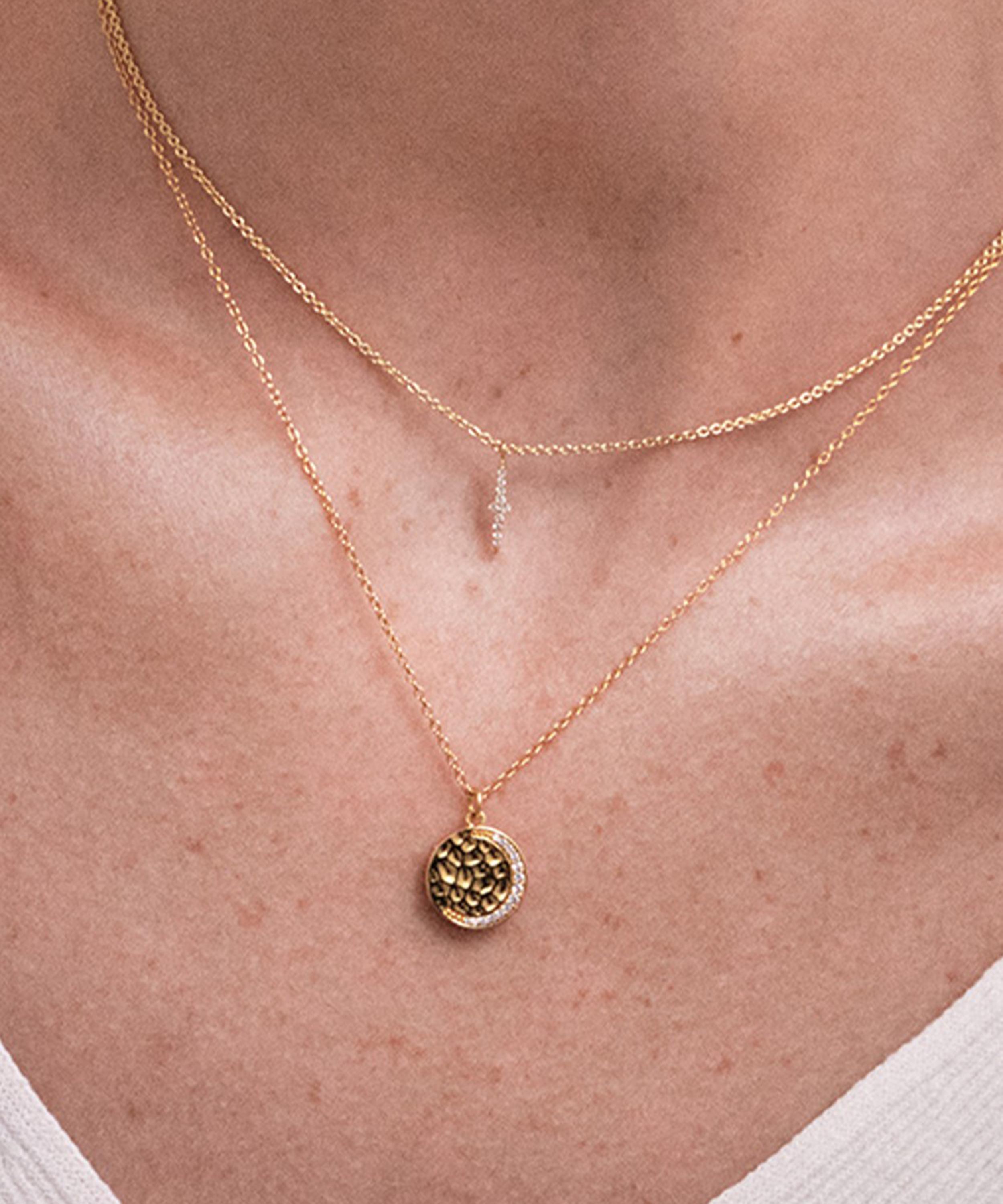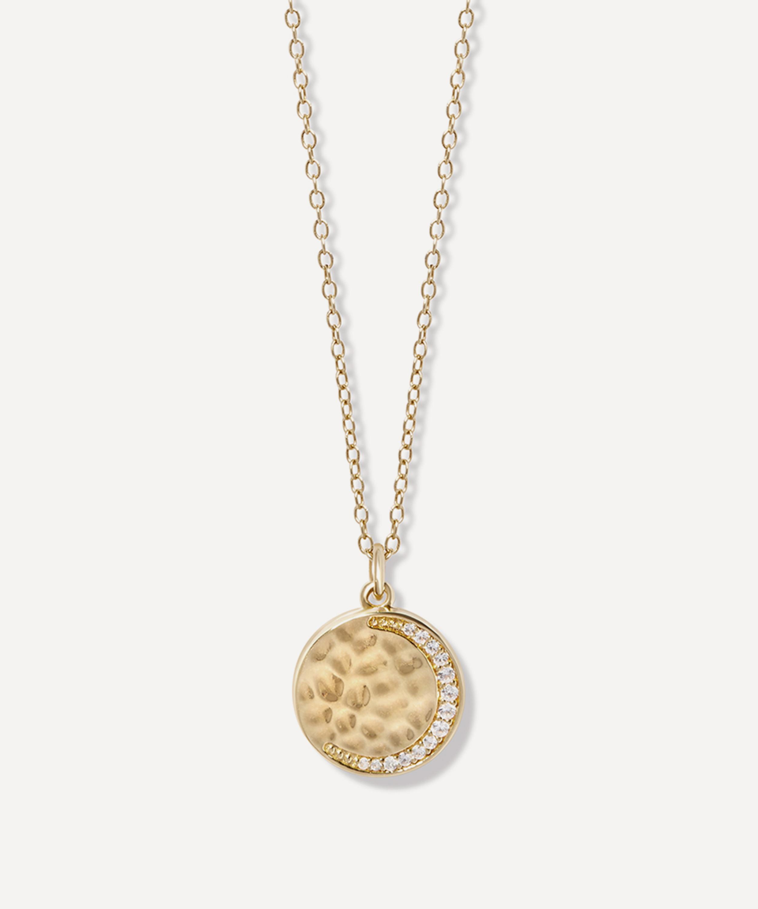 Crafted from sterling silver plated in 18ct gold vermeil, it features a fine trace chain and a round locket, beautifully embellished with a crescent moon motif outlined in white sapphire stones. Boasting a personal piece to hold treasured memories, wear yours on its own, layer it with other necklaces, or gift it to a loved one.